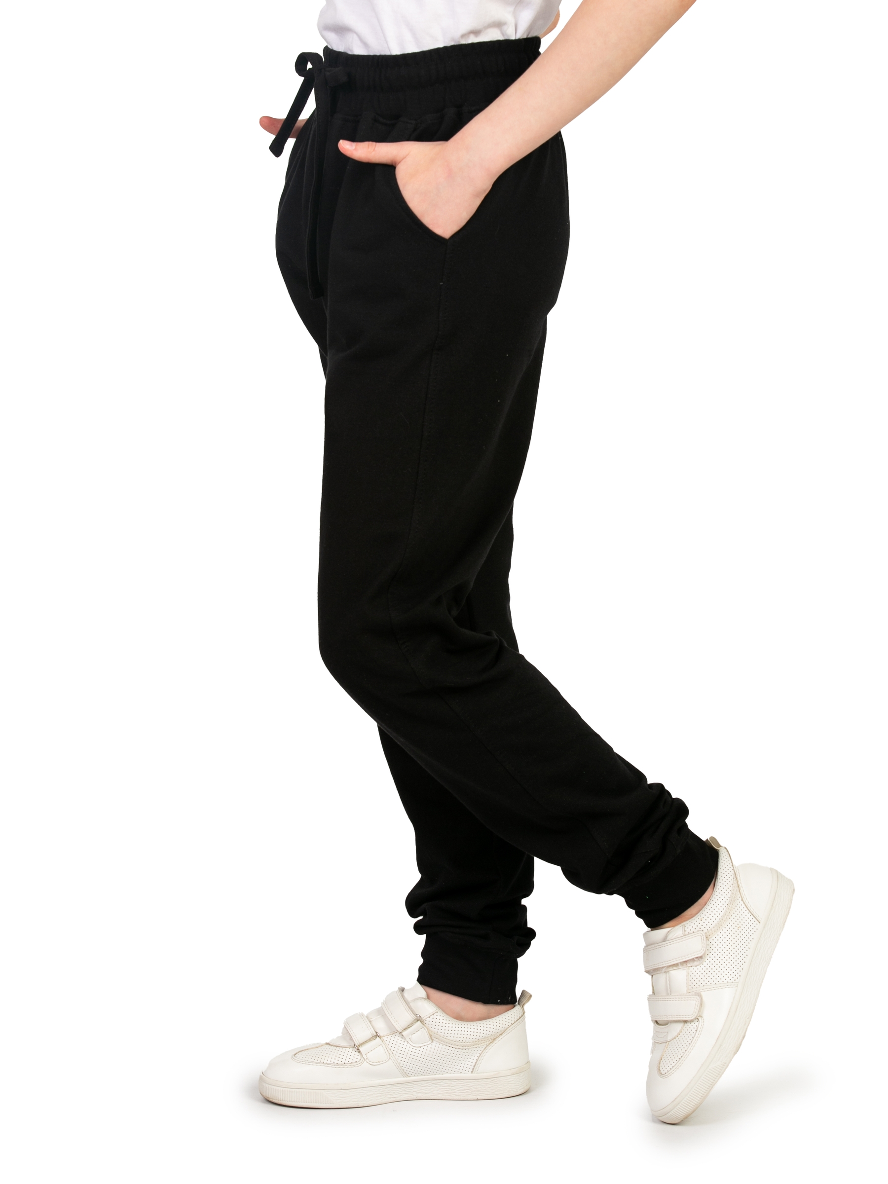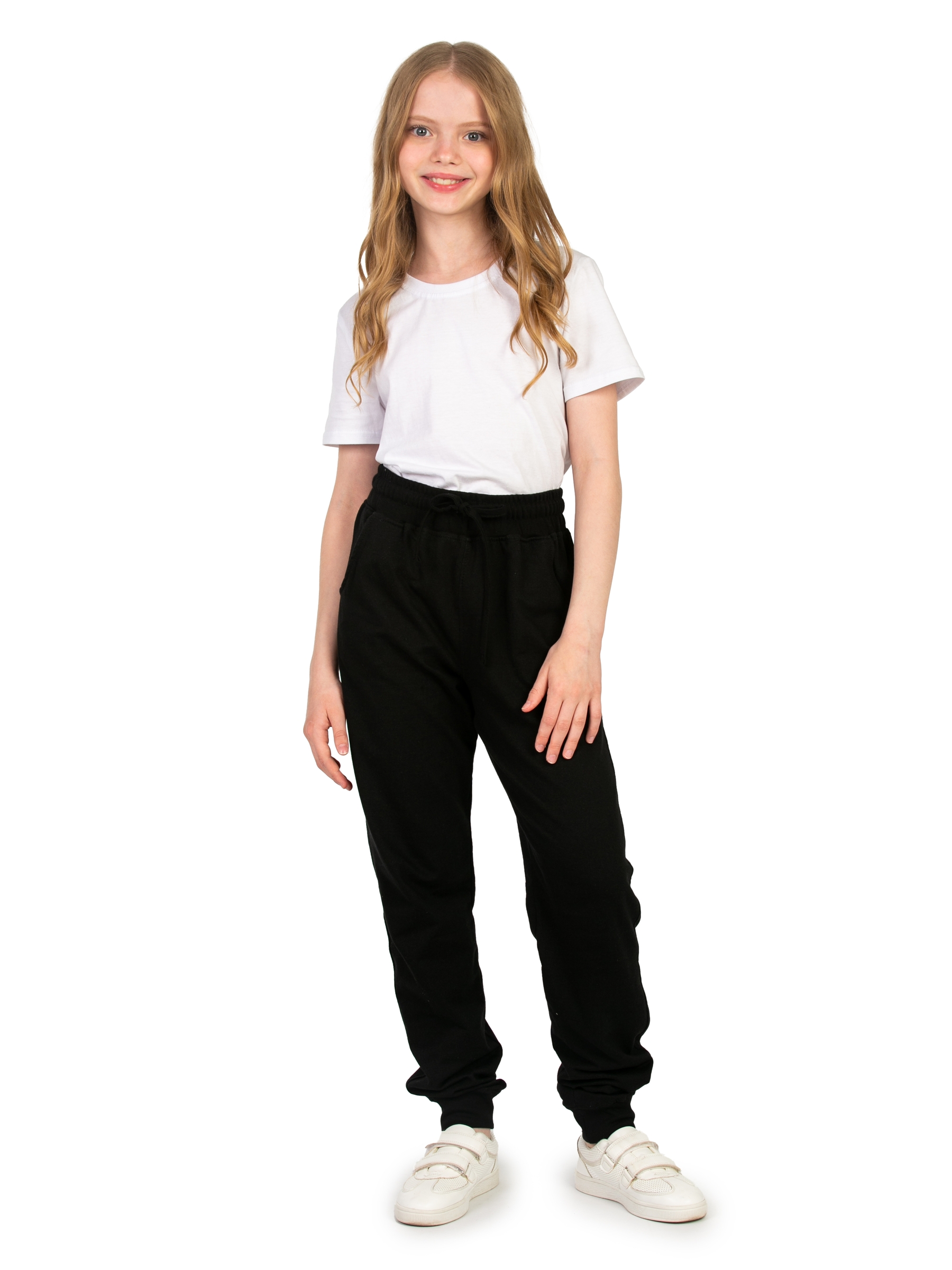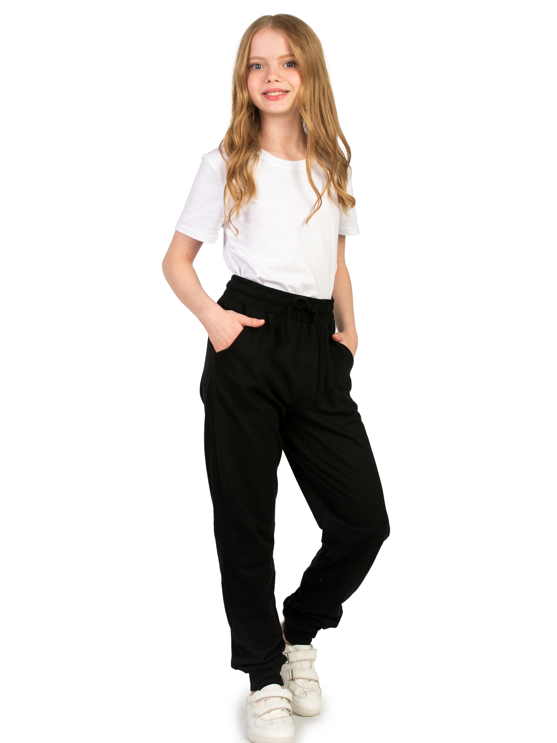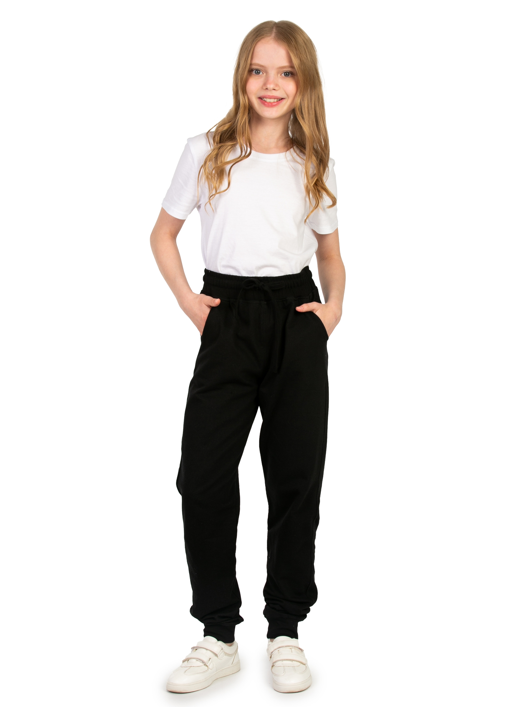Спортивные брюки для девочки черного цвета идеальны для повседневного ношения. Модель подойдет для дома, спорта и школьной физкультуры на улице. Свободные штаны джоггеры выполнены из качественного футера без начеса. Мягкие хлопковые материалы позволяют телу дышать, приятны на ощупь и очень практичны. За счет добавления полиэстера трикотаж приобретает эластичность и хорошую износостойкость. Не деформируется и не вытягивается в процессе эксплуатации. Прямые брюки на резинке имеют удобный лаконичный дизайн унисекс, поэтому подойдут для девочек и мальчиков, а также подростков возрастом с 8 до 17 лет. Детские джоггеры с манжетами наиболее удачны для занятий спортом. Такая модель обладает комфортной посадкой и при этом не сползает во время активных движений. Благодаря этому спортивки максимально удобно одевать на физру в школе или для тренировок. Модель свободного кроя будет также актуальна для современных танцев, например, хип хоп. Треники для подростка могут использоваться и как домашние трикотажные штаны, и как