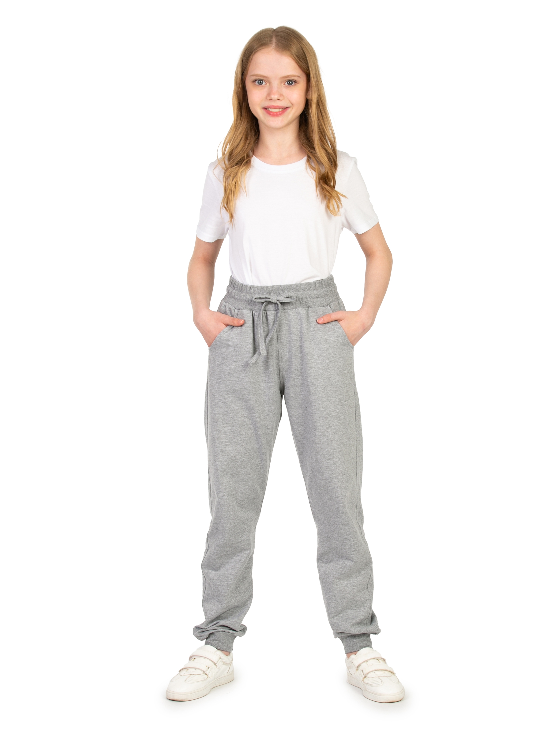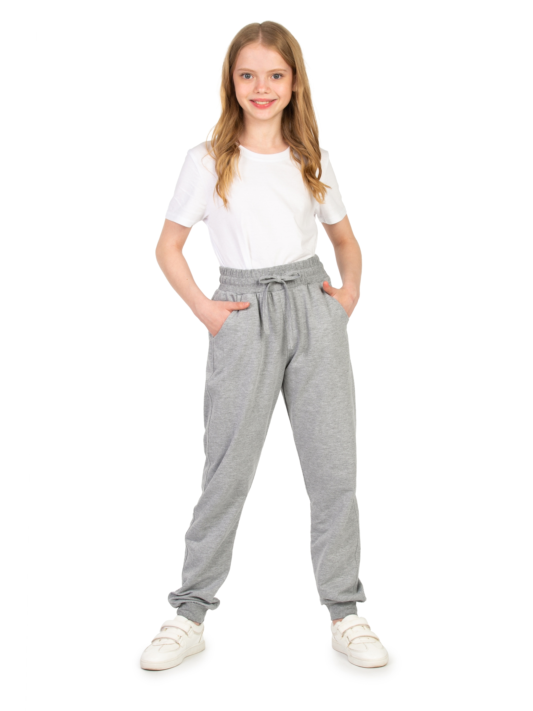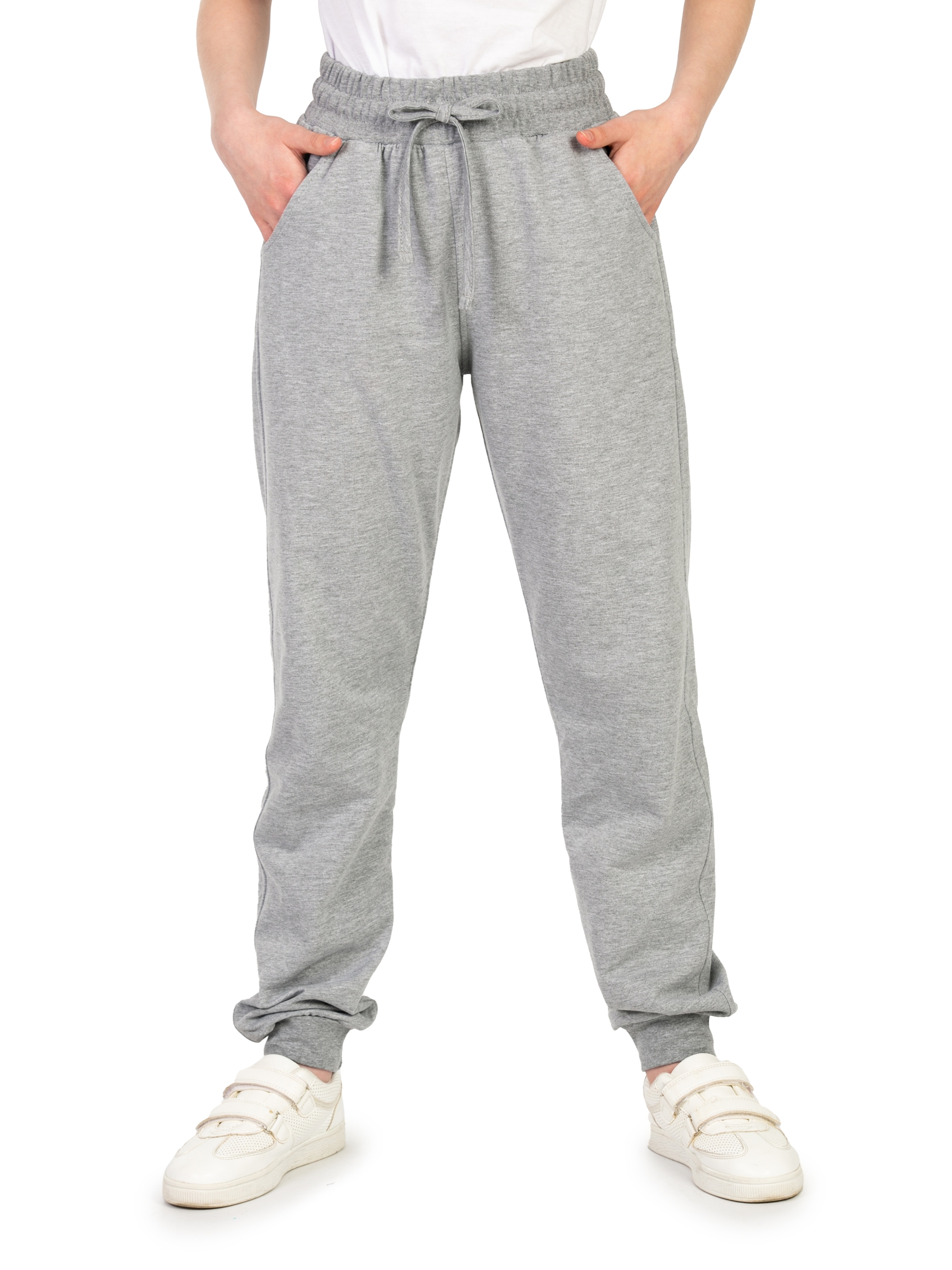 Спортивные брюки для девочки светло-серого цвета идеальны для повседневного ношения. Модель подойдет для дома, спорта и школьной физкультуры на улице. Свободные штаны джоггеры выполнены из качественного футера без начеса. Мягкие хлопковые материалы позволяют телу дышать, приятны на ощупь и очень практичны. За счет добавления полиэстера трикотаж приобретает эластичность и хорошую износостойкость. Не деформируется и не вытягивается в процессе эксплуатации. Прямые брюки на резинке имеют удобный лаконичный дизайн унисекс, поэтому подойдут для девочек и мальчиков, а также подростков возрастом с 8 до 17 лет. Детские джоггеры с манжетами наиболее удачны для занятий спортом. Такая модель обладает комфортной посадкой и при этом не сползает во время активных движений. Благодаря этому спортивки максимально удобно одевать на физру в школе или для тренировок. Модель свободного кроя будет также актуальна для современных танцев, например, хип хоп. Треники для подростка могут использоваться и как домашние трикотажные штаны,