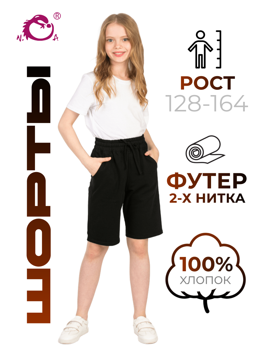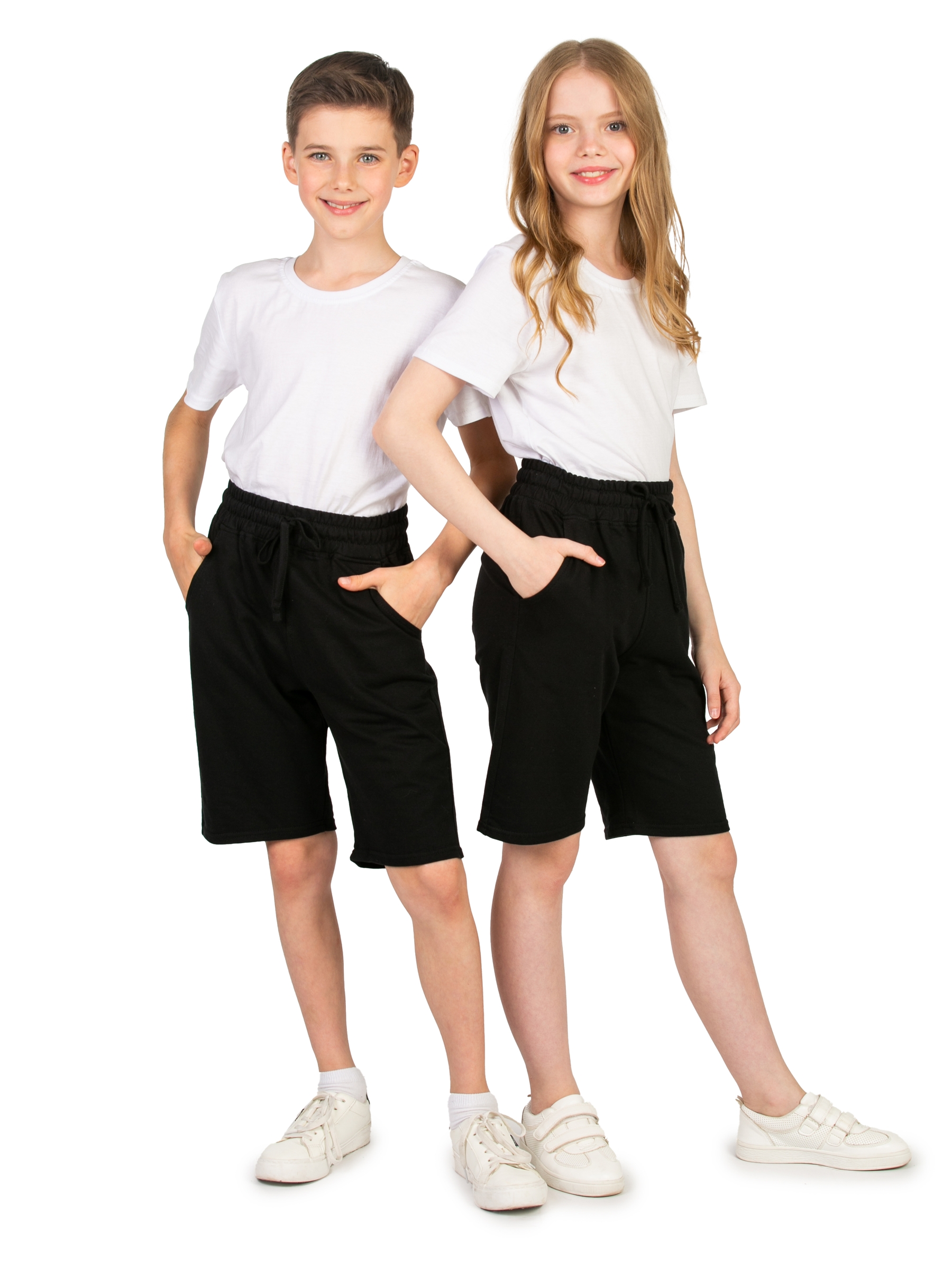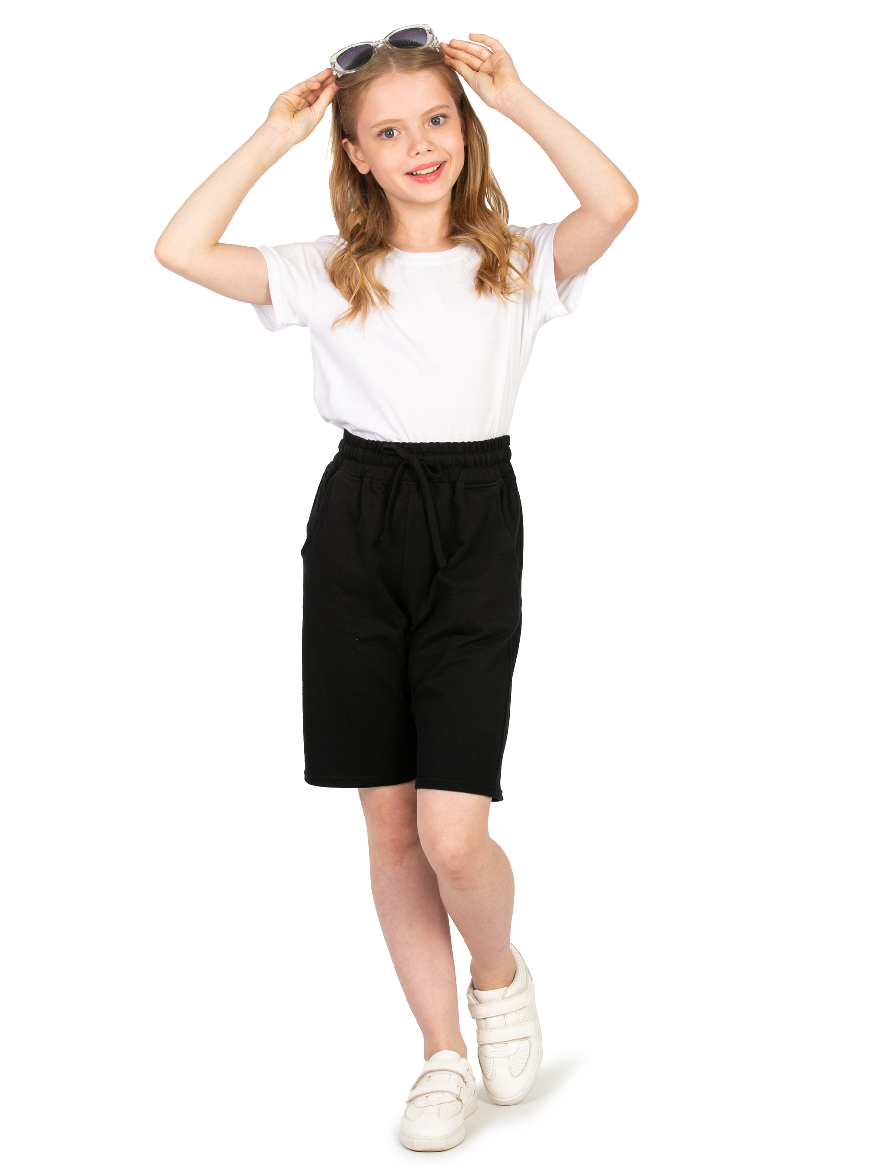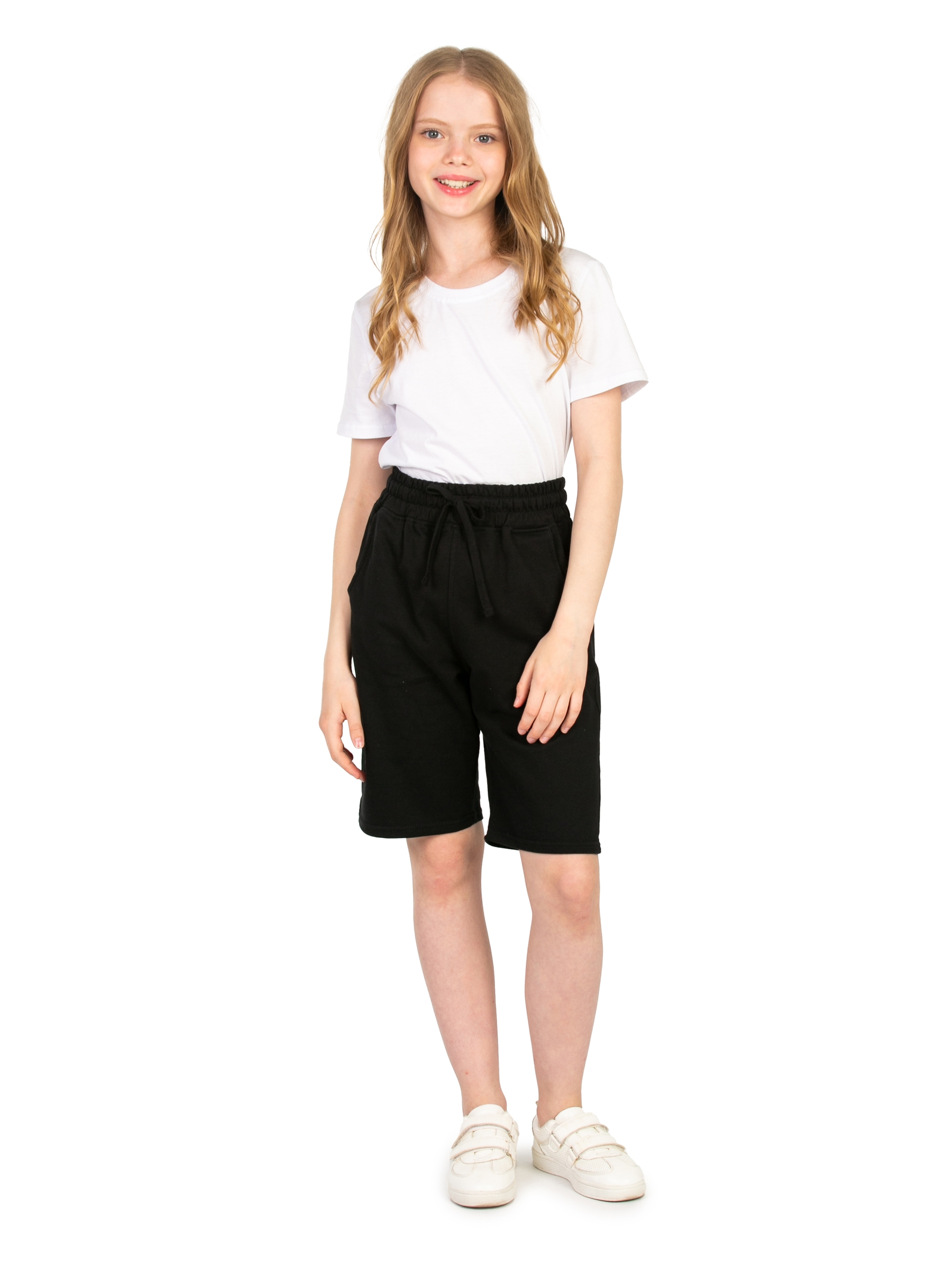 Трикотажные шорты для девочки черного цвета идеальное решение для дома, детского сада или школьной физкультуры. Модель изготовлена из 100% хлопка, который обеспечивает превосходные дышащие свойства и комфорт. Трикотаж из футера без начеса за счет петельчатой изнанки приятен наощупь, а лекало свободного прямого кроя не сковывает движения. Благодаря таким свойствам мягкие спортивные шорты с завязками на поясе прекрасно подходят для спорта, физры и других тренировок. Однотонные удлиненные шорты на резинке со шнурком универсальны и очень практичны. С ними хорошо комбинируются тренировочные, повседневные или домашние вещи, а также отлично сочетается любая спортивная одежда на физ-ру в школу. Прямые широкие шортики хб имеют среднюю посадку, поэтому будут комфортны для любой комплекции, в том числе для полных детей. Физкультурная форма унисекс подходит для мальчиков и девочек подростков от 3 до 14 лет. Подбирая размер, ориентируйтесь на рост ребенка или подростка, а не на его возраст. В ассортименте представлены св