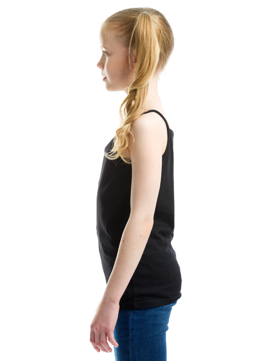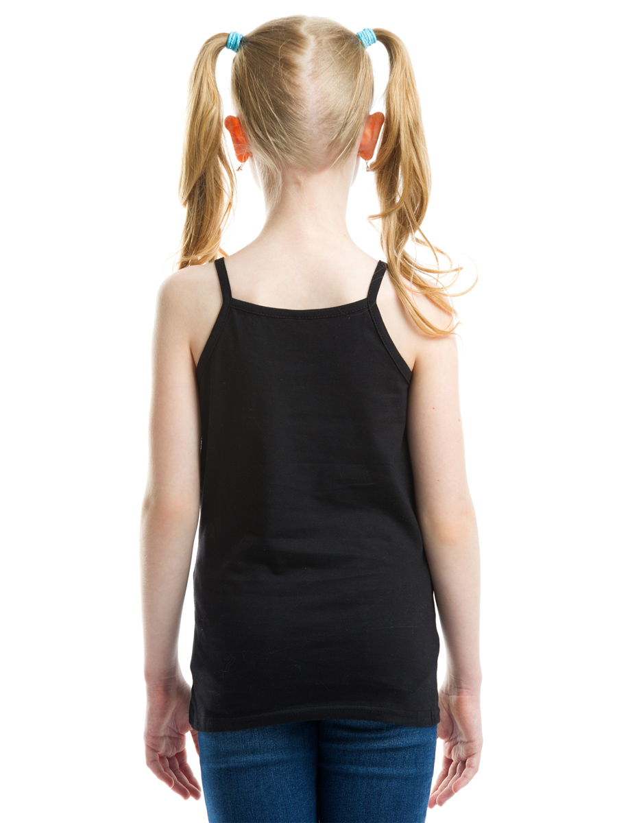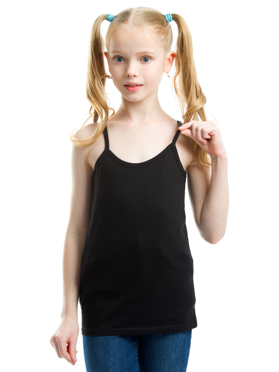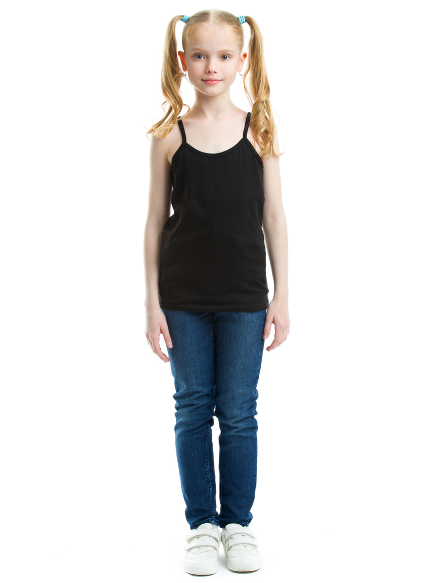 Базовая майка для девочек черного цвета. Майка классического кроя на бретельках, выполнена из натурального хлопка, мягкая и не стесняет движений. Идеальный вариант для ежедневной носки в школу и детский сад. Является одним из основных элементов базового гардероба современных юных модниц!