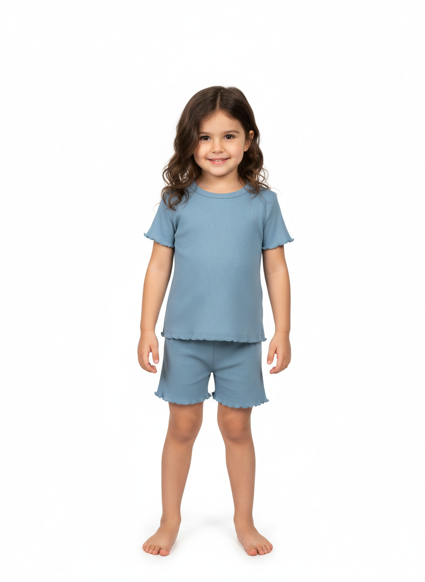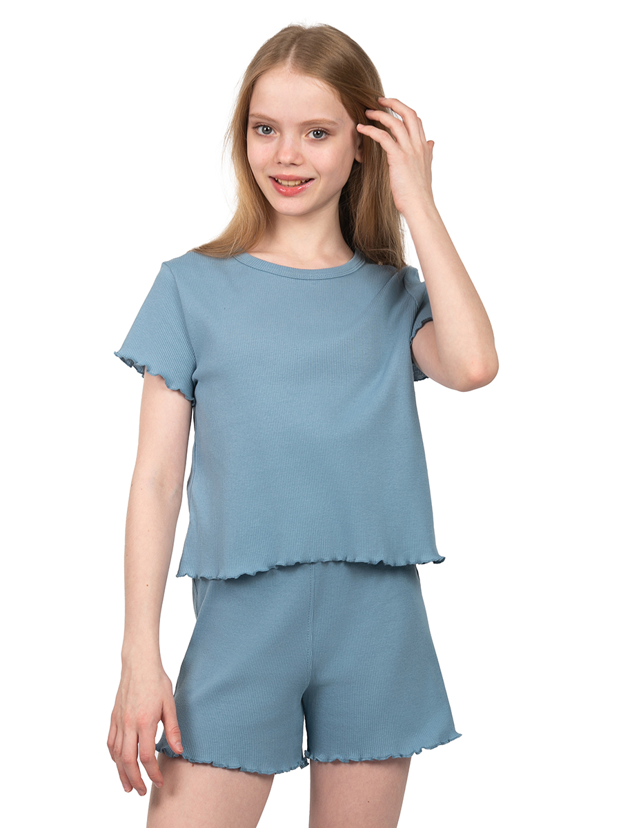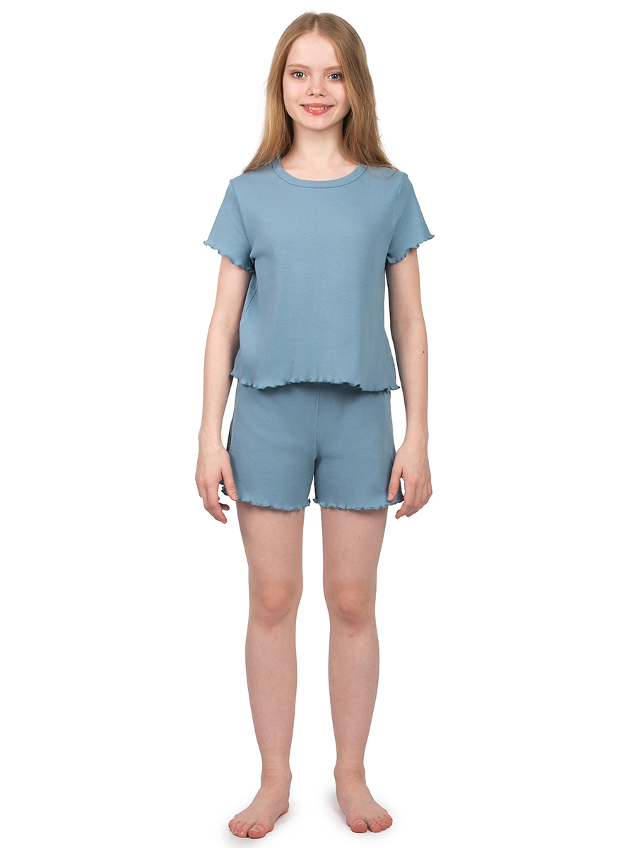 Стильная пижама для девочки голубого цвета порадует своим дизайном и отменным качеством материалов. Легкая трикотажная ткань из хлопка с добавлением лайкры приятно облегает тело и позволяет коже дышать, не препятствуя полноценному сну. Эластичный хб трикотаж в рубчик не только обеспечивает комфорт, но и интересно выглядит. Невероятно милая модель с рюшами понравится любой девочке подростку. Пижамные шорты и футболка с коротким рукавом подойдут не только для теплого времени года, но и будут актуальны круглогодично. Домашний костюм лапша дает максимальную воздухопроницаемость. Поэтому свободная пижама с футболкой и шортиками очень удобна для детей с беспокойным сном. В летнее же время комплект можно носить дома. Легкая хлопковая пижама с шортами и топом подойдет для девочек и подростков ростом от 128 до 164 см. Чтобы корректно подобрать нужный размер, учитывая рост и комплекцию ребенка, соотносите замеры с таблицей в фотографии. Мягкая пижамка детская выполнена из высококачественных материалов, которые хорошо