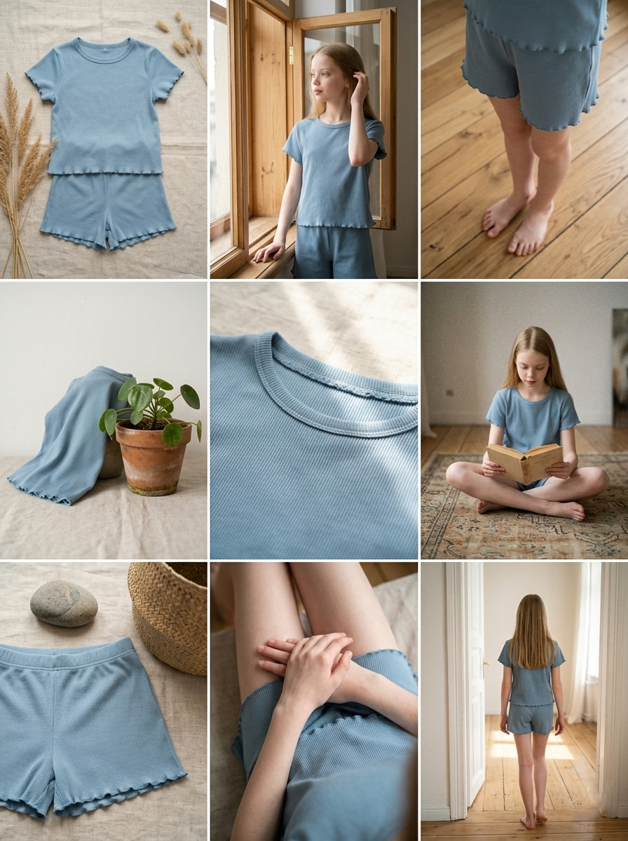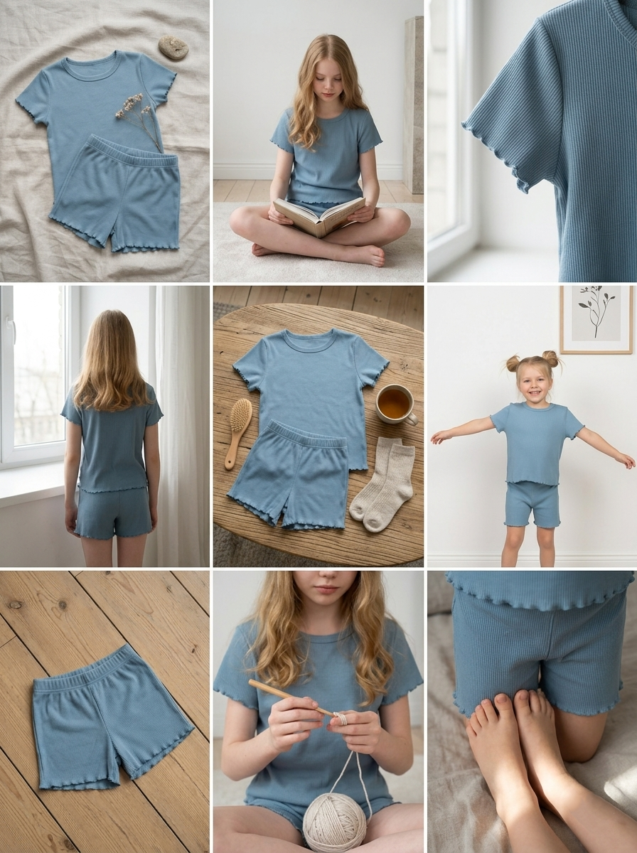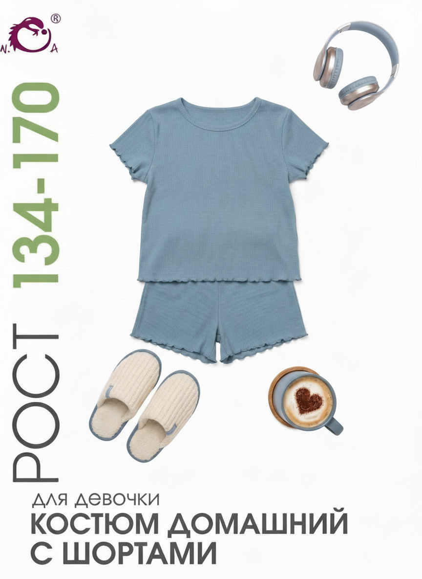 Стильная пижама для девочки голубого цвета порадует своим дизайном и отменным качеством материалов. Легкая трикотажная ткань из хлопка с добавлением лайкры приятно облегает тело и позволяет коже дышать, не препятствуя полноценному сну. Эластичный хб трикотаж в рубчик не только обеспечивает комфорт, но и интересно выглядит. Невероятно милая модель с рюшами понравится любой девочке подростку. Пижамные шорты и футболка с коротким рукавом подойдут не только для теплого времени года, но и будут актуальны круглогодично. Домашний костюм лапша дает максимальную воздухопроницаемость. Поэтому свободная пижама с футболкой и шортиками очень удобна для детей с беспокойным сном. В летнее же время комплект можно носить дома. Легкая хлопковая пижама с шортами и топом подойдет для девочек и подростков ростом от 128 до 164 см. Чтобы корректно подобрать нужный размер, учитывая рост и комплекцию ребенка, соотносите замеры с таблицей в фотографии. Мягкая пижамка детская выполнена из высококачественных материалов, которые хорошо