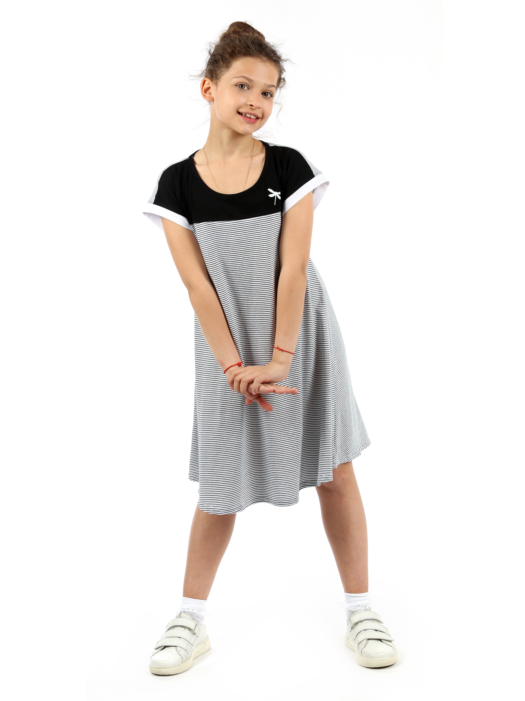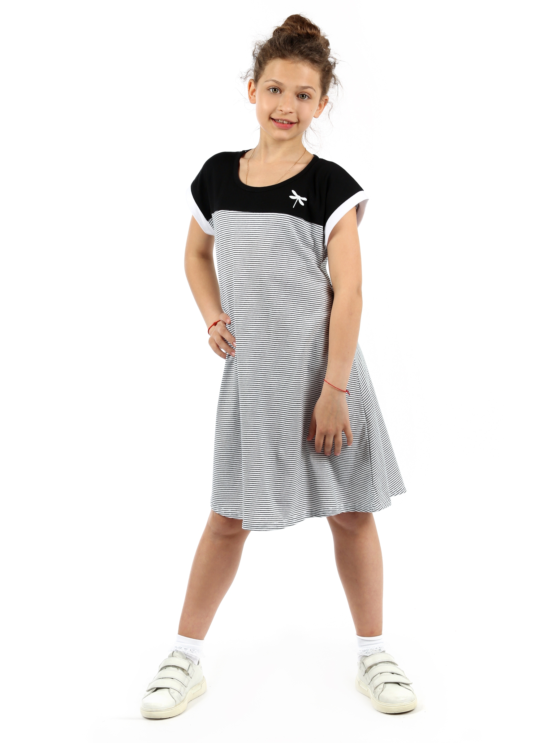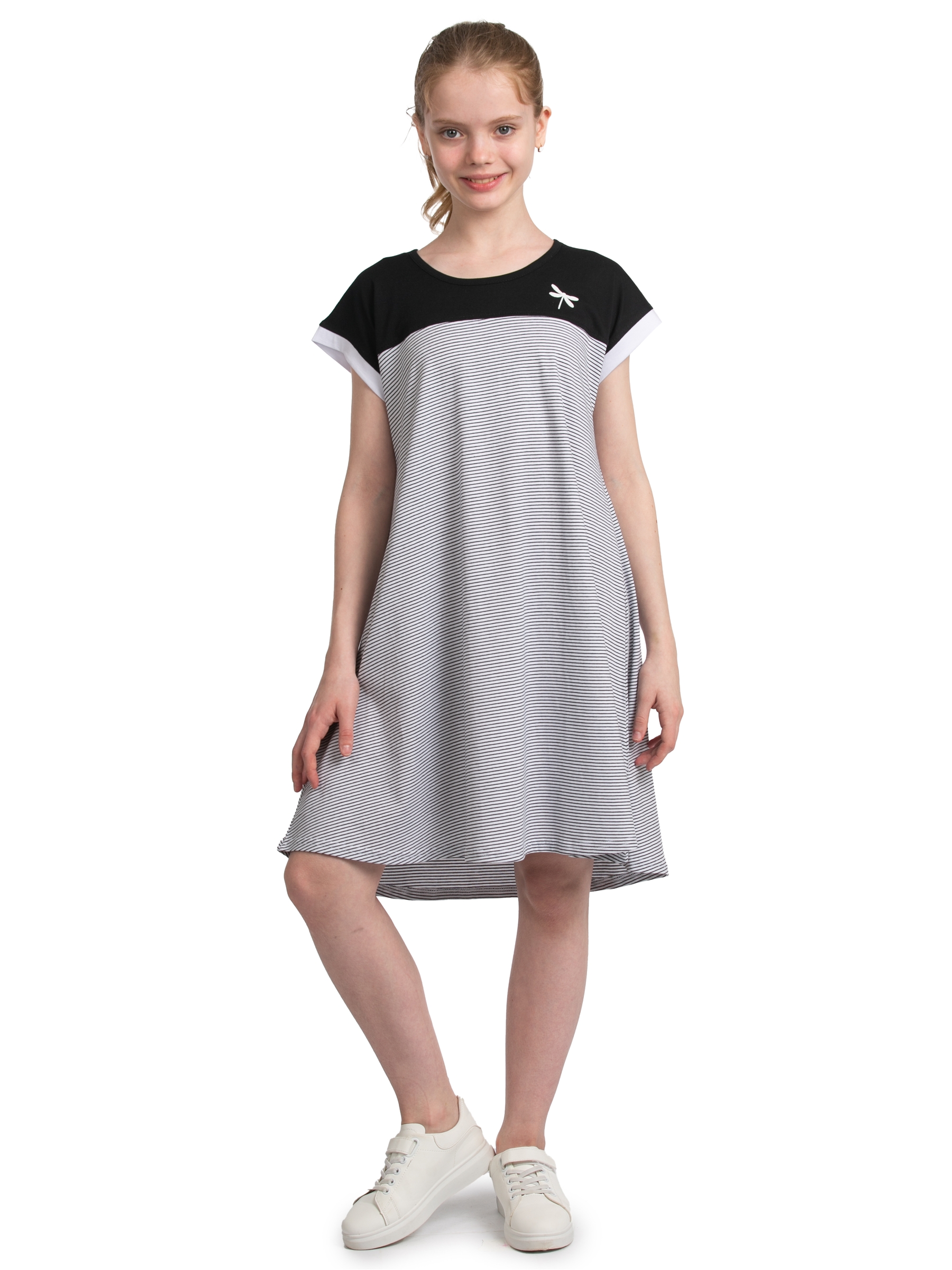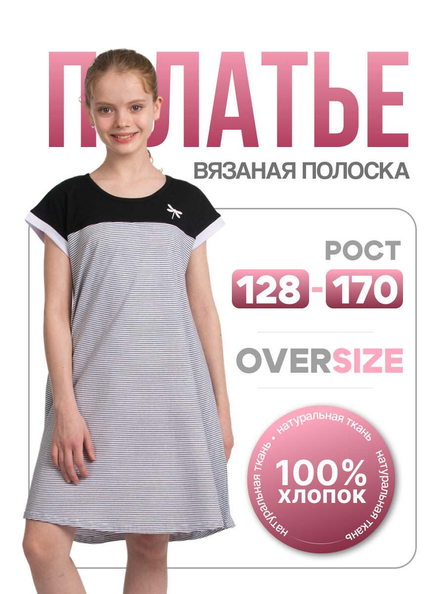 Модное полосатое платье для девочки подростка прекрасный вариант разнообразить гардероб маленькой модницы. Милая модель трапеция отлично подходит для ношения дома или на пляже в летнее время года. Легкое свободное лекало позволяет его носить в стиле оверсайз, делая фигуру более воздушной и нежной. А силуэт с воланами создает красивый романтичный образ. Повседневное трикотажное белое в черную полоску платье с коротким рукавом подойдет для невысоких девушек и девочек подростков в возрасте 10 - 17 лет ростом от 128 до 164 см. Красивая стильная модель oversize чуть выше колена прекрасно садится на любой тип фигуры за счет дизайна свободного кроя. Скрывая мелкие недостатки, такая одежда будет актуальна как для худых, так и для полных детей. Короткое домашнее платье в полоску выполнено из 100% хлопка высокого качества. Тонкое хлопковое кулирное полотно позволяет телу дышать и приятно на ощупь, что обеспечивает максимальный комфорт в процессе эксплуатации. Если Вас ждет отдых на море, пляжное мероприятие или проста