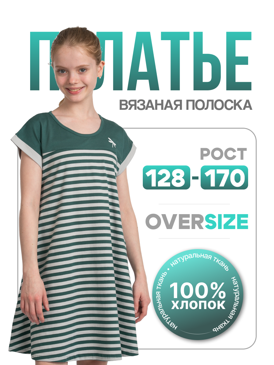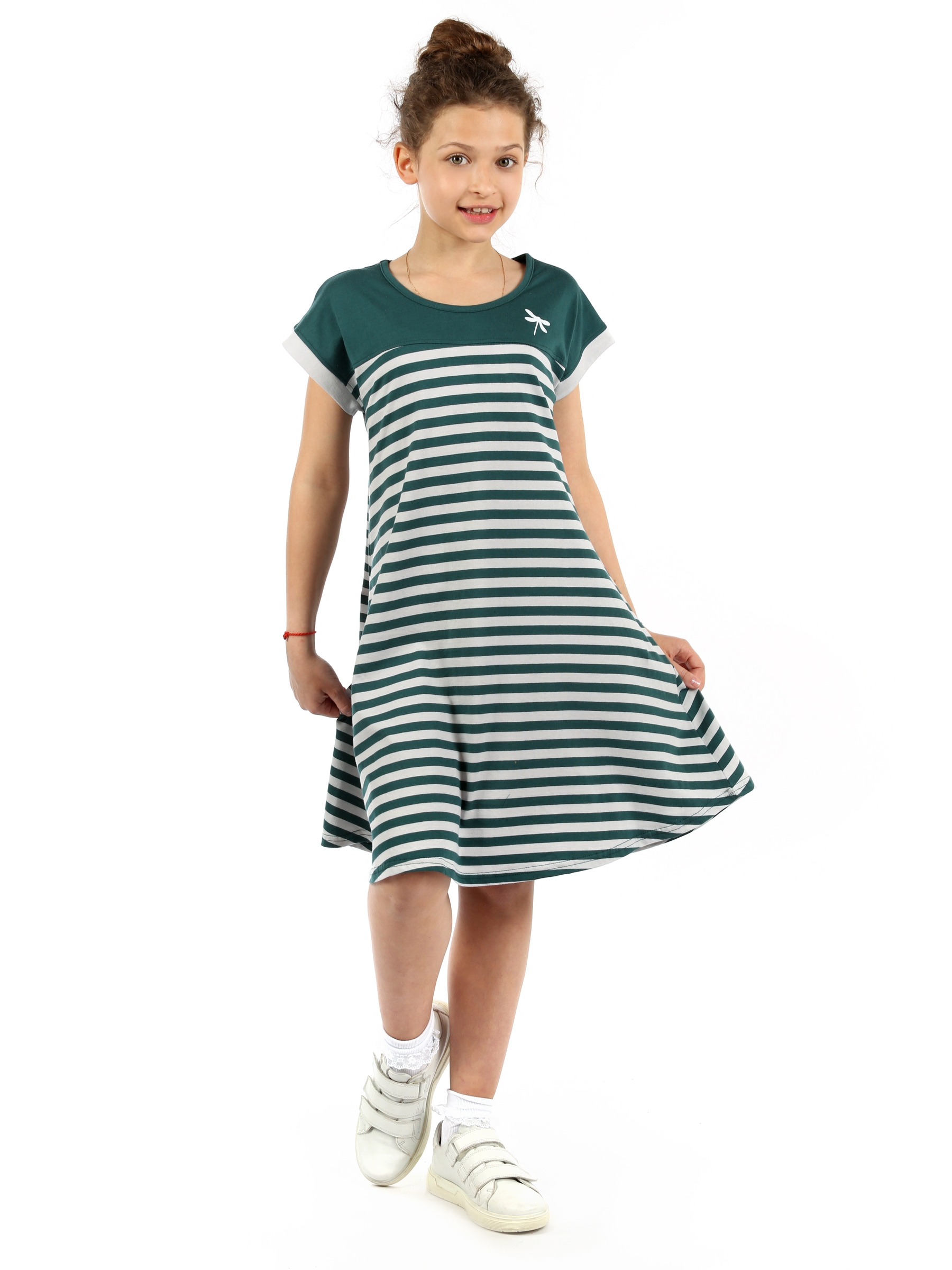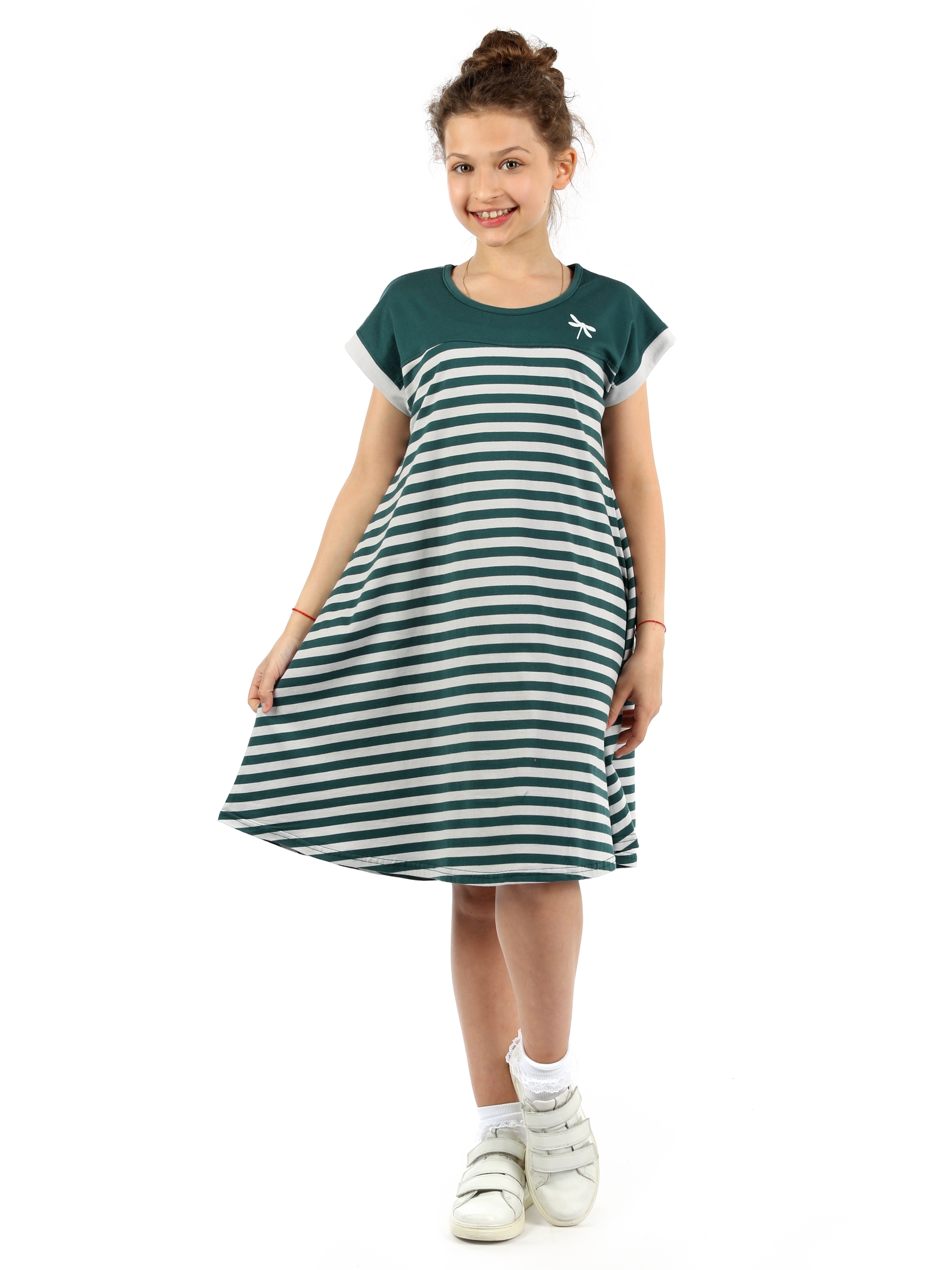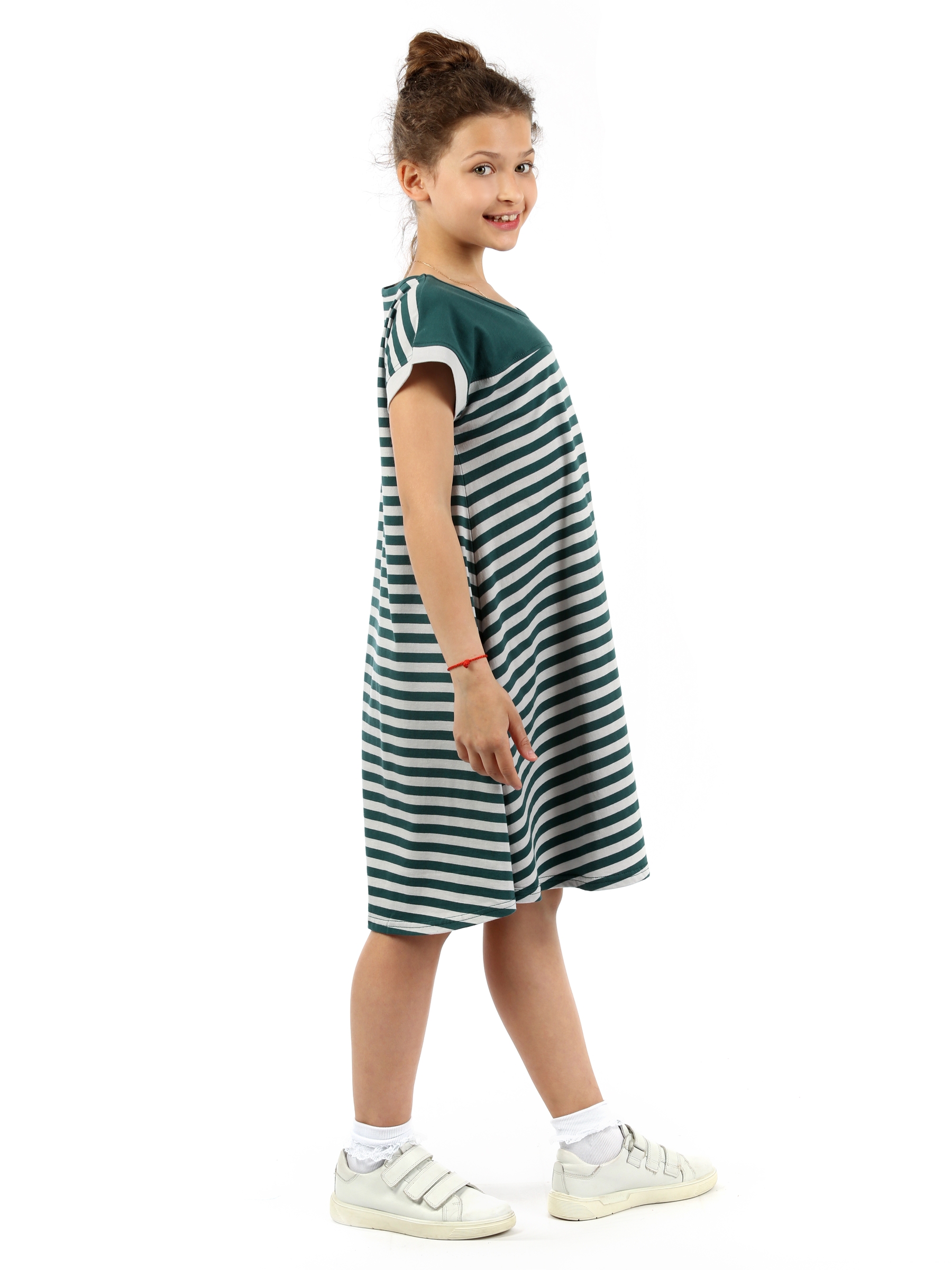 Модное полосатое платье для девочки подростка прекрасный вариант разнообразить гардероб маленькой модницы. Милая модель трапеция отлично подходит для ношения дома или на пляже в летнее время года. Легкое свободное лекало позволяет его носить в стиле оверсайз, делая фигуру более воздушной и нежной. А силуэт с воланами создает красивый романтичный образ. Повседневное трикотажное серое в зеленую полоску платье с коротким рукавом подойдет для невысоких девушек и девочек подростков в возрасте 10 - 17 лет ростом от 128 до 164 см. Красивая стильная модель oversize чуть выше колена прекрасно садится на любой тип фигуры за счет дизайна свободного кроя. Скрывая мелкие недостатки, такая одежда будет актуальна как для худых, так и для полных детей. Короткое домашнее платье в полоску выполнено из 100% хлопка высокого качества. Тонкое хлопковое кулирное полотно позволяет телу дышать и приятно на ощупь, что обеспечивает максимальный комфорт в процессе эксплуатации. Если Вас ждет отдых на море, пляжное мероприятие или прост