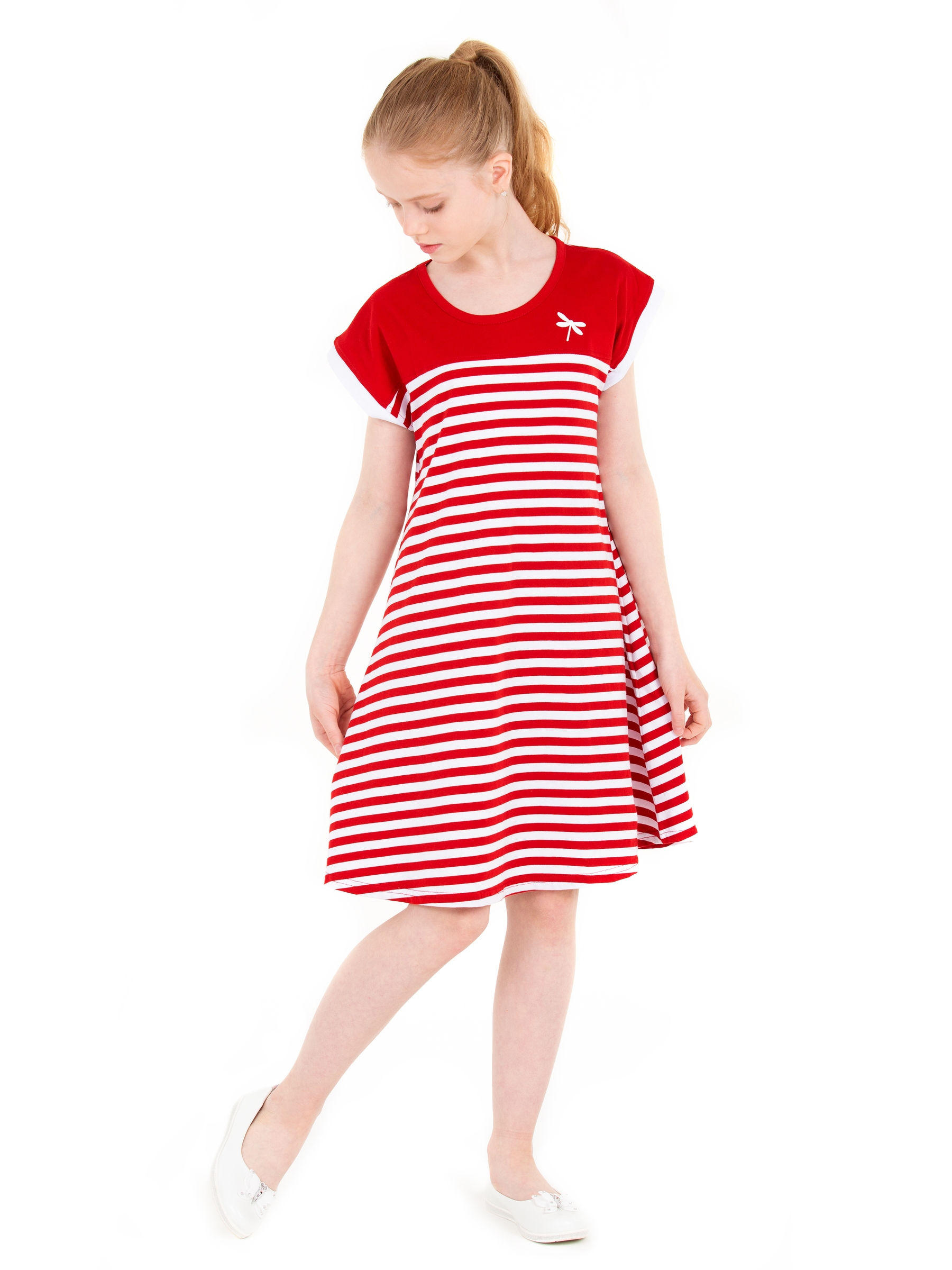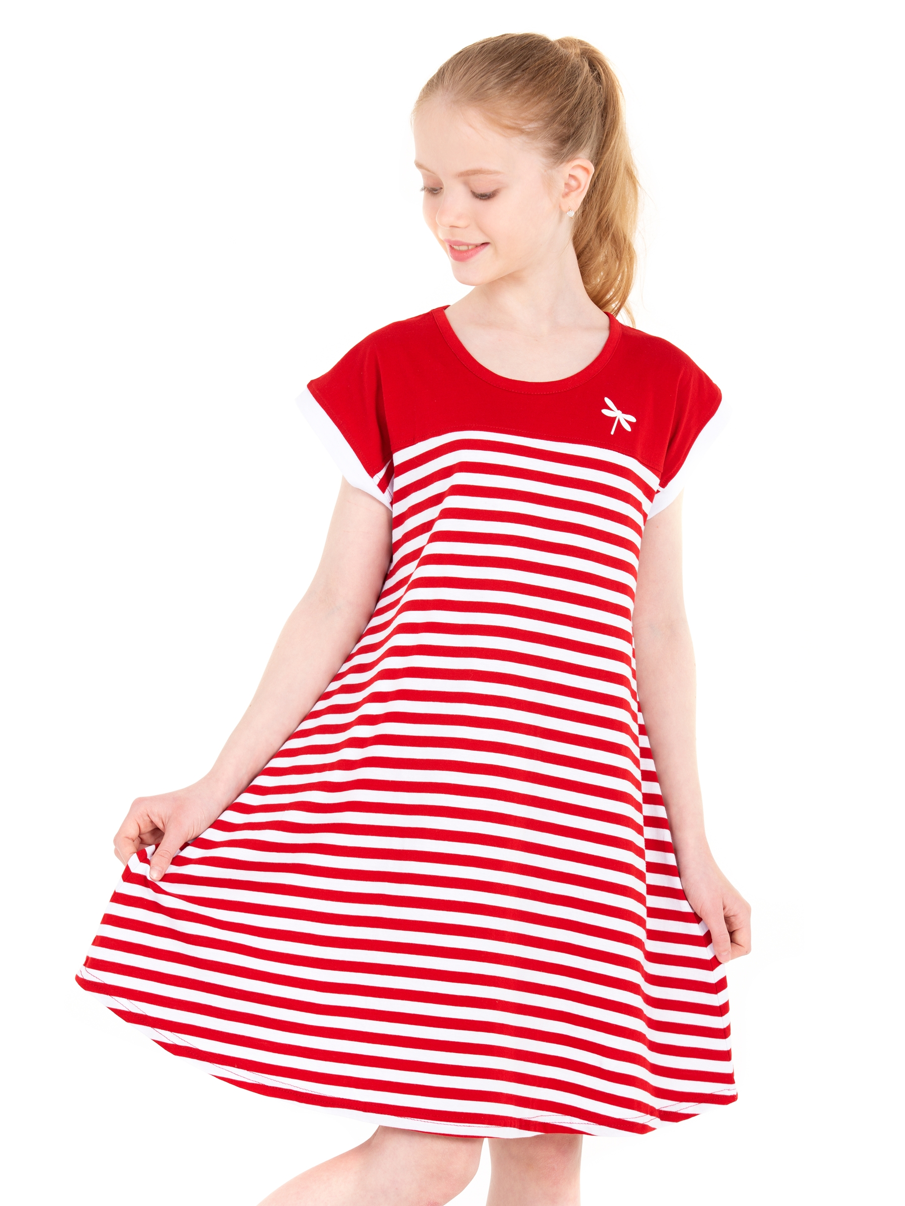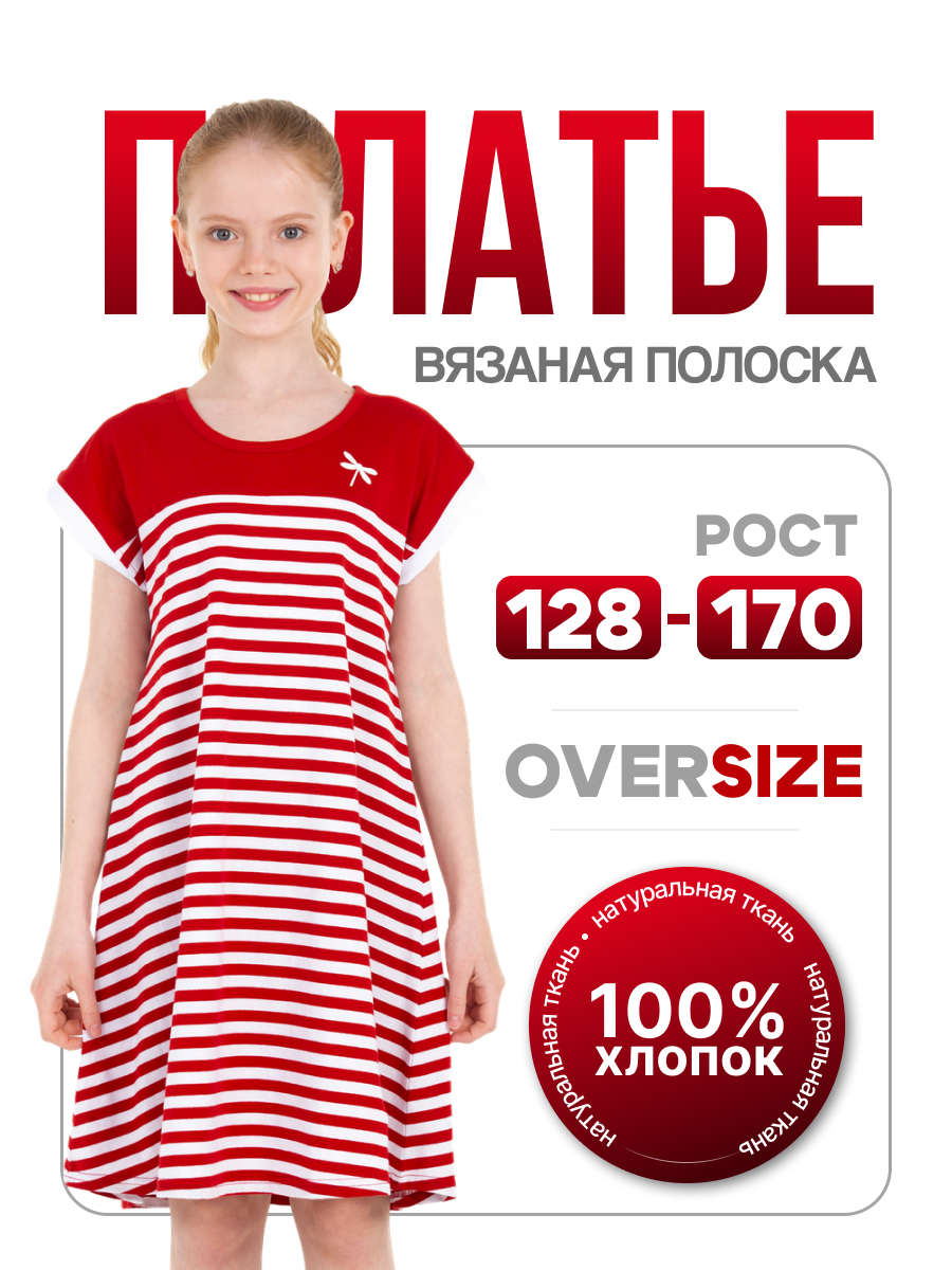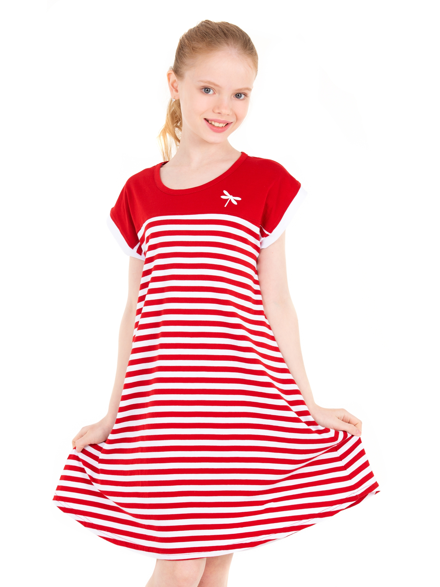 Модное полосатое платье для девочки подростка прекрасный вариант разнообразить гардероб маленькой модницы. Милая модель трапеция отлично подходит для ношения дома или на пляже в летнее время года. Легкое свободное лекало позволяет его носить в стиле оверсайз, делая фигуру более воздушной и нежной. А силуэт с воланами создает красивый романтичный образ. Повседневное трикотажное белое в темно-красную полоску платье с коротким рукавом подойдет для невысоких девушек и девочек подростков в возрасте 10 - 17 лет ростом от 128 до 164 см. Красивая стильная модель oversize чуть выше колена прекрасно садится на любой тип фигуры за счет дизайна свободного кроя. Скрывая мелкие недостатки, такая одежда будет актуальна как для худых, так и для полных детей. Короткое домашнее платье в полоску выполнено из 100% хлопка высокого качества. Тонкое хлопковое кулирное полотно позволяет телу дышать и приятно на ощупь, что обеспечивает максимальный комфорт в процессе эксплуатации. Если Вас ждет отдых на море, пляжное мероприятие или