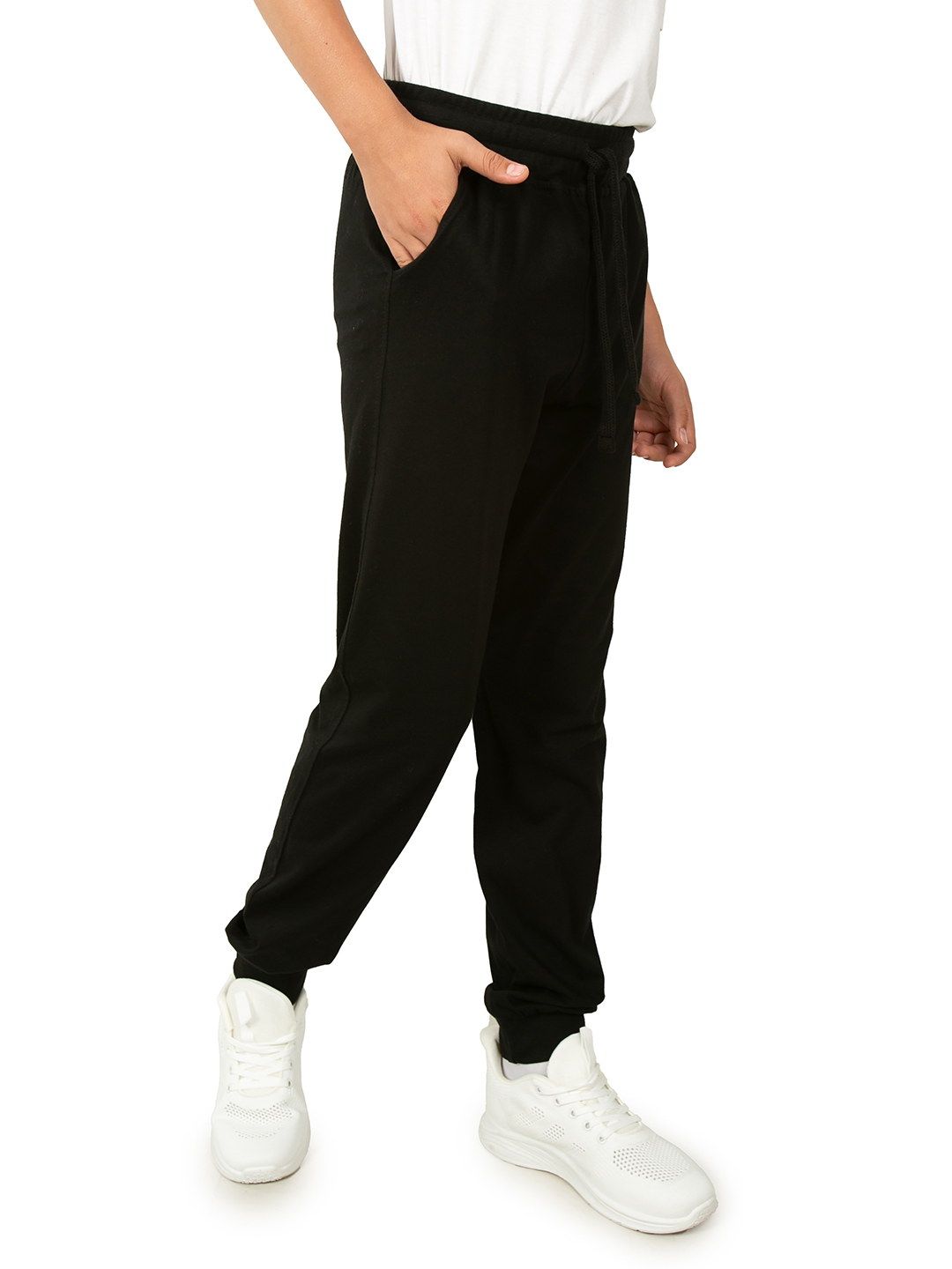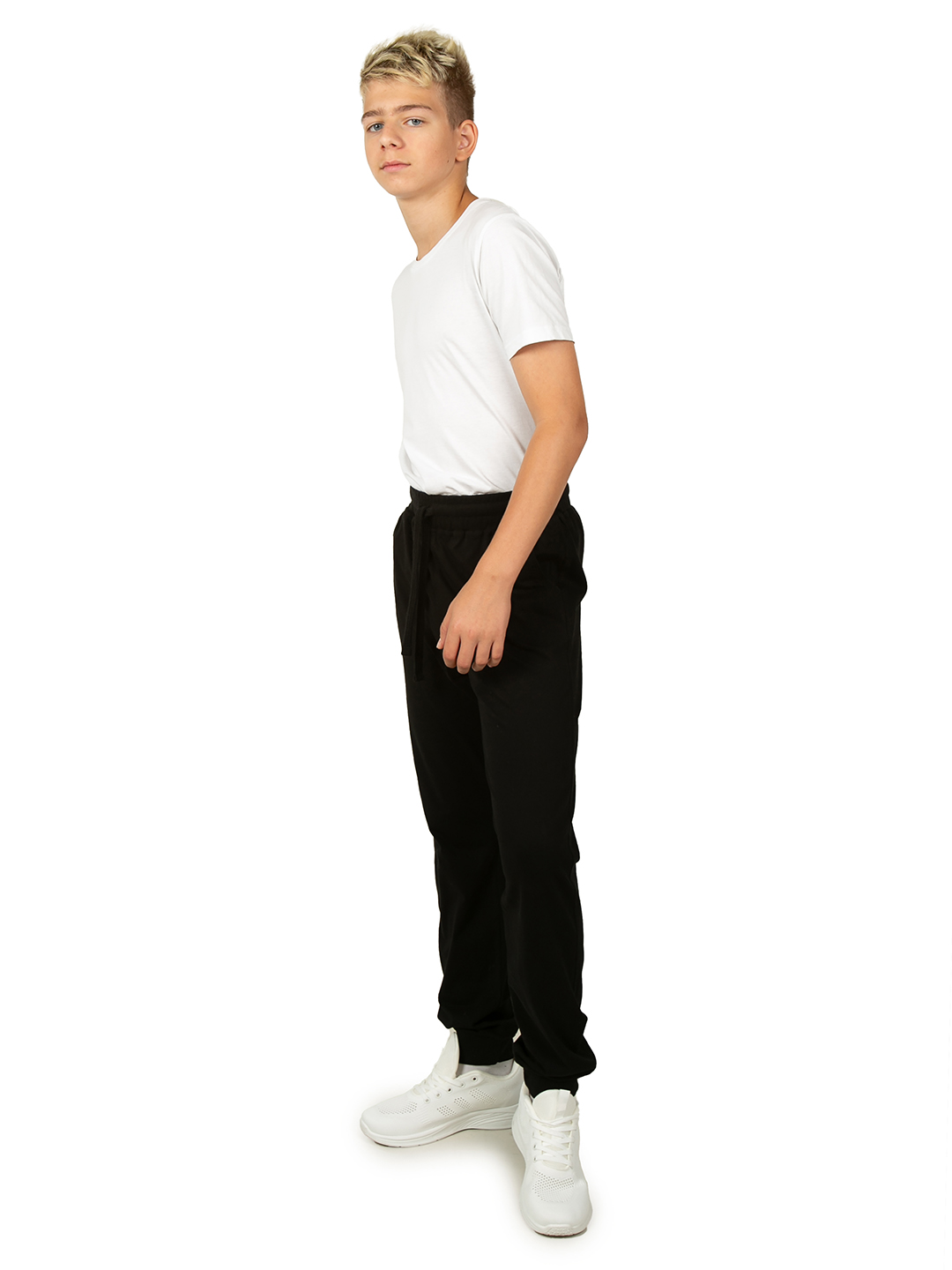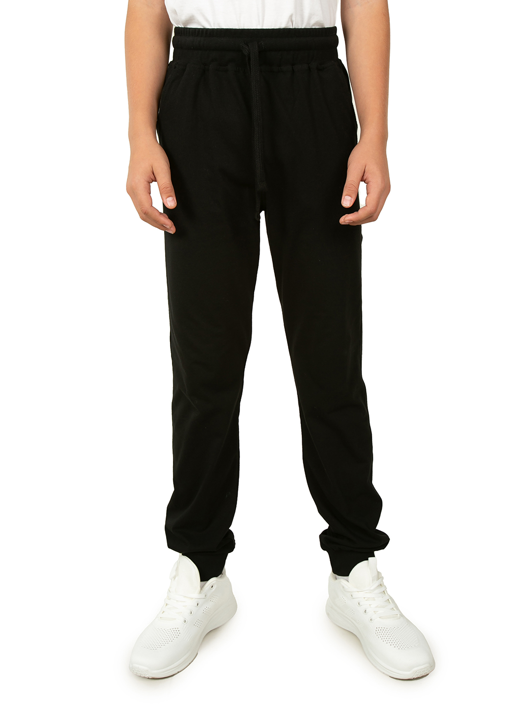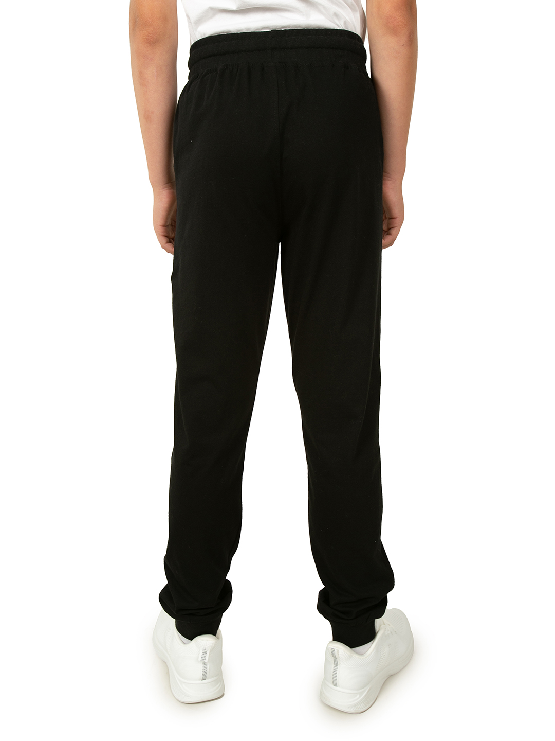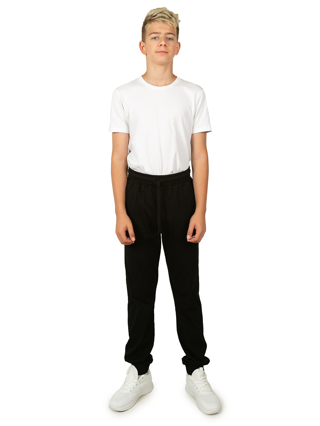 Спортивные штаны для мальчика черного цвета отлично подойдут для занятий спортом, физкультуры или любых других тренировок. Детские джоггеры имеют классическую среднюю посадку с поясом на резинке со шнурком. Свободный прямой крой с манжетами внизу очень удачен, т.к. тренировочные брюки не сползают, но и не стесняют движения при активных упражнениях. Физкультурные спортивки выполнены из хлопка с эластаном. Хб трикотаж типа кулирное волокно отлично держит форму, позволяет телу дышать и полностью гипоаллергенен. Помимо традиционных видов спорта (фитнеса, бега или физры), где крайне удобно использовать легкие трикотажные штаны для детей и подростков, такую одежду идеально одевать для отдыха дома. Ведь хлопковые материалы очень мягкие и комфортные. Домашнее трико обеспечивает уют весь день, чем бы ни занимался ребенок. Модель можно легко сочетать с любыми спортивными вещами. Кулирное полотно приятный и легкий материал, поэтому в них удобно тренироваться. Свободные штаны джоггеры с базовым классическим дизайном буд
