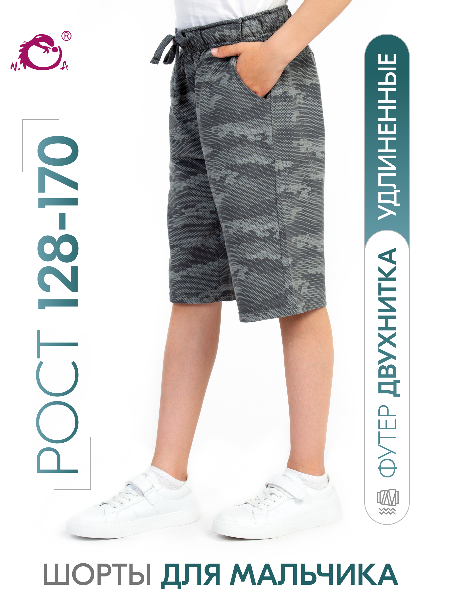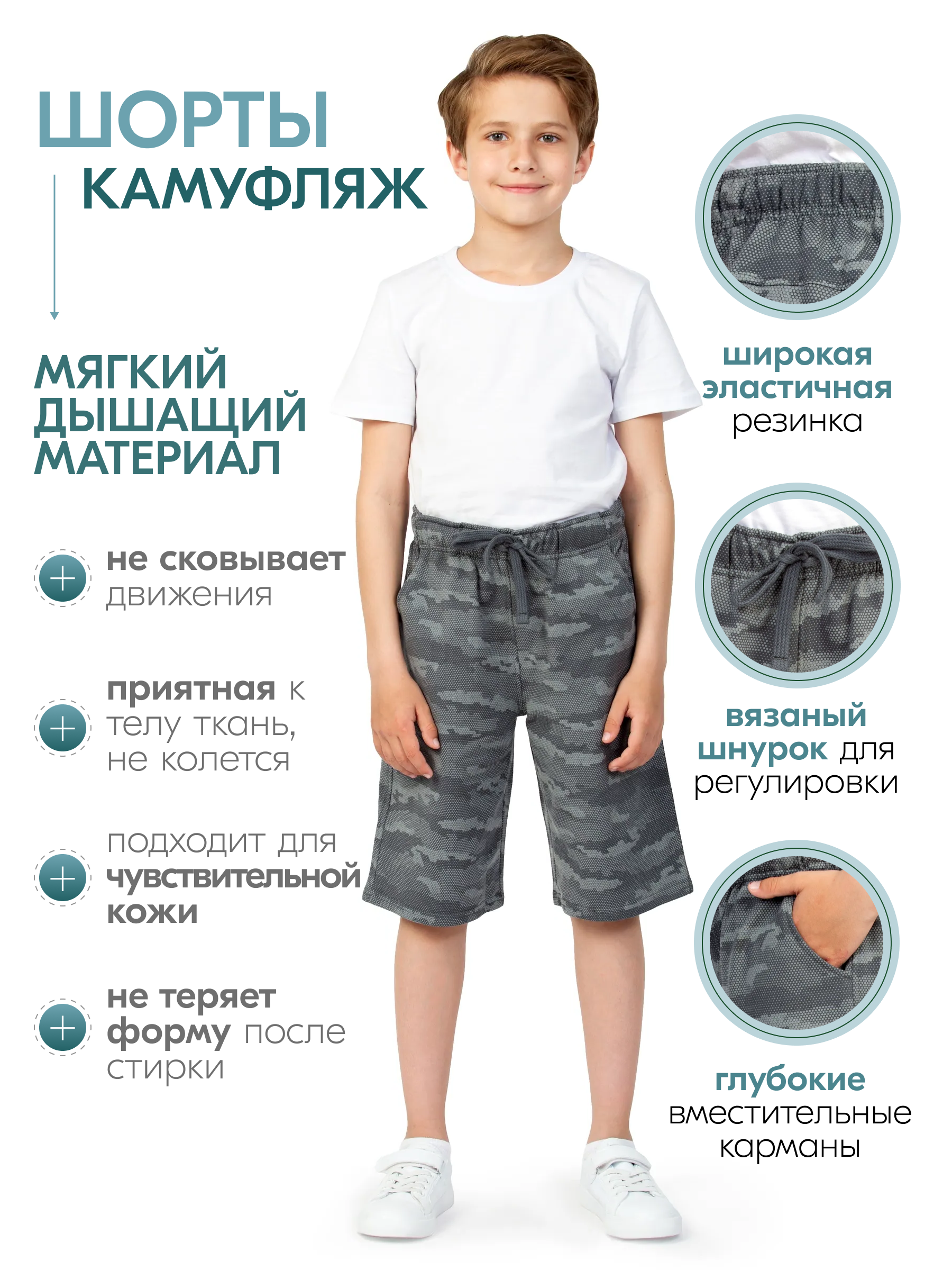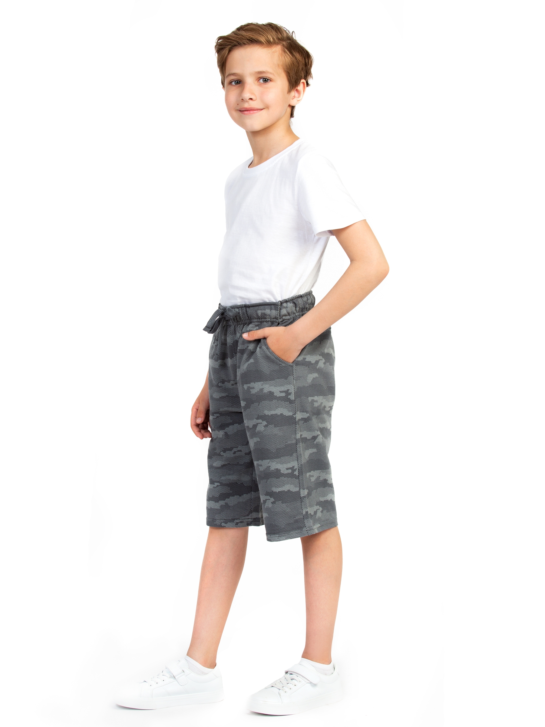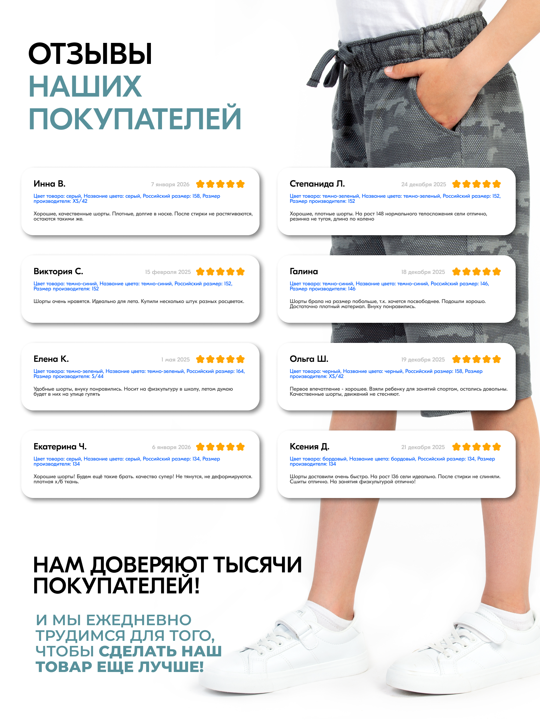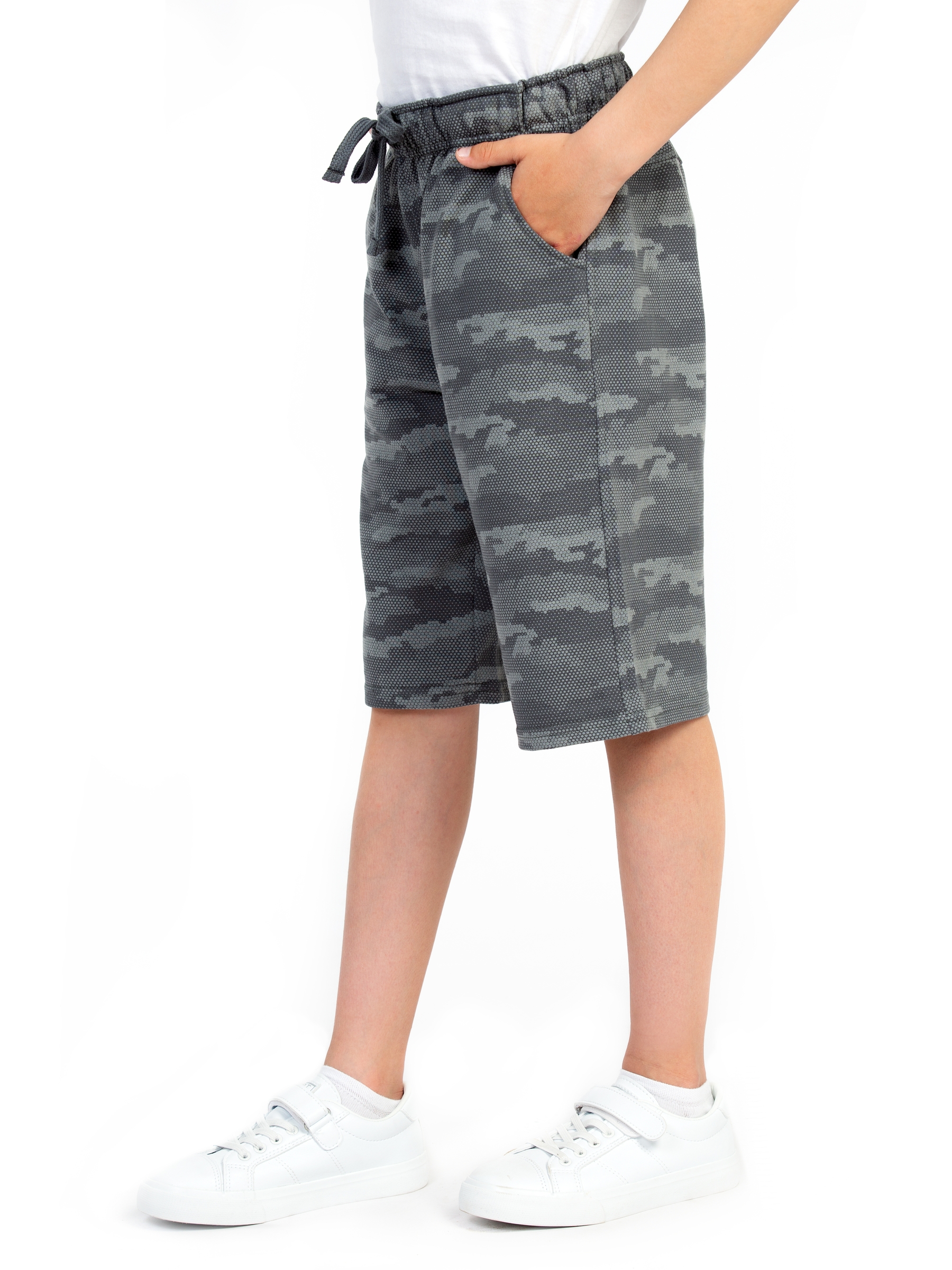 Камуфляжные шорты для мальчика серого цвета подойдут тем, кто не любит однообразия. Милитари никогда не выходит из моды и всегда находит своих любителей. Интересные военные принты дополняет необычный пиксель, который делает образ более оригинальным. Модель свободного прямого кроя ниже колен выполнена из качественного трикотажа футер без начеса. Мягкий и дышащий хб материал дополнен полиэстером для большей практичности. За счет этого удлиненные прямые широкие шортики хорошо держат форму и не вытягиваются в процессе эксплуатации. Спортивные длинные шорты на резинке со шнурком хорошо садятся на любую фигуру, подойдут для худых подростков или полных детей ростом от 128 до 164 см. Чтобы выбрать корректно размер, мы рекомендуем отталкиваться от таблицы в фотографиях, где Вы сможете увидеть корректные замеры. Свободные бриджи с завязками на поясе отлично вписываются в гардероб и комбинируются с другой одеждой. Ждут Вашего ребенка или подростка повседневные будни или домашние детские забавы. Модель по колено будет