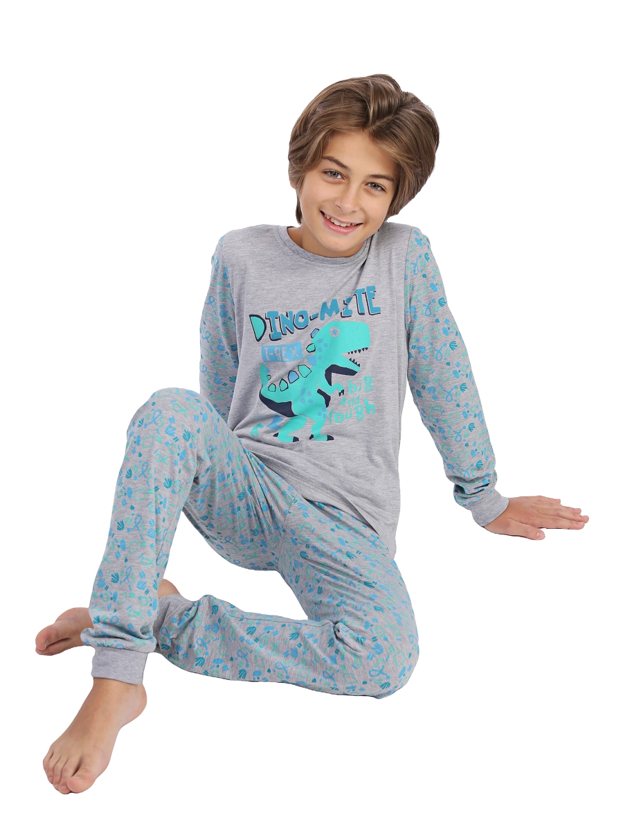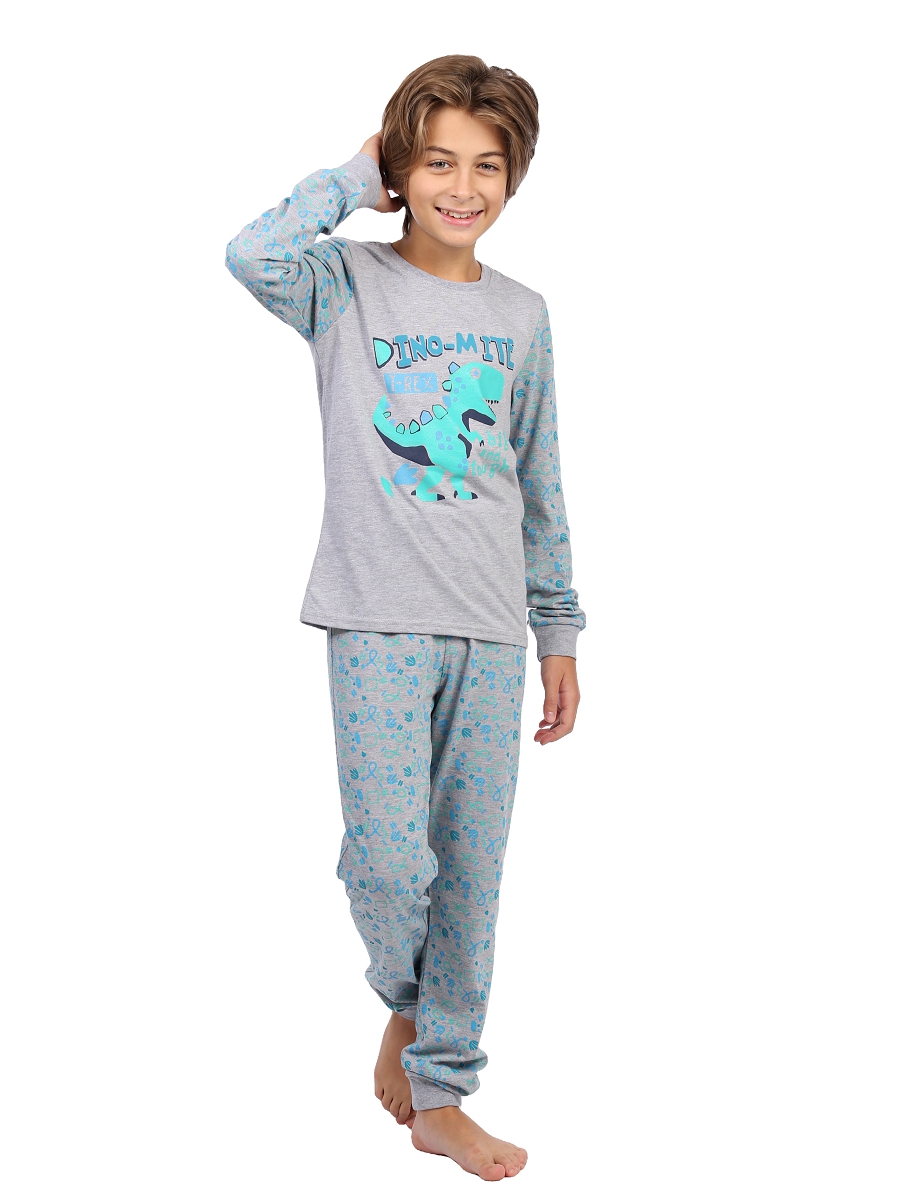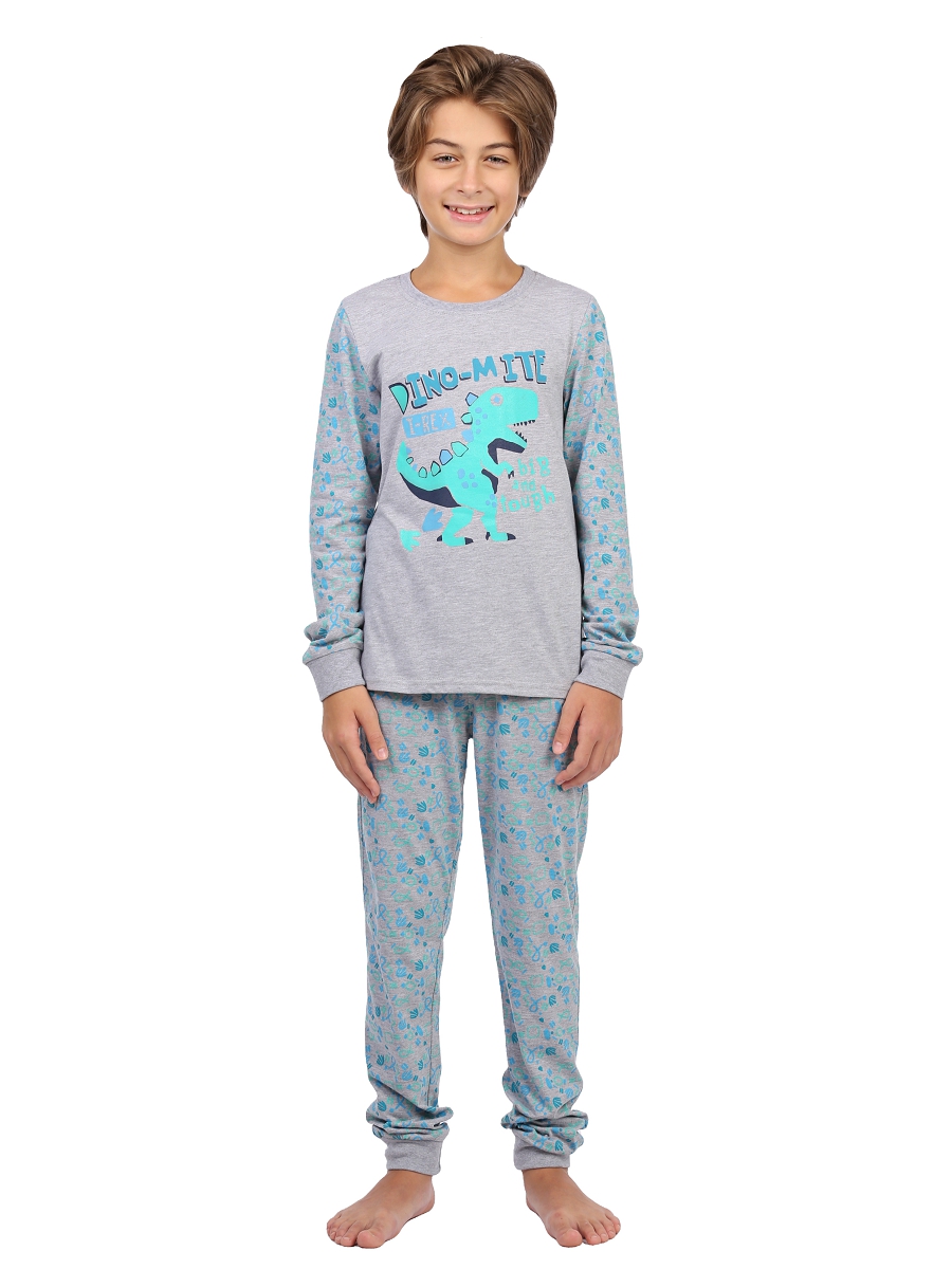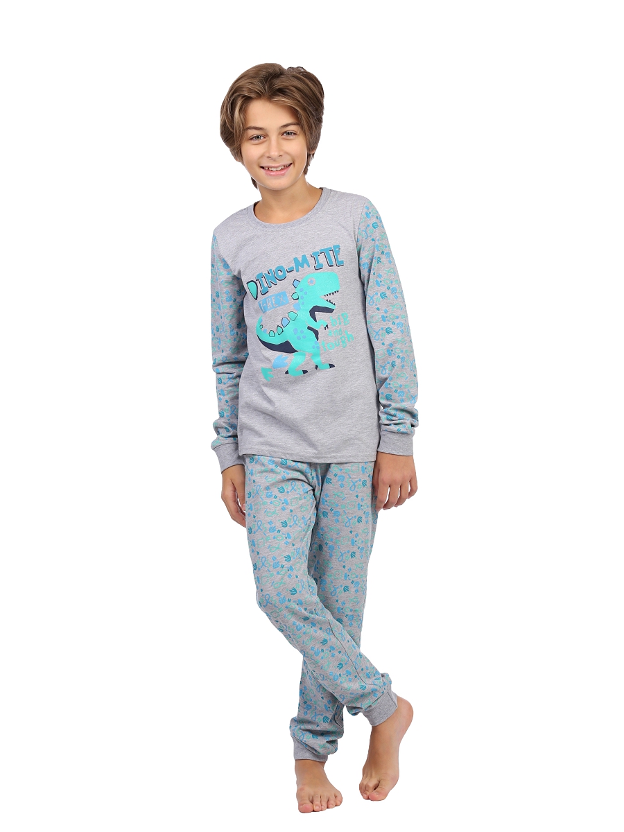 Детская пижама для мальчика серого цвета с длинным рукавом - стильная и удобная одежда для дома, сна и отдыха. Тип ткани - кулирное полотно. Домашний костюм двойка включает в себя: штаны и кофту. Лонгслив свободного прямого кроя с длинным рукавом. Брюки внизу собраны на манжет. Ночная пижамка выполнена из натурального хлопка. Хлопковая ткань мягкая, приятная для тела, хорошо пропускает воздух и создает комфортный микроклимат для кожи в любое время года. Одежда для дома отлично подойдет на осенний период и на зимний отопительный сезон. Сезон: осень зима. Легкая эстетичная пижама оверсайз без начеса очень удобна в носке. Комплект одежды не сковывает движений. Ночью в нем будет удобно во время сна. А днем - для активных игр дома. Пижамный хб костюм - оптимальный выбор для детского садика. Удобен для дневного сна в саду и для повседневной носки. Пижама украшена красивым принтом рисунком. Милая смешная пижамка с динозаврами. Красивый дизайн в корейском стиле с динозавриком подойдет для мальчиков и для девочек.