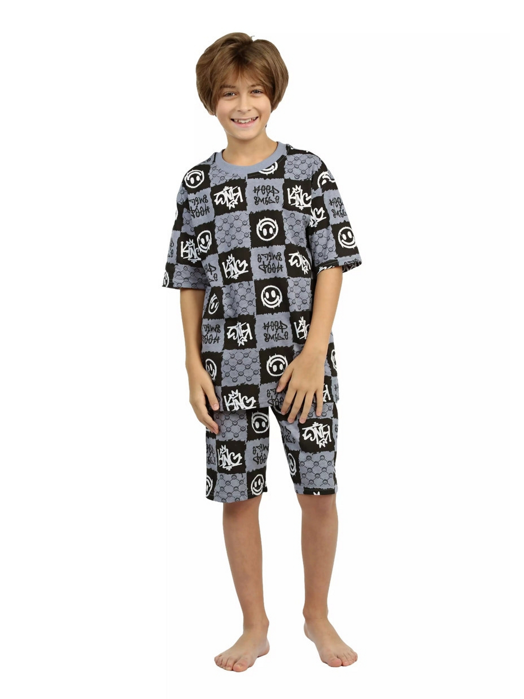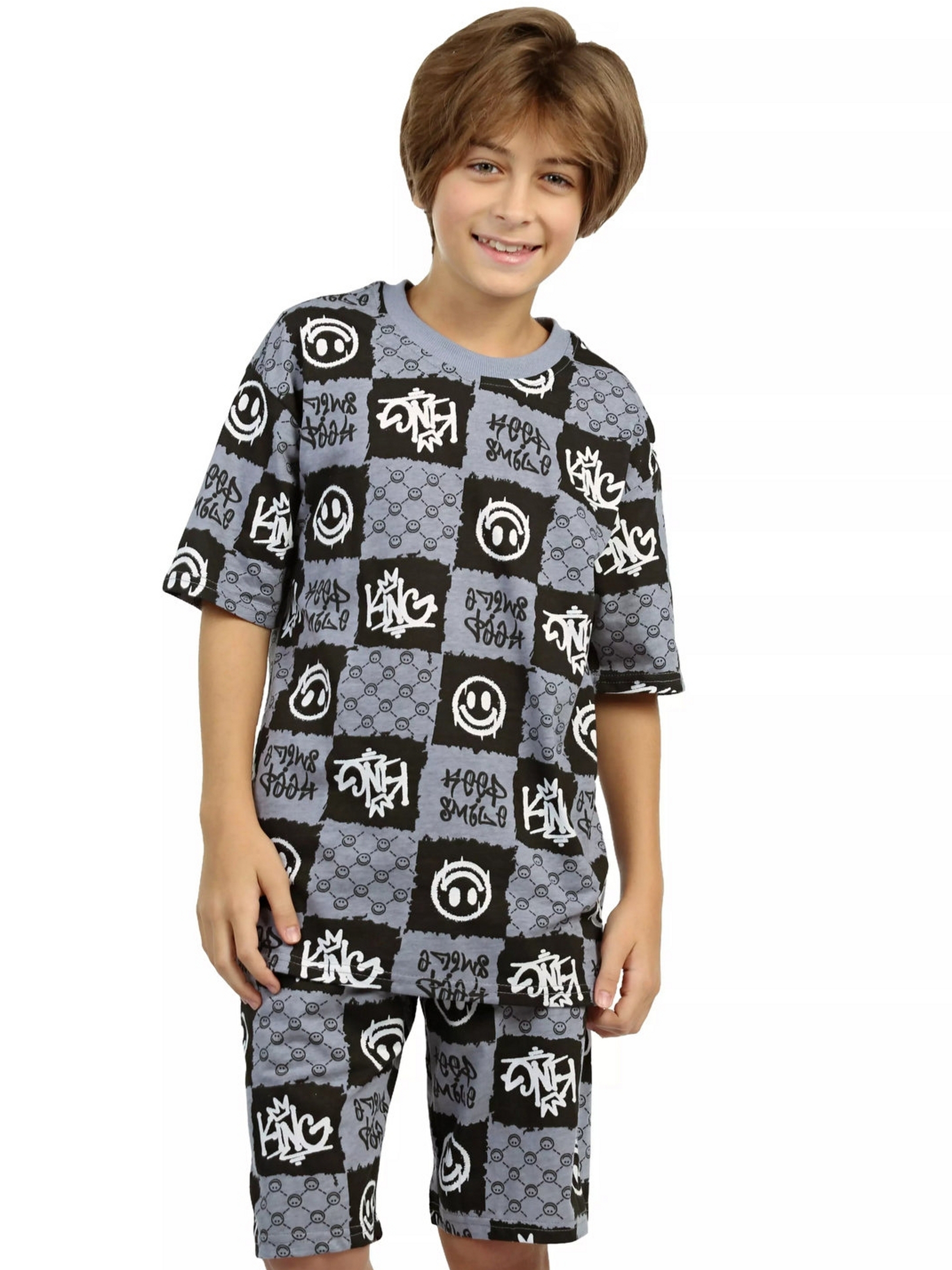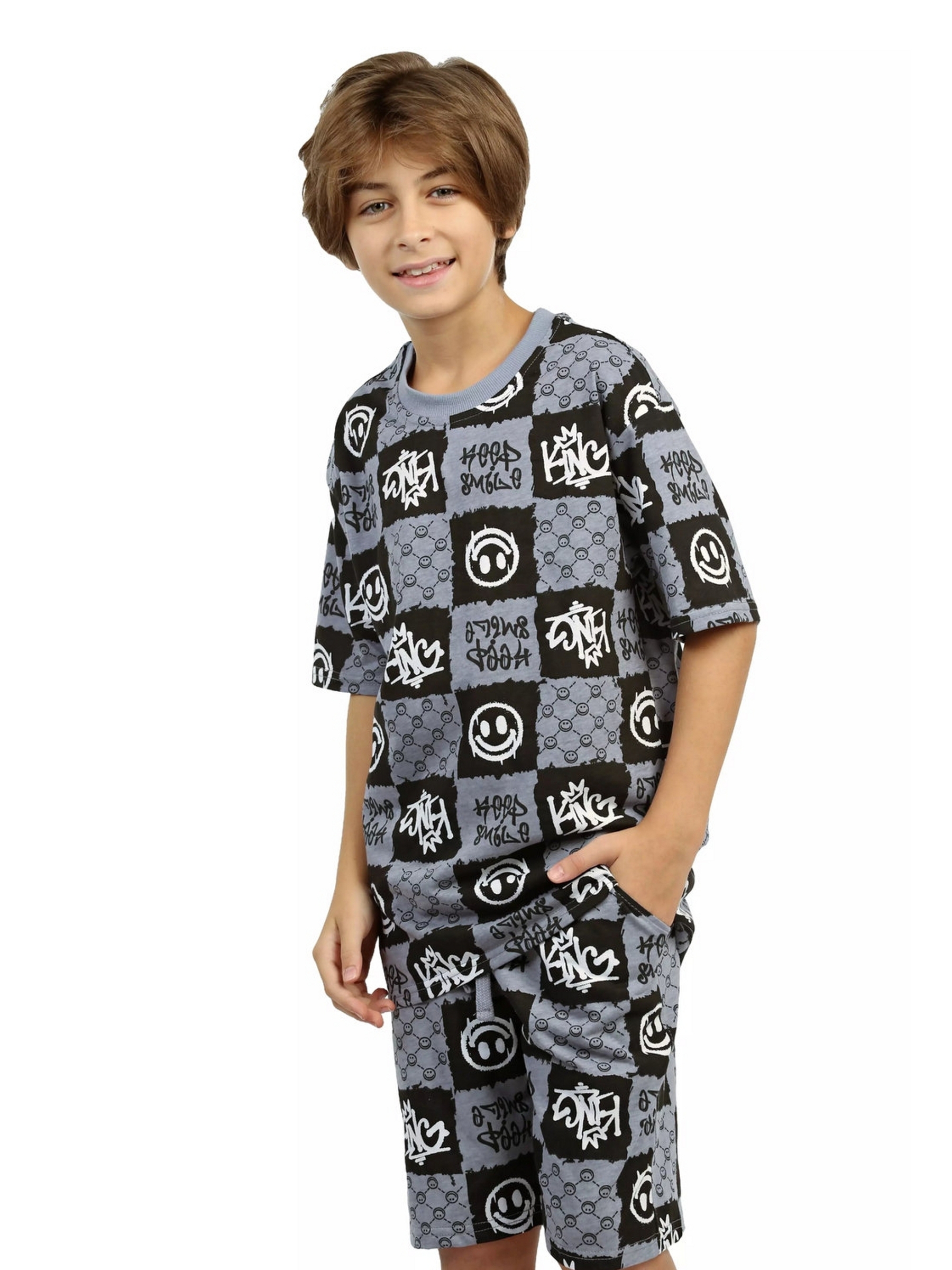Модная детская пижама для мальчиков с шортами и футболкой оверсайз серого цвета - идеальный комплект для дома и сна. Набор из двух вещей из базовой коллекции из принтованной кулирной ткани со смайликами представлен в широкой размерной сетке 134 – 164, для мальчиков и подростков. Хлопковый тонкий материал, приятный к телу, обеспечивает комфорт в носке. Свободные шорты с карманами и футболка со спущенным рукавом - это модная качественная детская одежда на каждый день. Набор из двух предметов, свободно сидящих по фигуре, подходит для полных и худеньких, высоких и невысоких детей. Оригинальная уютная пижама с декоративным рисунком станет отличным подарком на день рождения. Модель представлена в ярких сочных цвета. Интересный удобный домашний костюм подходит для демисезонного - осеннего и весеннего периода. Легкий костюм с шортами с принтом или в клеточку составит идеальный лук. Милая ночная пижамка oversize незаменима для комфортного сна в зимние и летние дни, осенью и весной. Красивая мягкая пижамная двойка с п