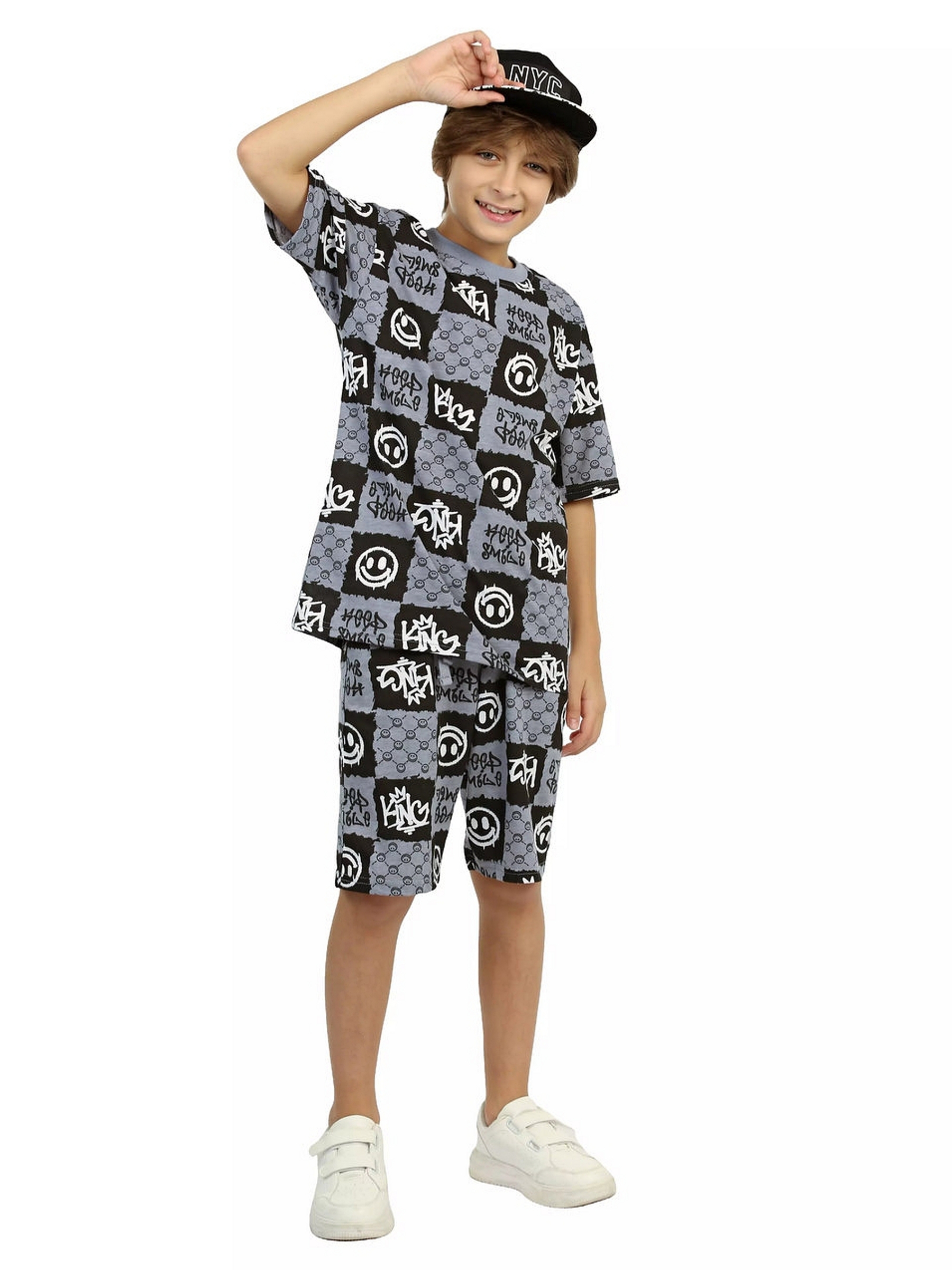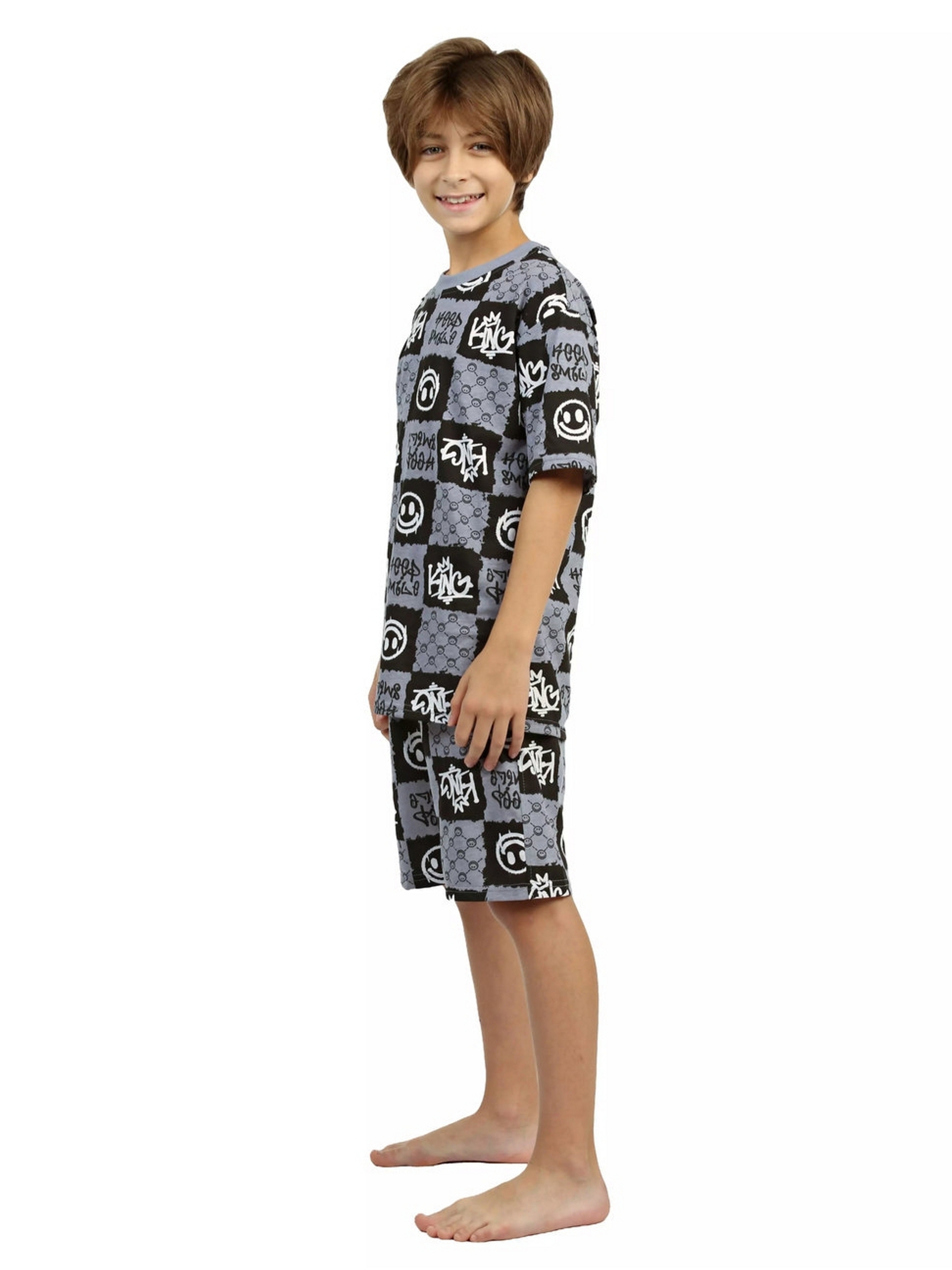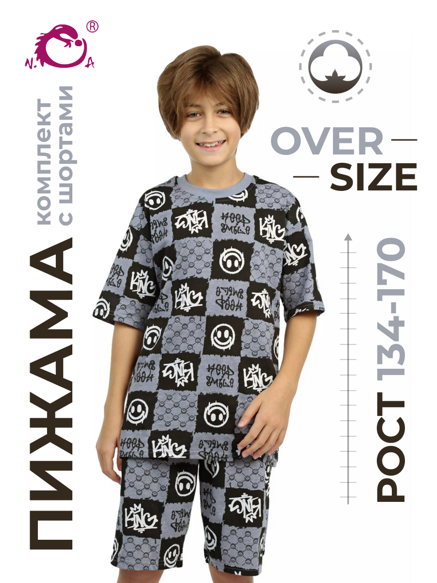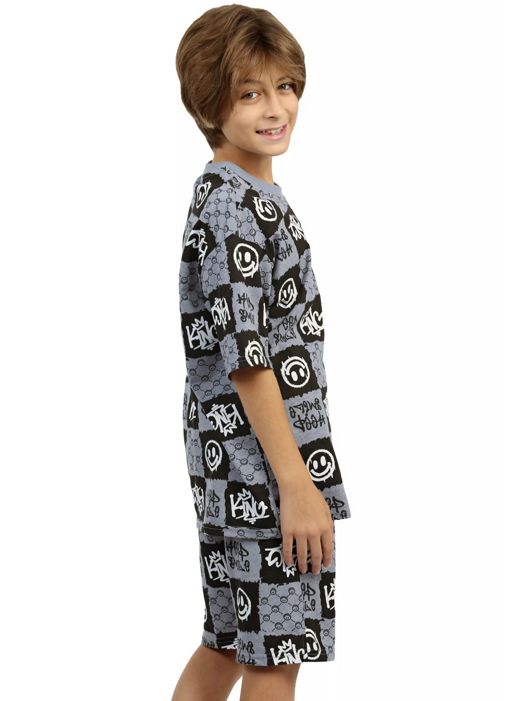Модная детская пижама для мальчиков с шортами и футболкой оверсайз серого цвета - идеальный комплект для дома и сна. Набор из двух вещей из базовой коллекции из принтованной кулирной ткани со смайликами представлен в широкой размерной сетке 134 – 164, для мальчиков и подростков. Хлопковый тонкий материал, приятный к телу, обеспечивает комфорт в носке. Свободные шорты с карманами и футболка со спущенным рукавом - это модная качественная детская одежда на каждый день. Набор из двух предметов, свободно сидящих по фигуре, подходит для полных и худеньких, высоких и невысоких детей. Оригинальная уютная пижама с декоративным рисунком станет отличным подарком на день рождения. Модель представлена в ярких сочных цвета. Интересный удобный домашний костюм подходит для демисезонного - осеннего и весеннего периода. Легкий костюм с шортами с принтом или в клеточку составит идеальный лук. Милая ночная пижамка oversize незаменима для комфортного сна в зимние и летние дни, осенью и весной. Красивая мягкая пижамная двойка с п