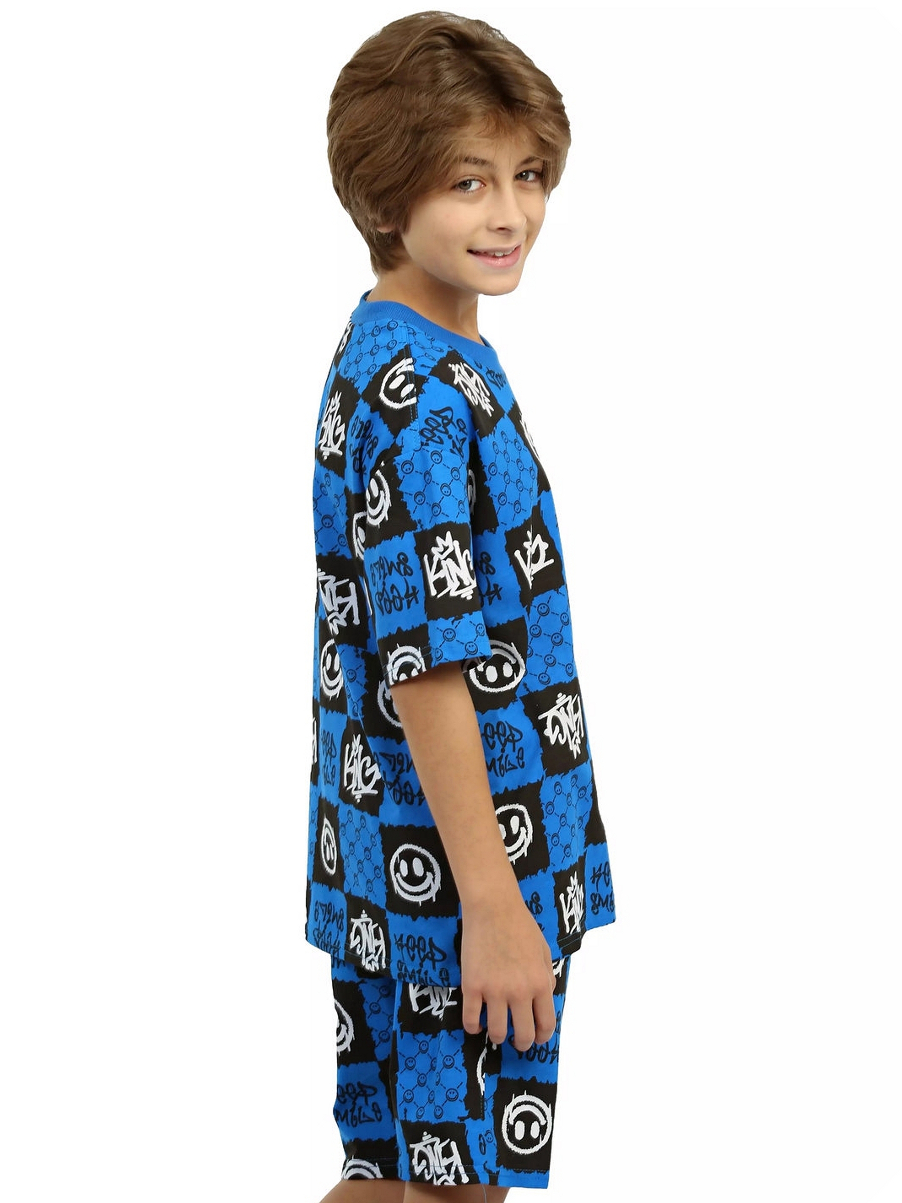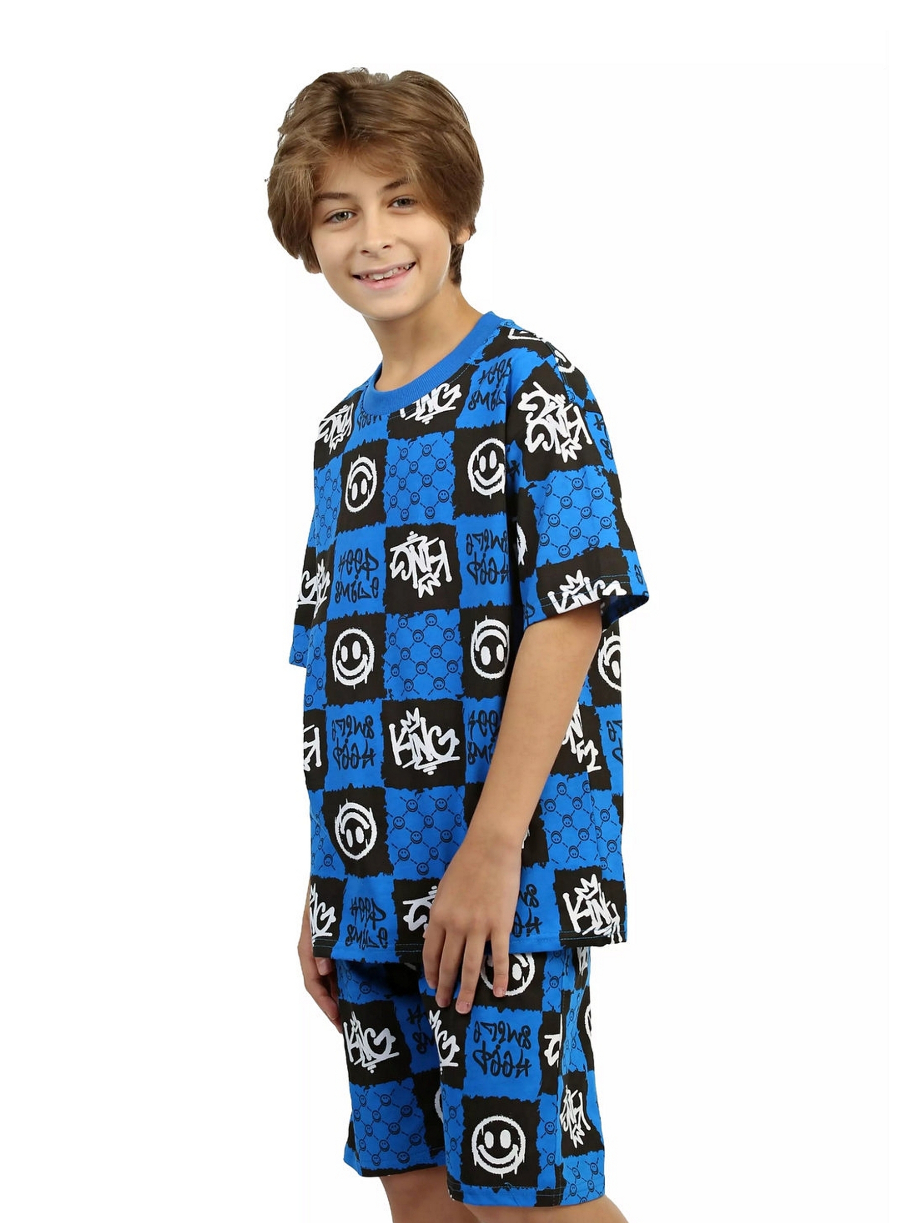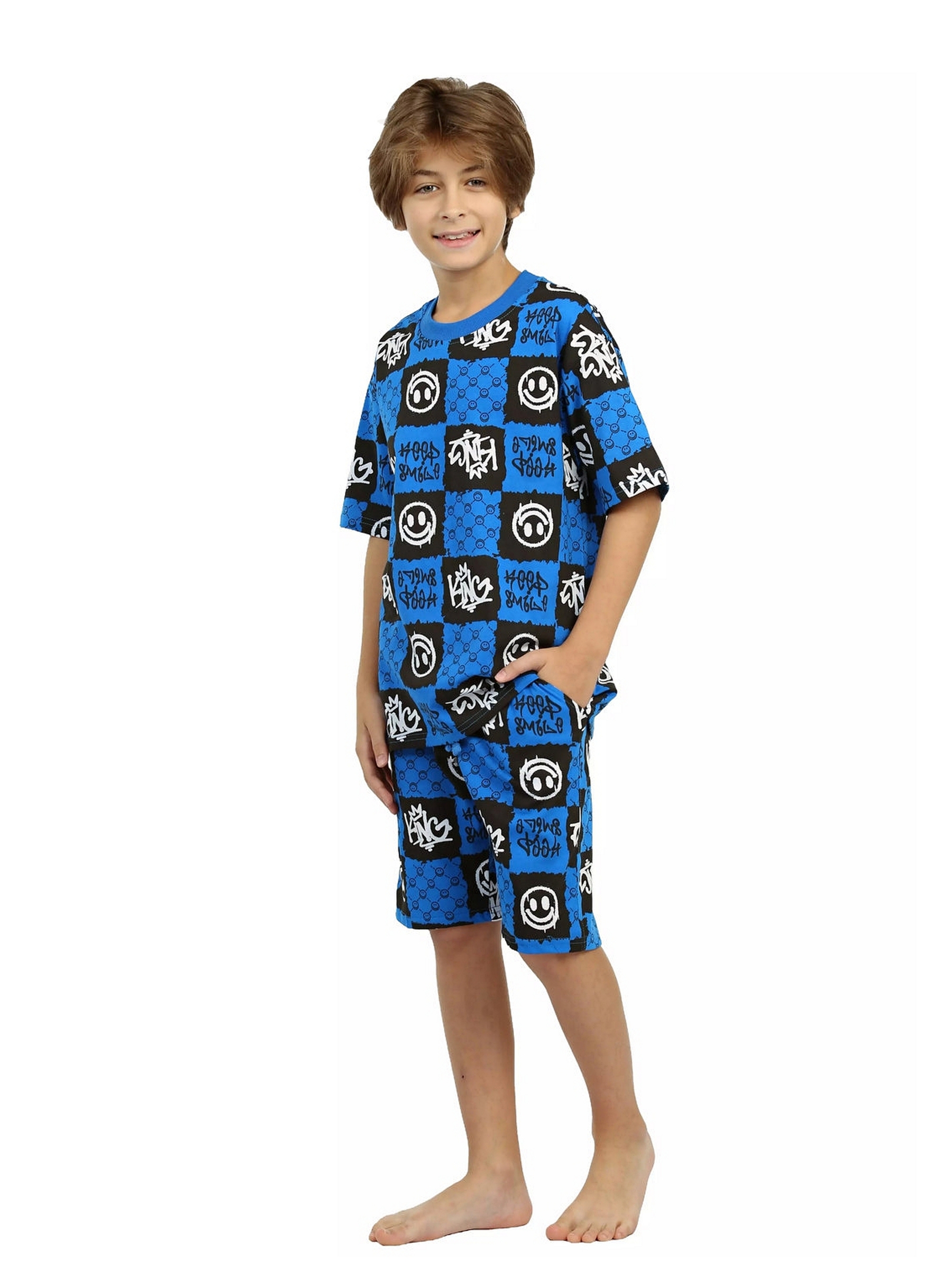 Модная детская пижама для мальчиков с шортами и футболкой оверсайз синего цвета - идеальный комплект для дома и сна. Набор из двух вещей из базовой коллекции из принтованной кулирной ткани со смайликами представлен в широкой размерной сетке 134 – 164, для мальчиков и подростков. Хлопковый тонкий материал, приятный к телу, обеспечивает комфорт в носке. Свободные шорты с карманами и футболка со спущенным рукавом - это модная качественная детская одежда на каждый день. Набор из двух предметов, свободно сидящих по фигуре, подходит для полных и худеньких, высоких и невысоких детей. Оригинальная уютная пижама с декоративным рисунком станет отличным подарком на день рождения. Модель представлена в ярких сочных цвета. Интересный удобный домашний костюм подходит для демисезонного - осеннего и весеннего периода. Легкий костюм с шортами с принтом или в клеточку составит идеальный лук. Милая ночная пижамка oversize незаменима для комфортного сна в зимние и летние дни, осенью и весной. Красивая мягкая пижамная двойка с п