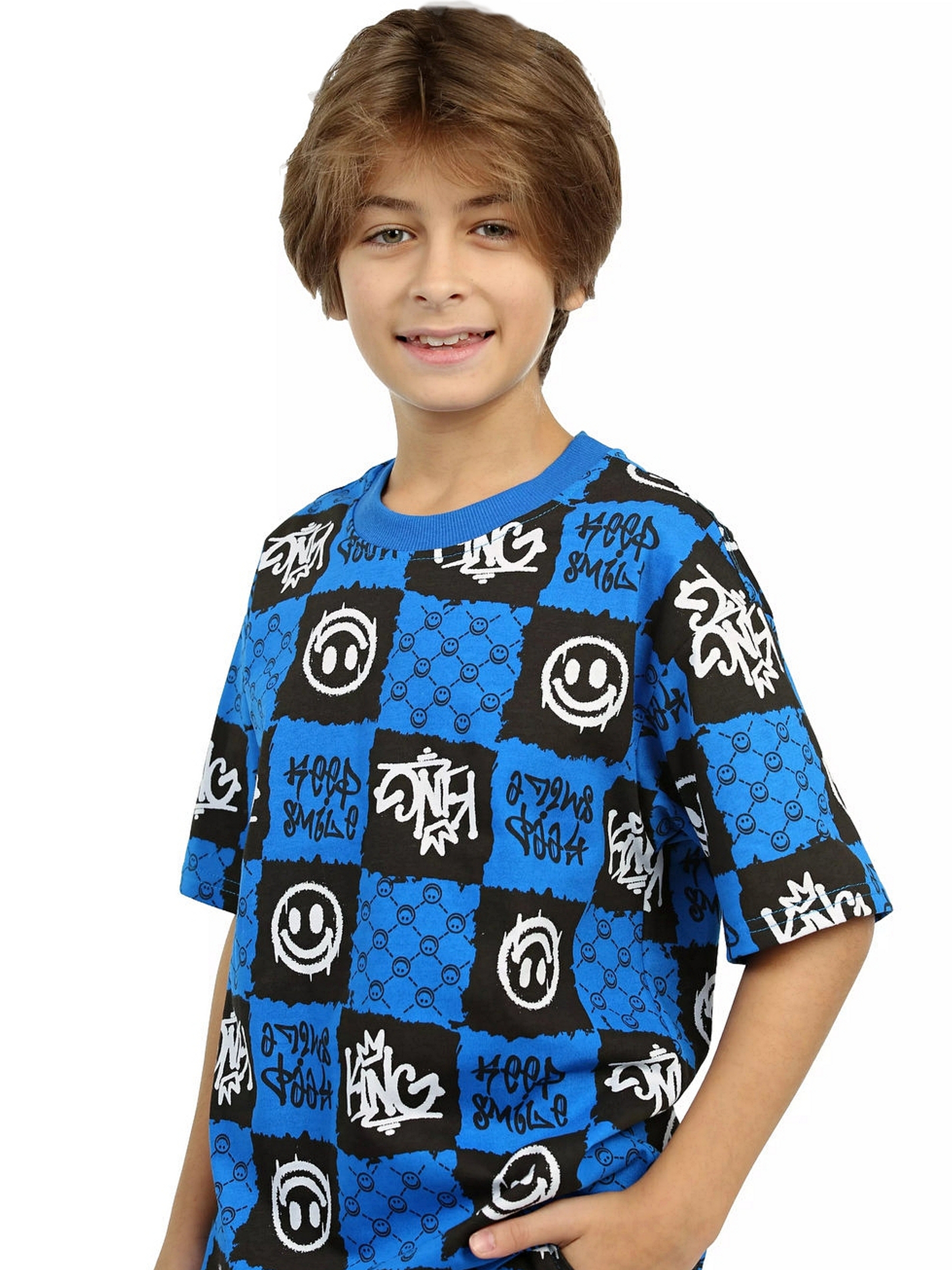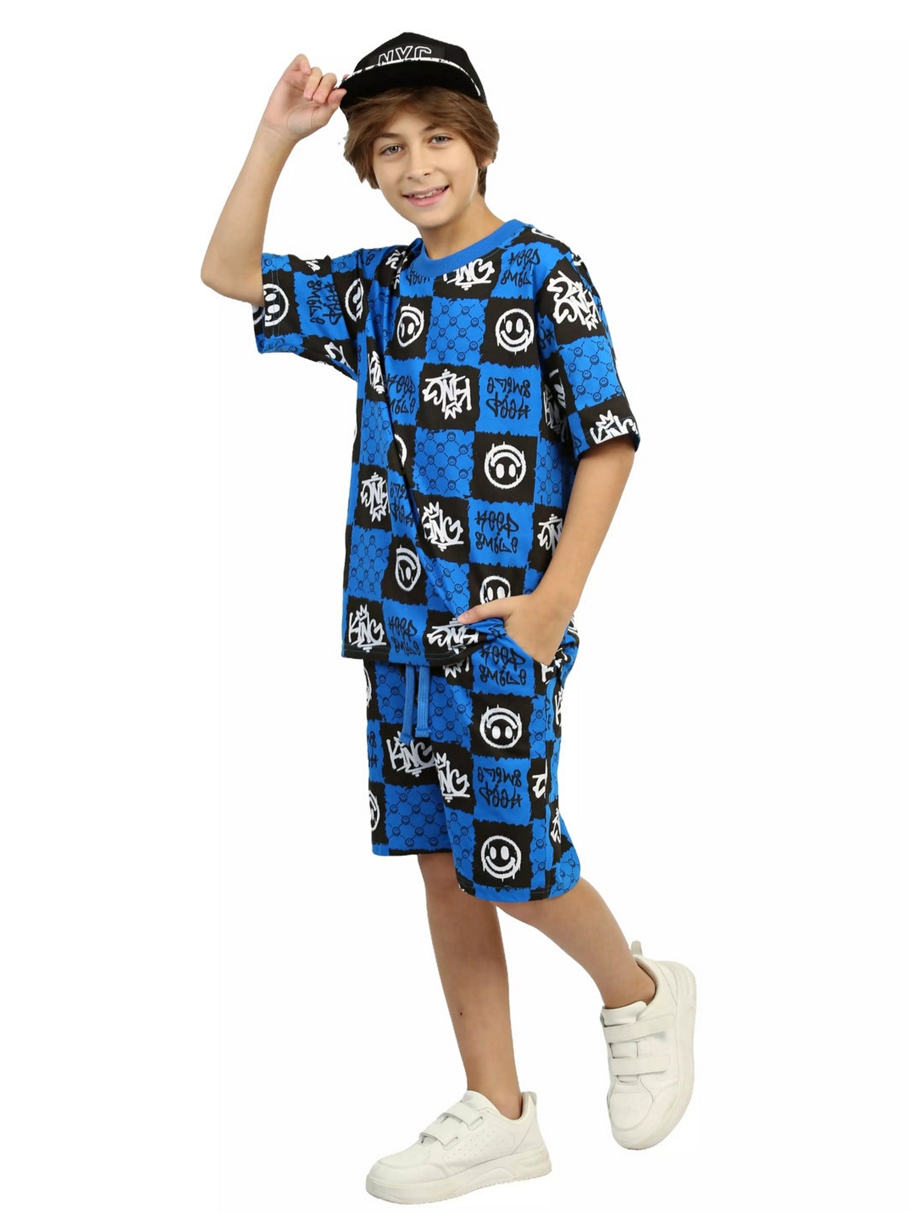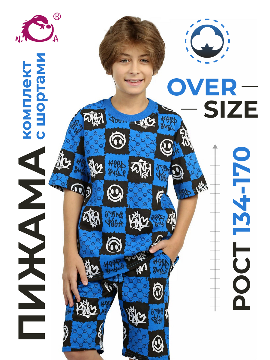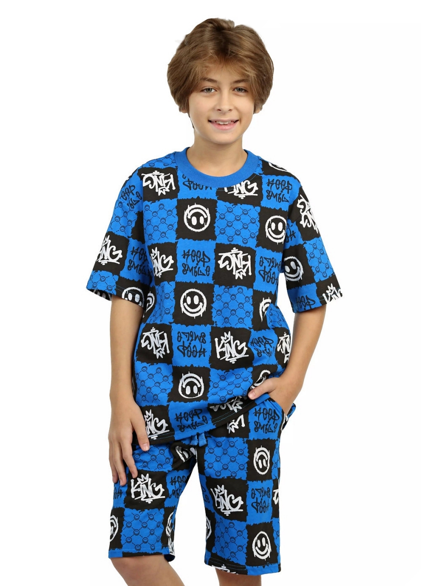 Модная детская пижама для мальчиков с шортами и футболкой оверсайз синего цвета - идеальный комплект для дома и сна. Набор из двух вещей из базовой коллекции из принтованной кулирной ткани со смайликами представлен в широкой размерной сетке 134 – 164, для мальчиков и подростков. Хлопковый тонкий материал, приятный к телу, обеспечивает комфорт в носке. Свободные шорты с карманами и футболка со спущенным рукавом - это модная качественная детская одежда на каждый день. Набор из двух предметов, свободно сидящих по фигуре, подходит для полных и худеньких, высоких и невысоких детей. Оригинальная уютная пижама с декоративным рисунком станет отличным подарком на день рождения. Модель представлена в ярких сочных цвета. Интересный удобный домашний костюм подходит для демисезонного - осеннего и весеннего периода. Легкий костюм с шортами с принтом или в клеточку составит идеальный лук. Милая ночная пижамка oversize незаменима для комфортного сна в зимние и летние дни, осенью и весной. Красивая мягкая пижамная двойка с п
