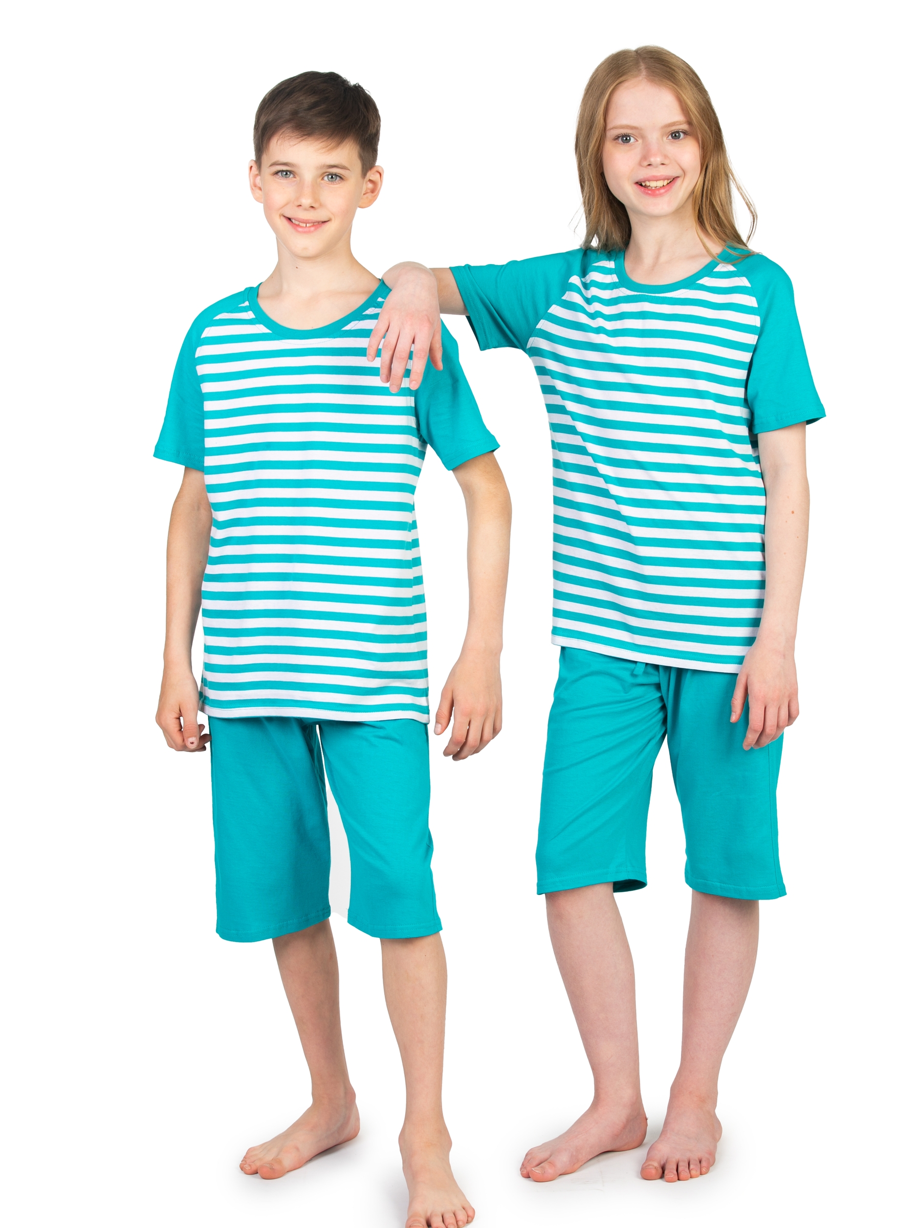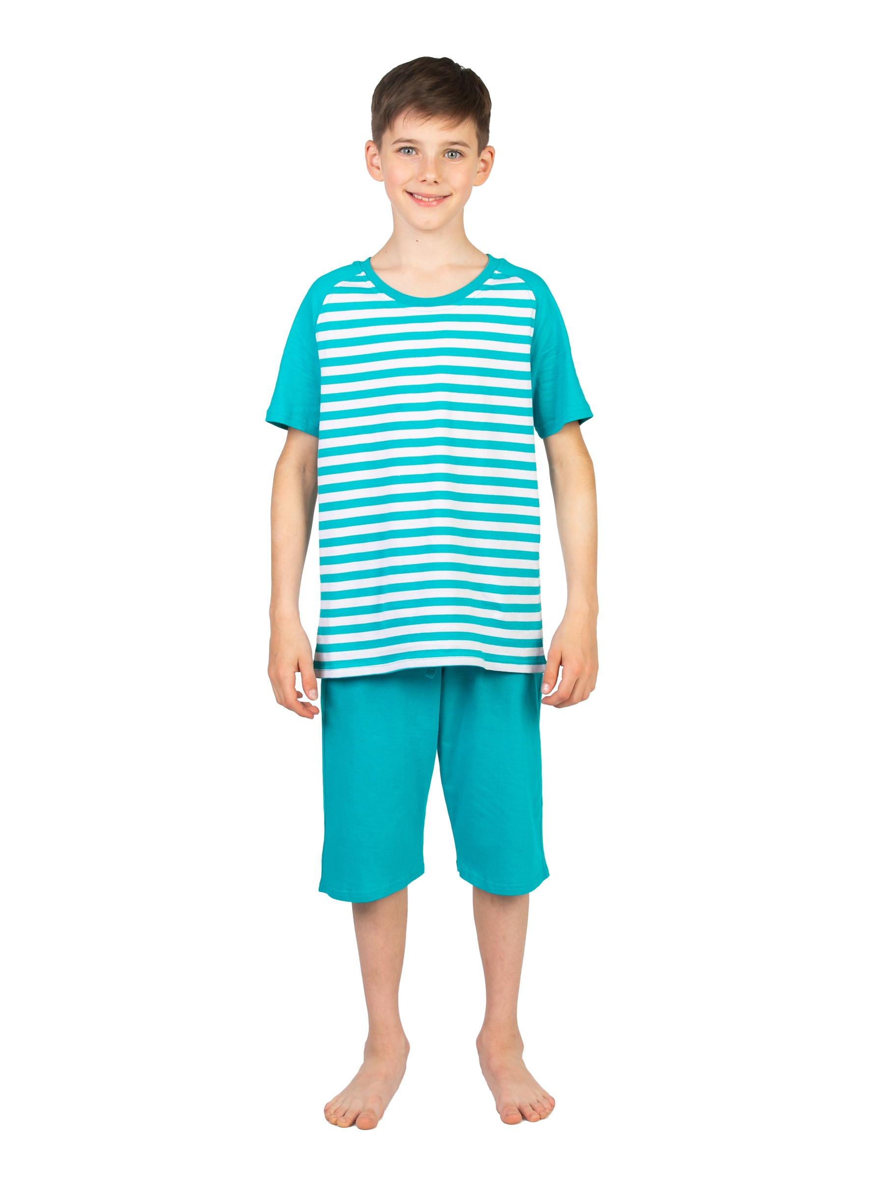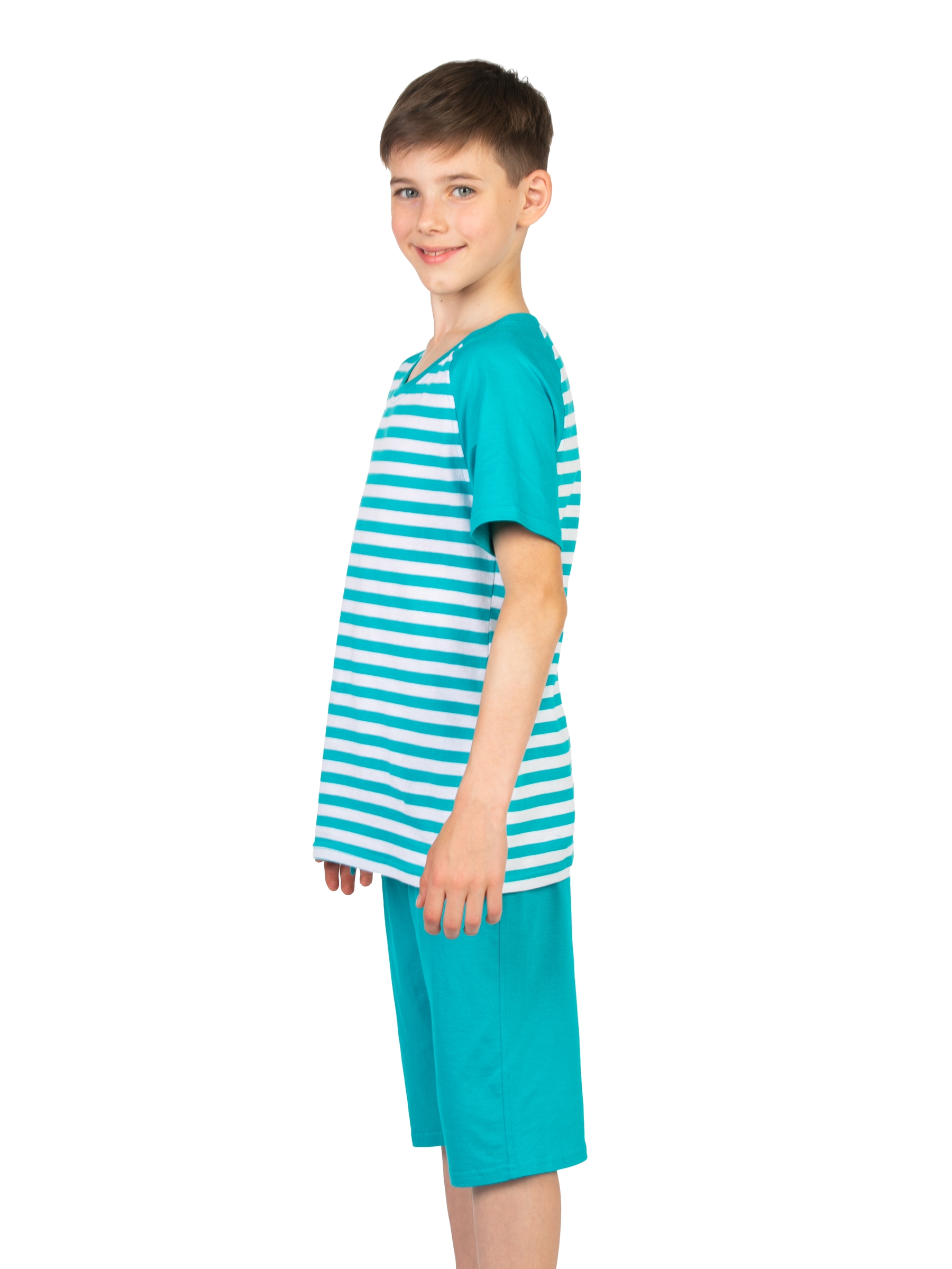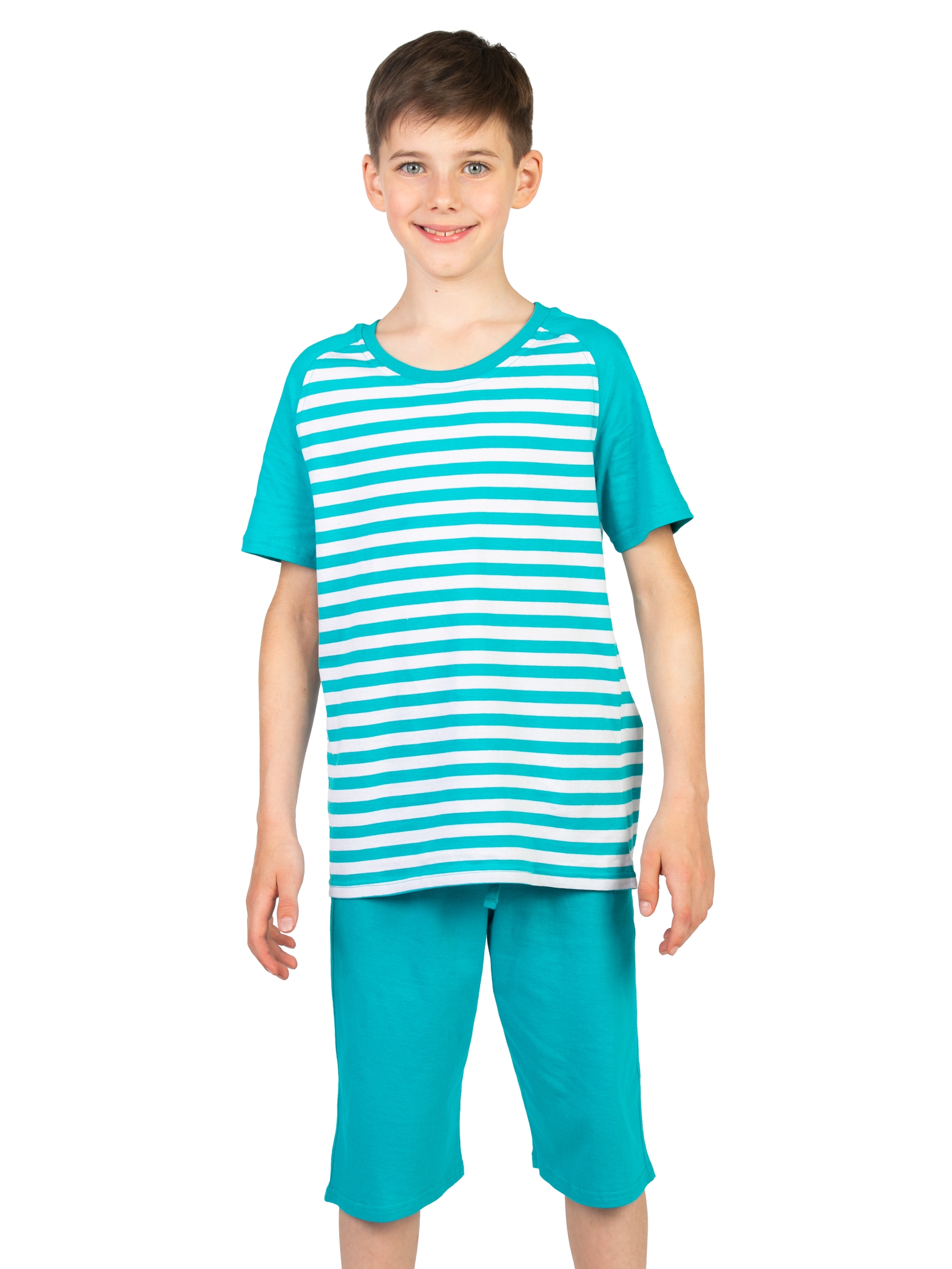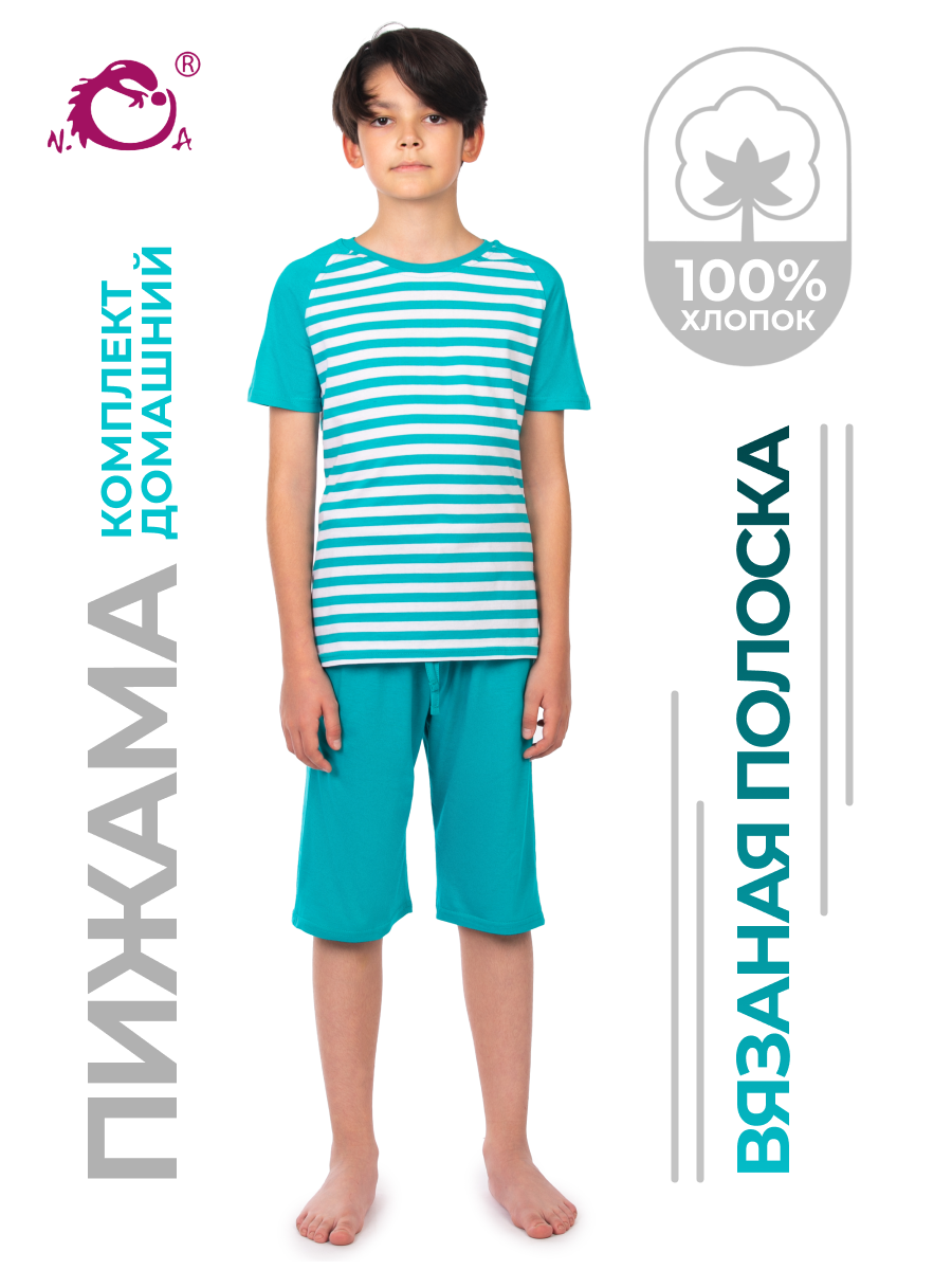 Детская пижама для мальчика бирюзового цвета в полоску - милая, смешная и самое главное удобная одежда для дома и не только. Двойка включает в себя шорты и футболку с принтом в полосочку. Футболка с короткими рукавами свободного прямого кроя. Длинные шортики на удобной резинке. Ночной пижамный костюм легкий без начеса и утепления. Домашняя одежда сшита из 100% натурального хлопка. Мягкая хлопковая пижамка хорошо пропускает воздух, позволяет телу дышать. Домашний костюм актуален для любого времени года, в том числе на осенний период и на зимний отопительный сезон. Ребенку будет удобно в одежде в любое время суток. Ночью - пижамка обеспечит комфорт во время сна. А днем - для игр и активного времяпрепровождения дома. Эстетичная полосатая пижамка отлично подойдет для детского садика, в том числе для дневного сна в саду. Футболка в полоску и шорты - красивый костюмчик в морском стиле, в котором Ваш сын или дочка будут замечательно выглядеть на всех фотографиях из садика. Расцветка актуальна для мальчиков и девоч