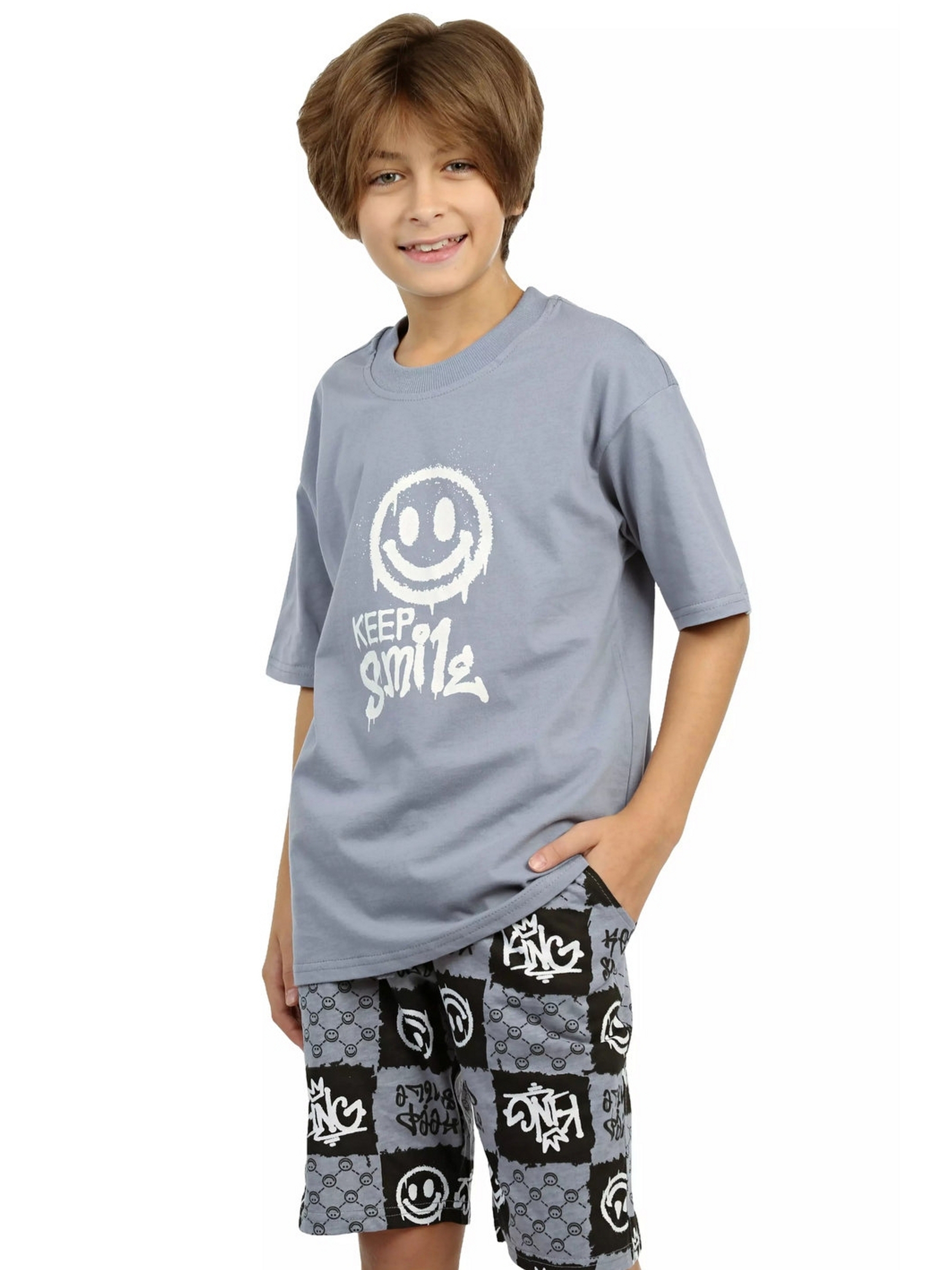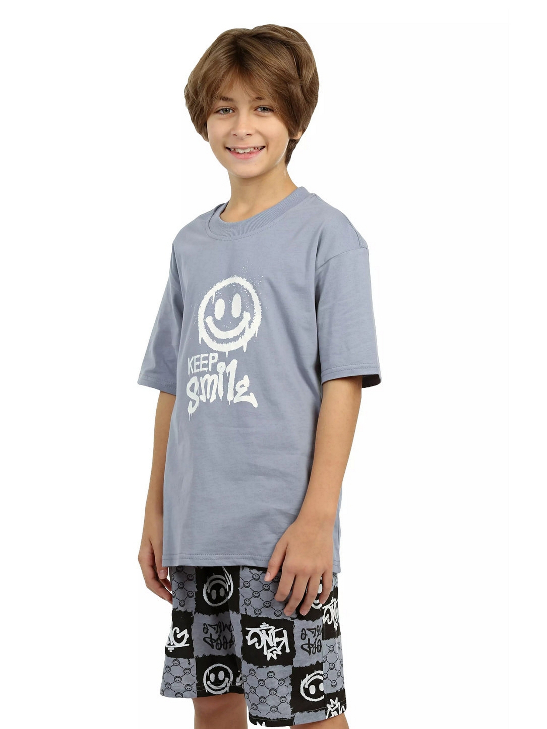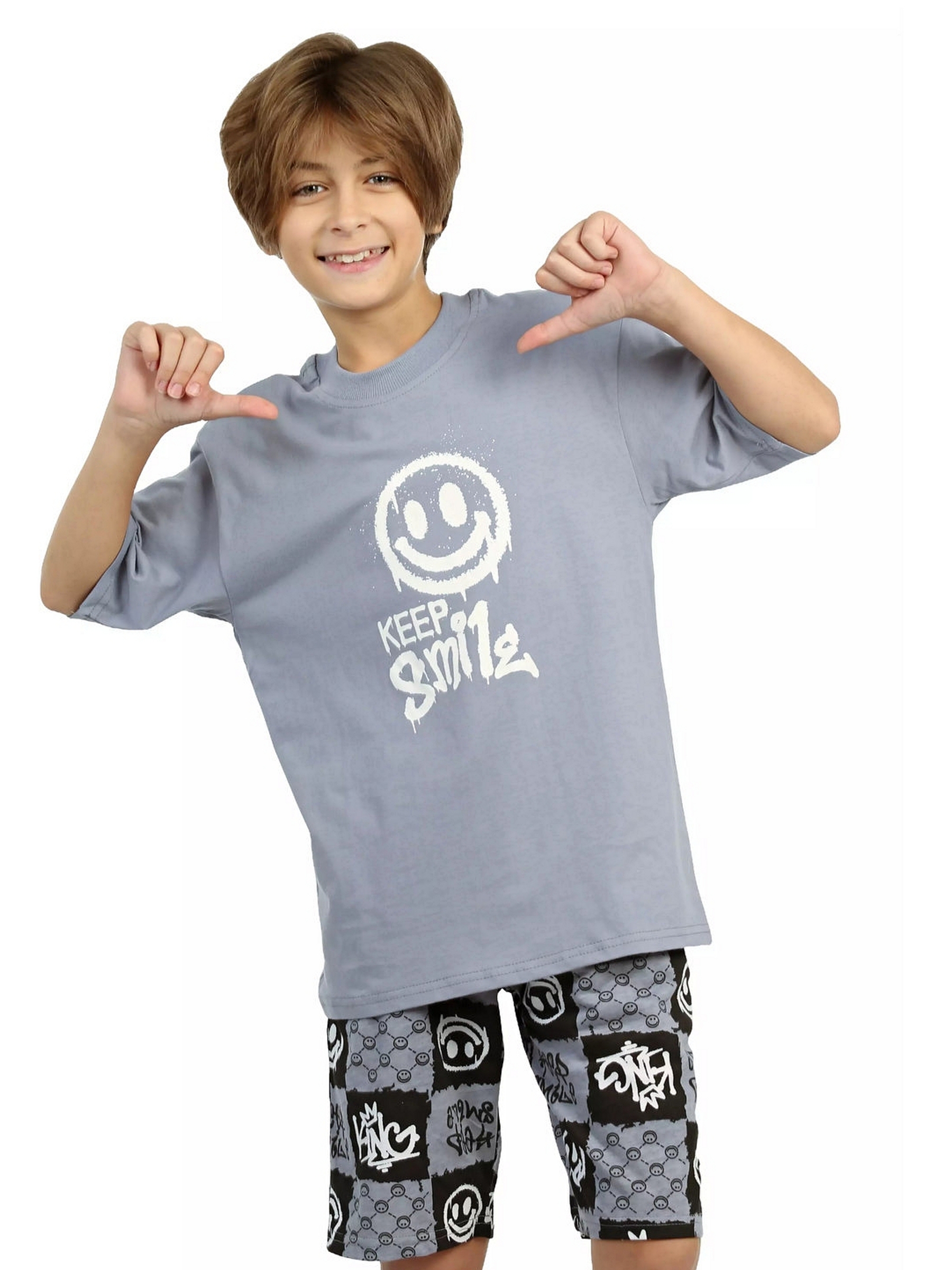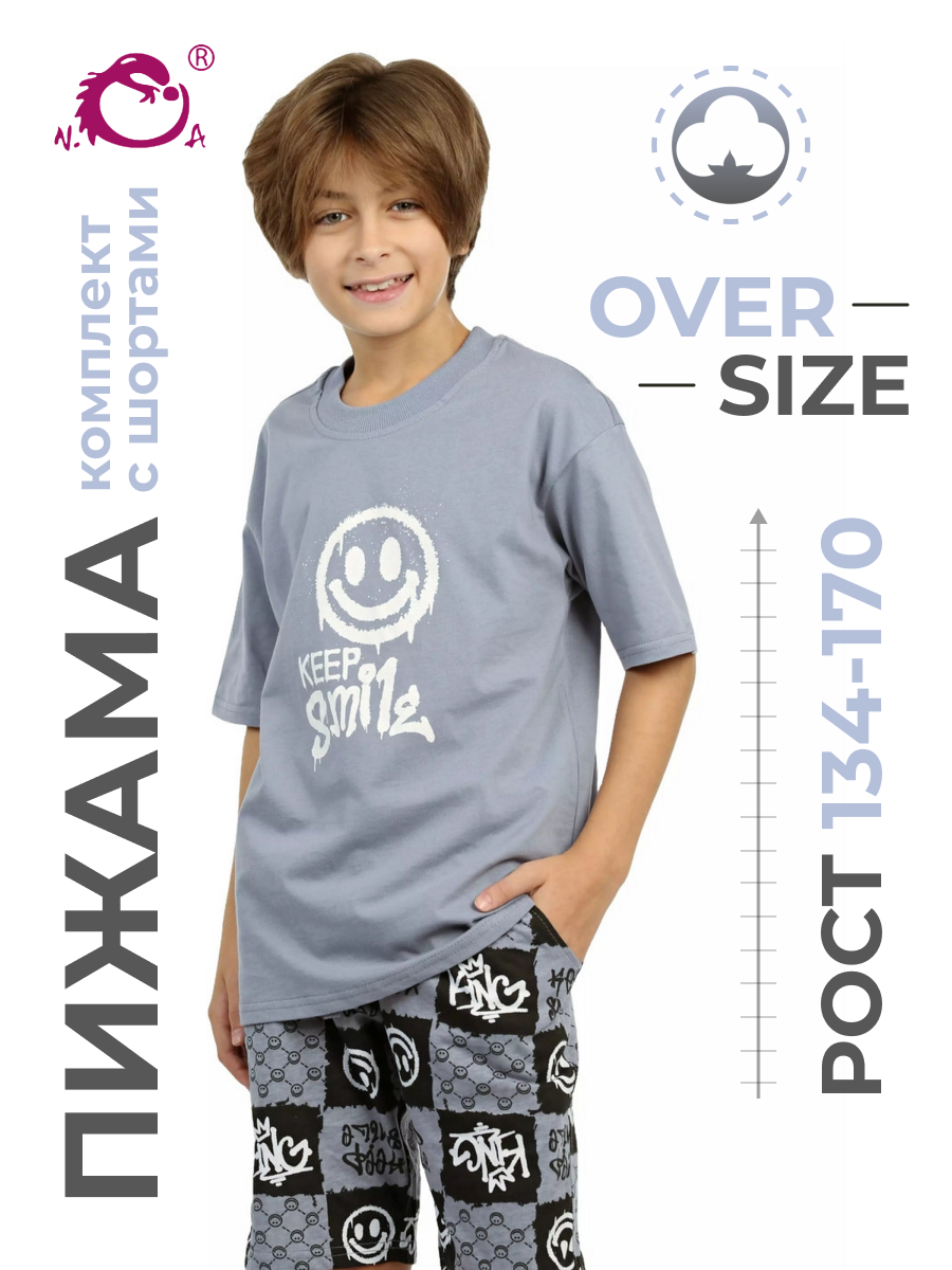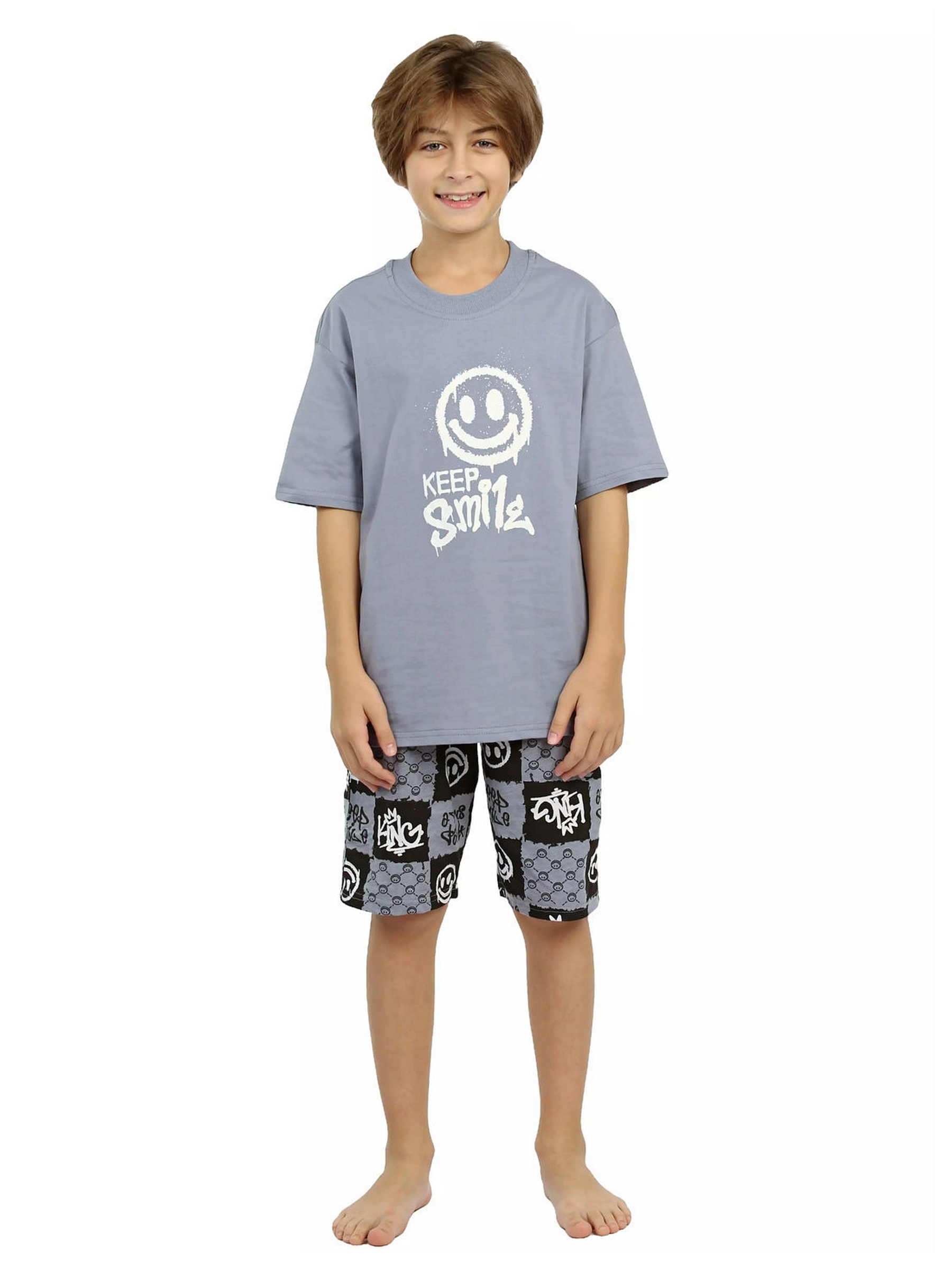Модная детская пижама для мальчиков с шортами и футболкой оверсайз серого цвета - идеальный комплект для дома и сна. Набор из двух вещей из базовой коллекции с ярким принтом представлен в широкой размерной сетке 134 – 164, для мальчиков и подростков. Хлопковый тонкий материал, приятный к телу, обеспечивает комфорт в носке. Свободные шорты с карманами и футболка со спущенным рукавом - это модная качественная детская одежда на каждый день. Комплект из двух предметов, свободно сидящих по фигуре, подходит для полных и худеньких, высоких и невысоких детей. Оригинальная уютная пижама со смайликами станет отличным подарком на день рождения. Модель представлена в ярких сочных цветах с разными принтами. Интересный удобный домашний костюм подходит для демисезонного - осеннего и весеннего периода. Легкий костюм с шортами с принтом или в клеточку составит идеальный лук. Милая ночная пижамка oversize незаменима для комфортного сна в зимние и летние дни, осенью и весной. Красивая мягкая пижамная двойка с популярными рисун