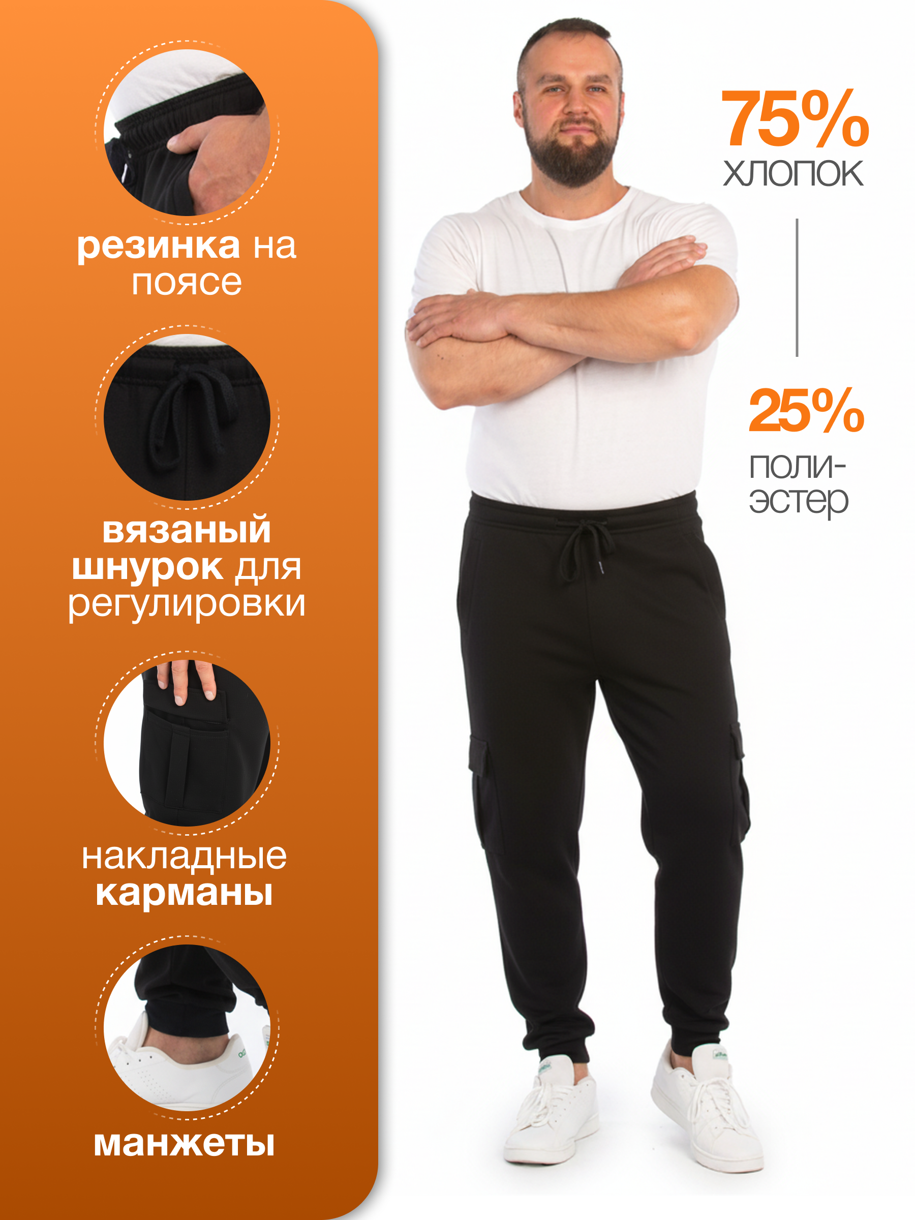 Мужские брюки cargo —отличное решение для повседневного образа и активного отдыха. Спортивные джоггеры сочетают в себе элементы трикотажного и спортивного стиля, позволяя чувствовать себя комфортно в любой ситуации. Крой карго отличается простотой и универсальностью, а широкие накладные карманы добавляют практичности, что делает их незаменимыми для походов или рыбалки. Штаны изготавливаются из хлопка с добавлением полиэстера, для сохранения цвета и формы брюк, что не стесняют движений, очень комфортны в носке. Они обеспечивают удобство как при занятиях спортом, так и в домашних условиях. Подойдут для занятий в зале или просто для отдыха дома. Резинка на поясе и шнуровка позволяют регулировать посадку по фигуре, чтобы штаны точно сидели на своем месте. Такая конструкция обеспечивает свободу движений и не ограничивает ваши действия как в спортзале, так и во время прогулок на свежем воздухе. Трикотажный стиль брюк прекрасно смотрится как весной и летом, так и осенью-зимой благодаря своей демисезонности. Цветовые