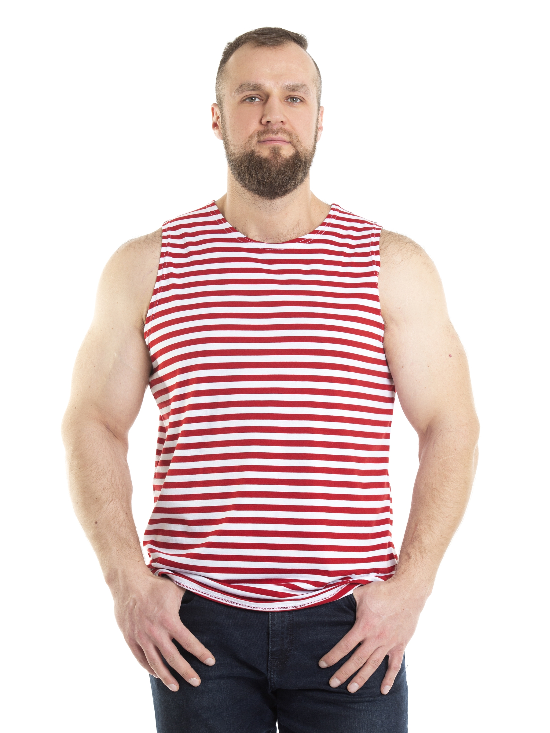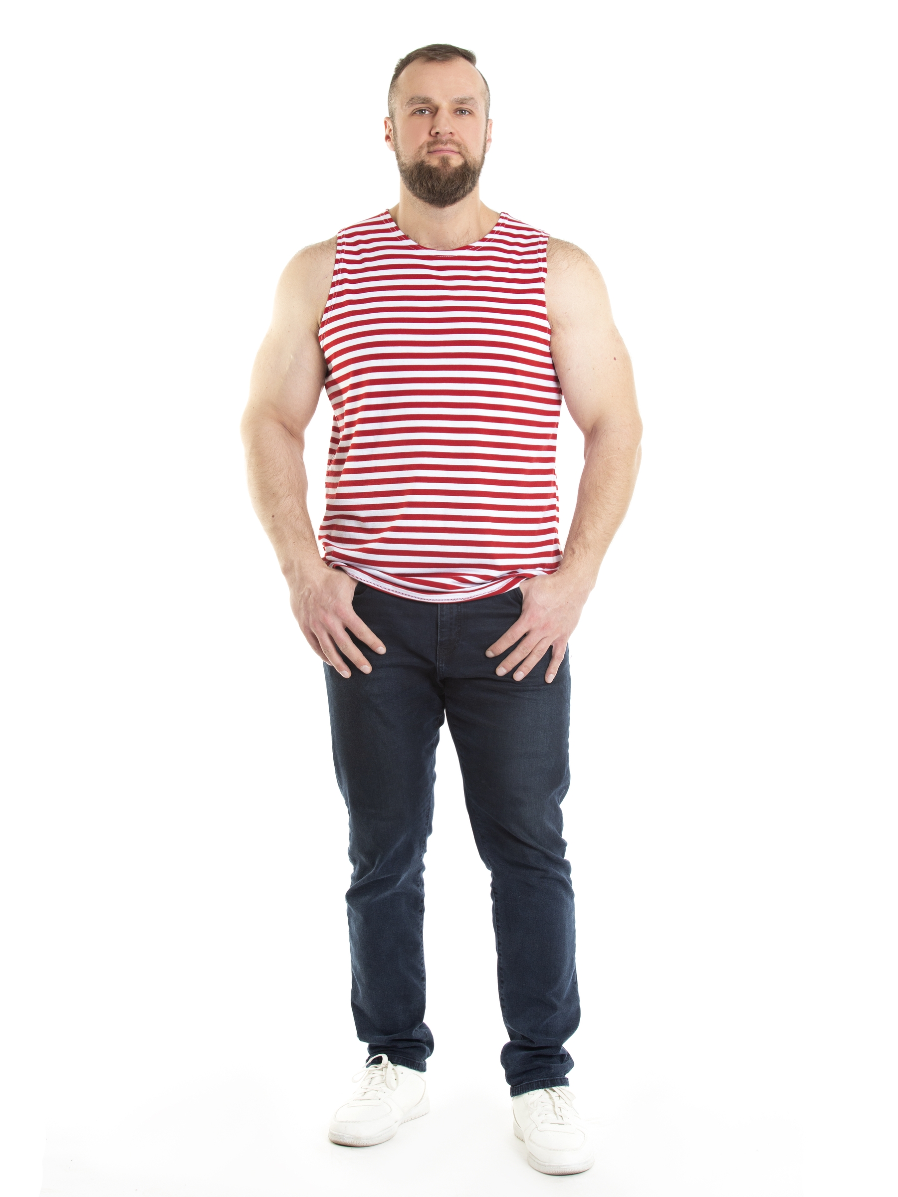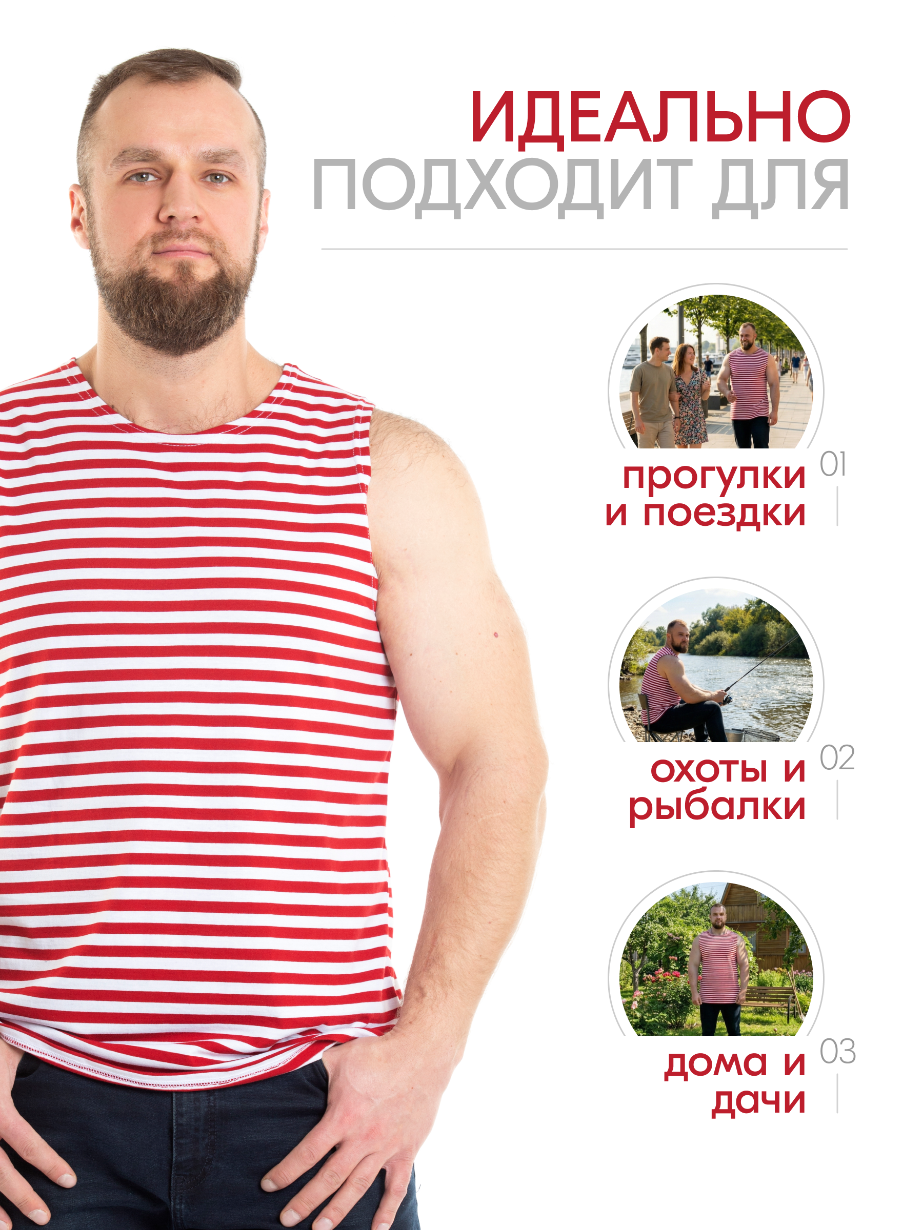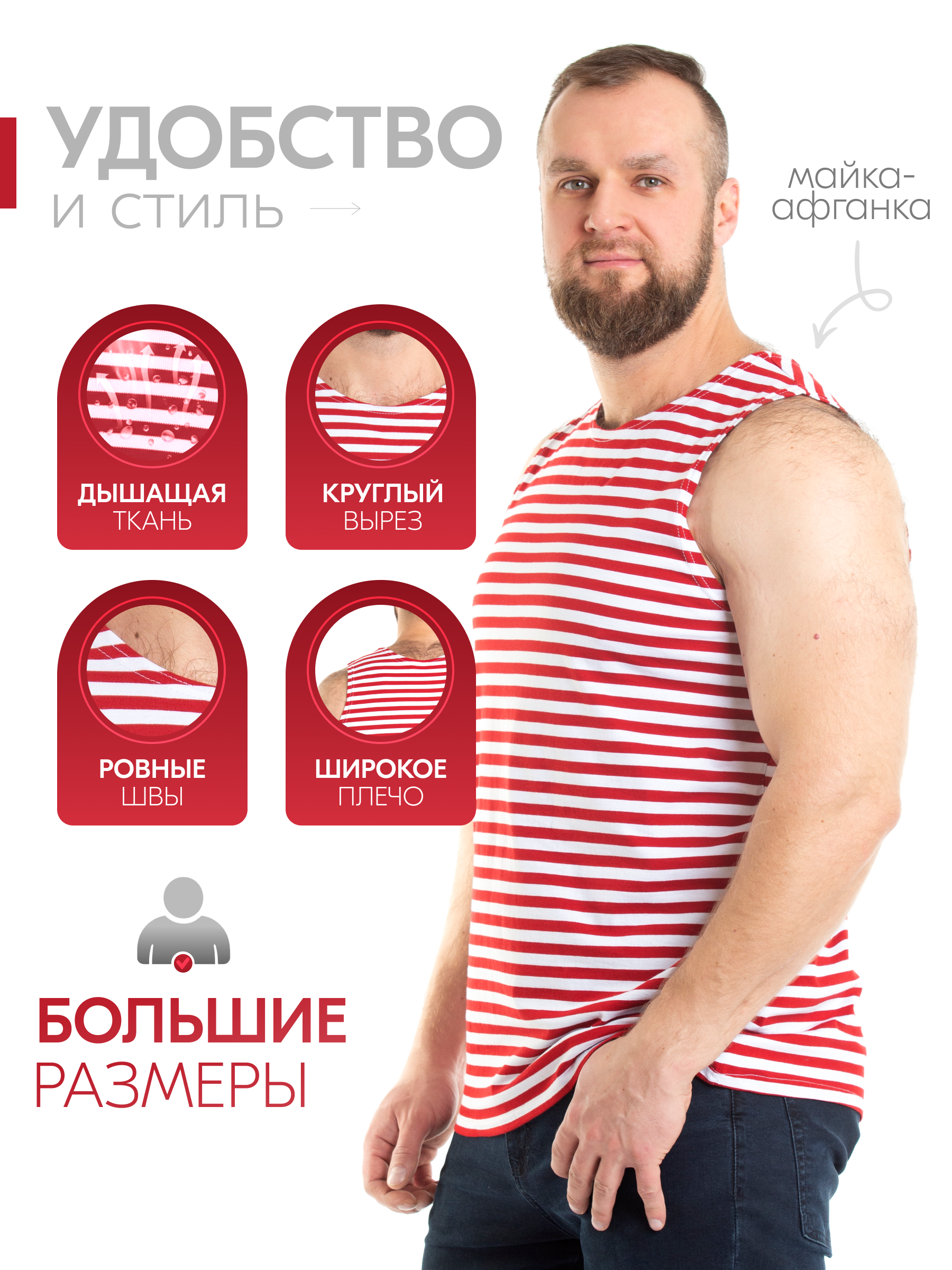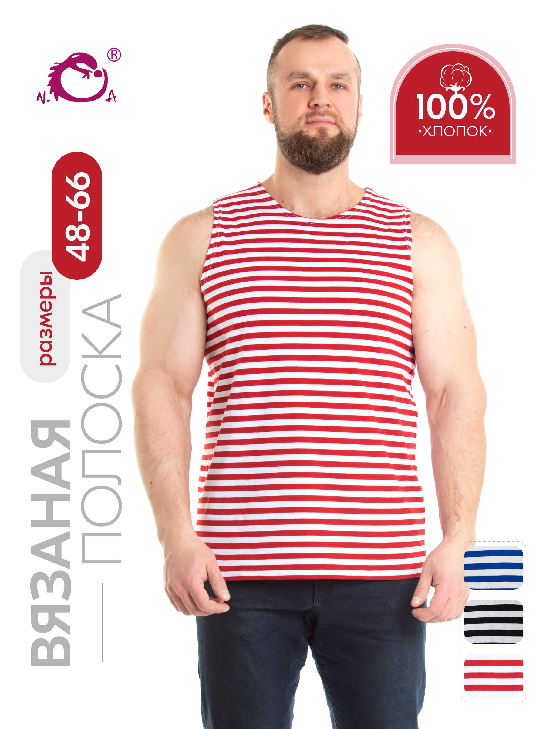 Мужская майка-тельняшка красного цвета обязательный элемент гардероба парня подростка и взрослого мужчины. Майка выполнена из натурального 100% хлопка, округлый ворот. Ткань мягкая и приятная в носке, не стесняет движений. Универсальный фасон прямого кроя - модный тренд и неизменная классика мужской моды. Майка тельняшка с вязанной красной полоской станет прекрасным выбором для брата или друга. Их можно носить в любое время года: летом как самостоятельный предмет одежды, зимой как нижний слой под футболку или свитер. Мягкий трикотаж дарит ощущение свежести и комфорта. Благодаря свойствам хб материала это отличная форма для тренировок в спортзале. Хлопковая майка в полоску пригодится в качестве домашней одежды для носки дома и на отдыхе. Мужская тельняшка незаменимая базовая вещь в гардеробе, для охотника и любителя рыбалки – одежда для настоящих мужчин. Благодаря классической расцветке, такая борцовка вписывается в милитари стиль и незаменима в армии. Она станет ярким акцентом в гардеробе молодого человека в