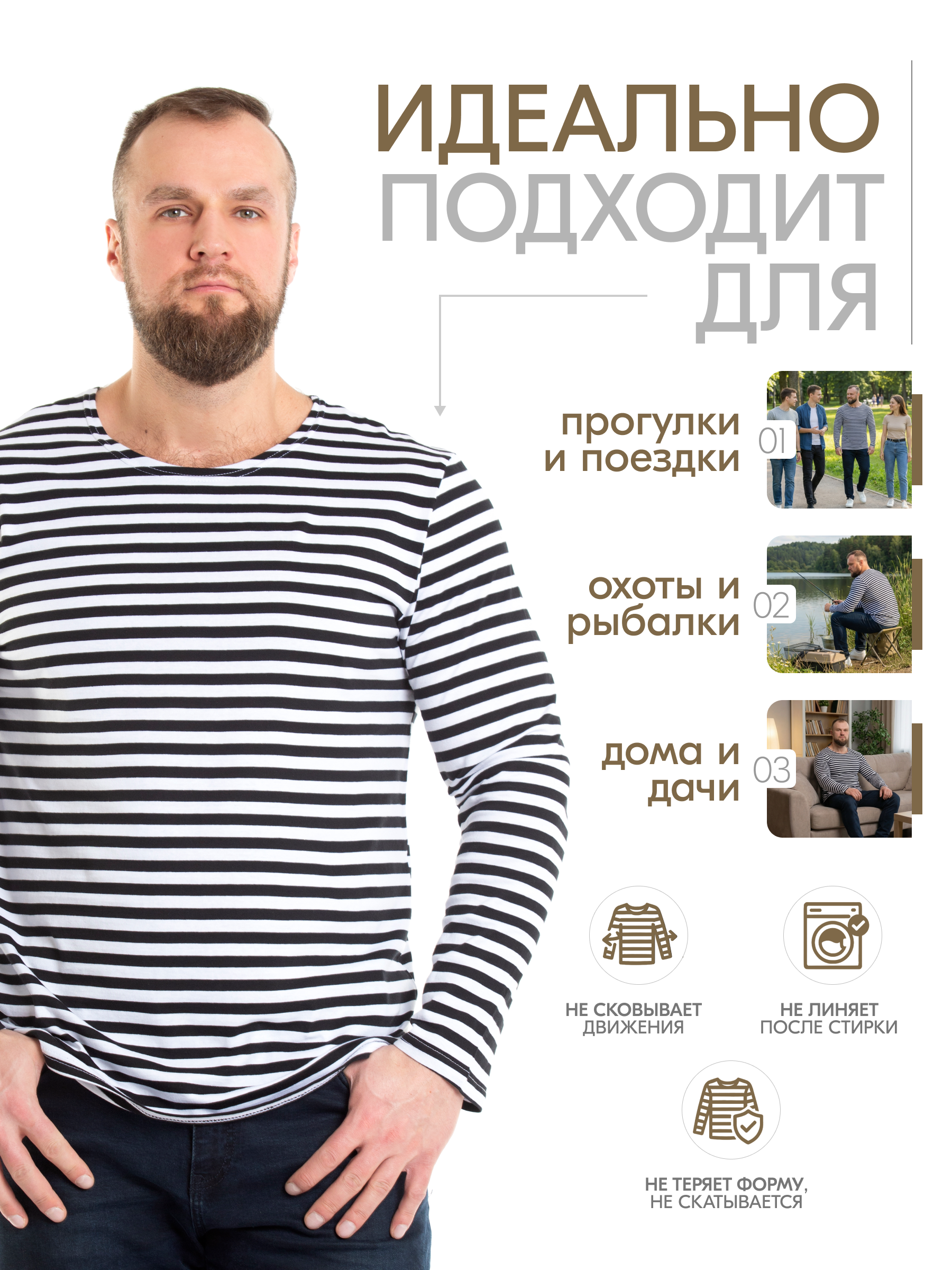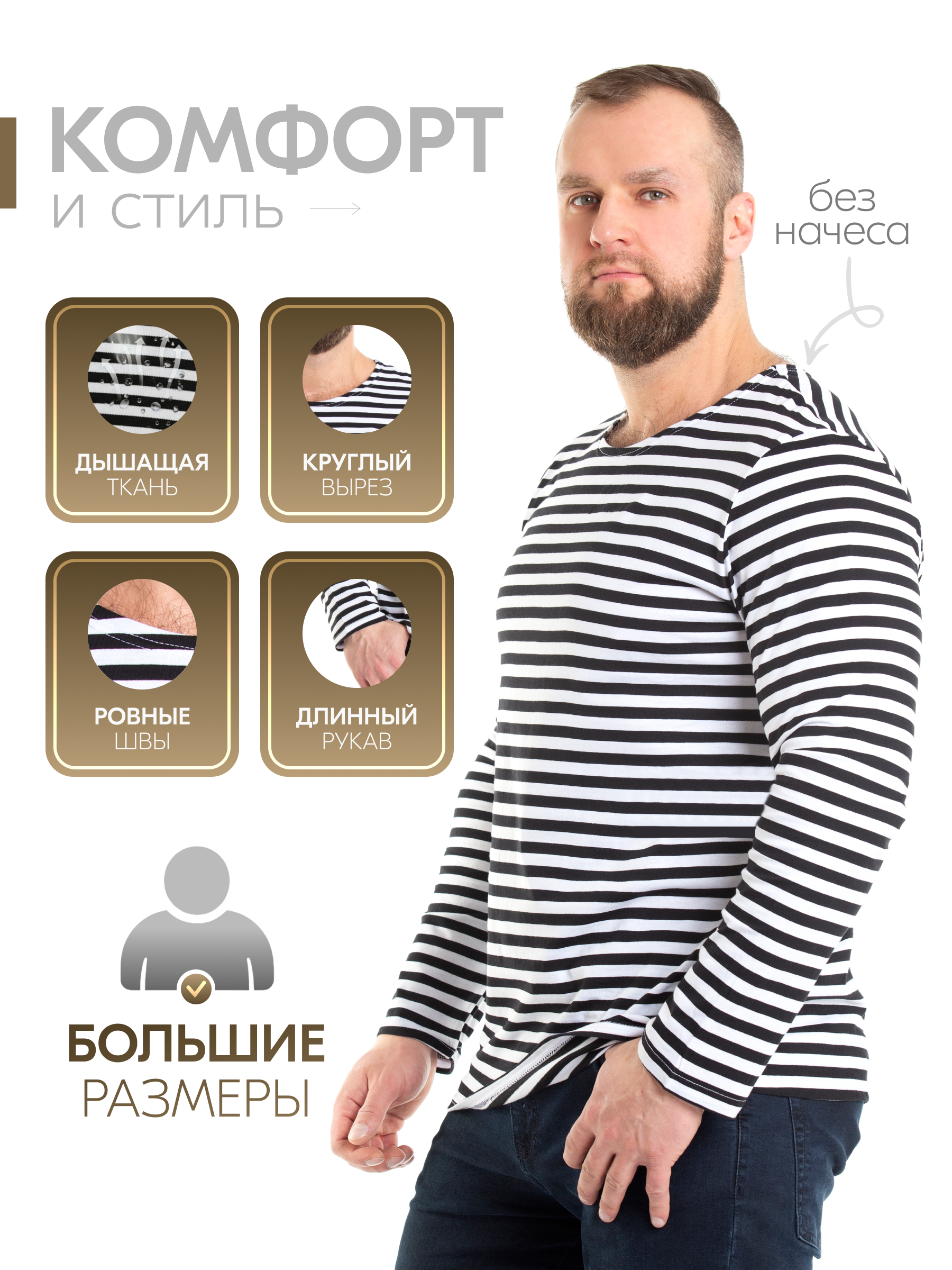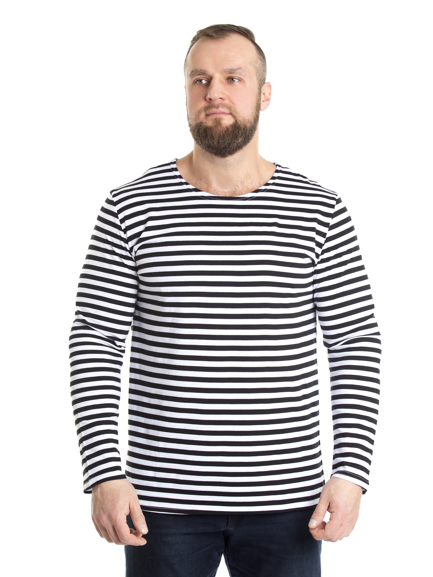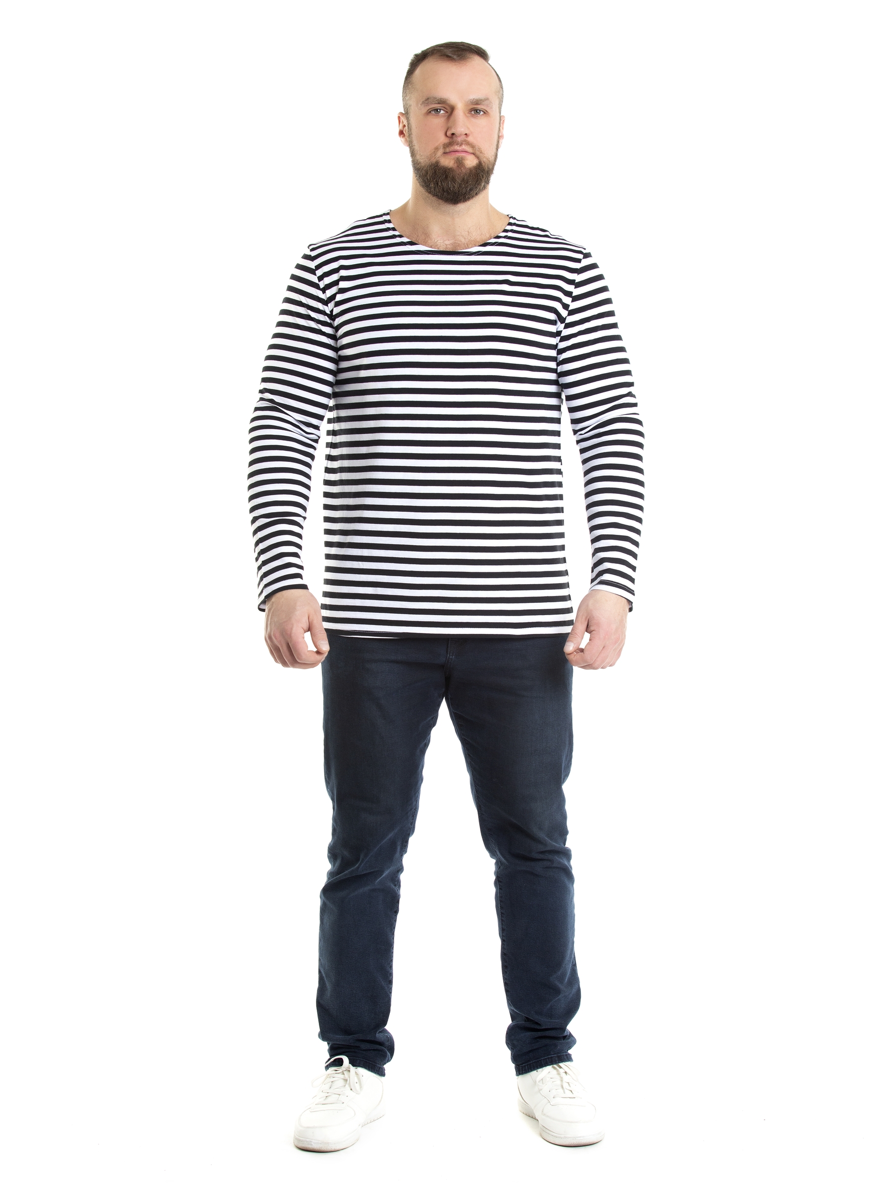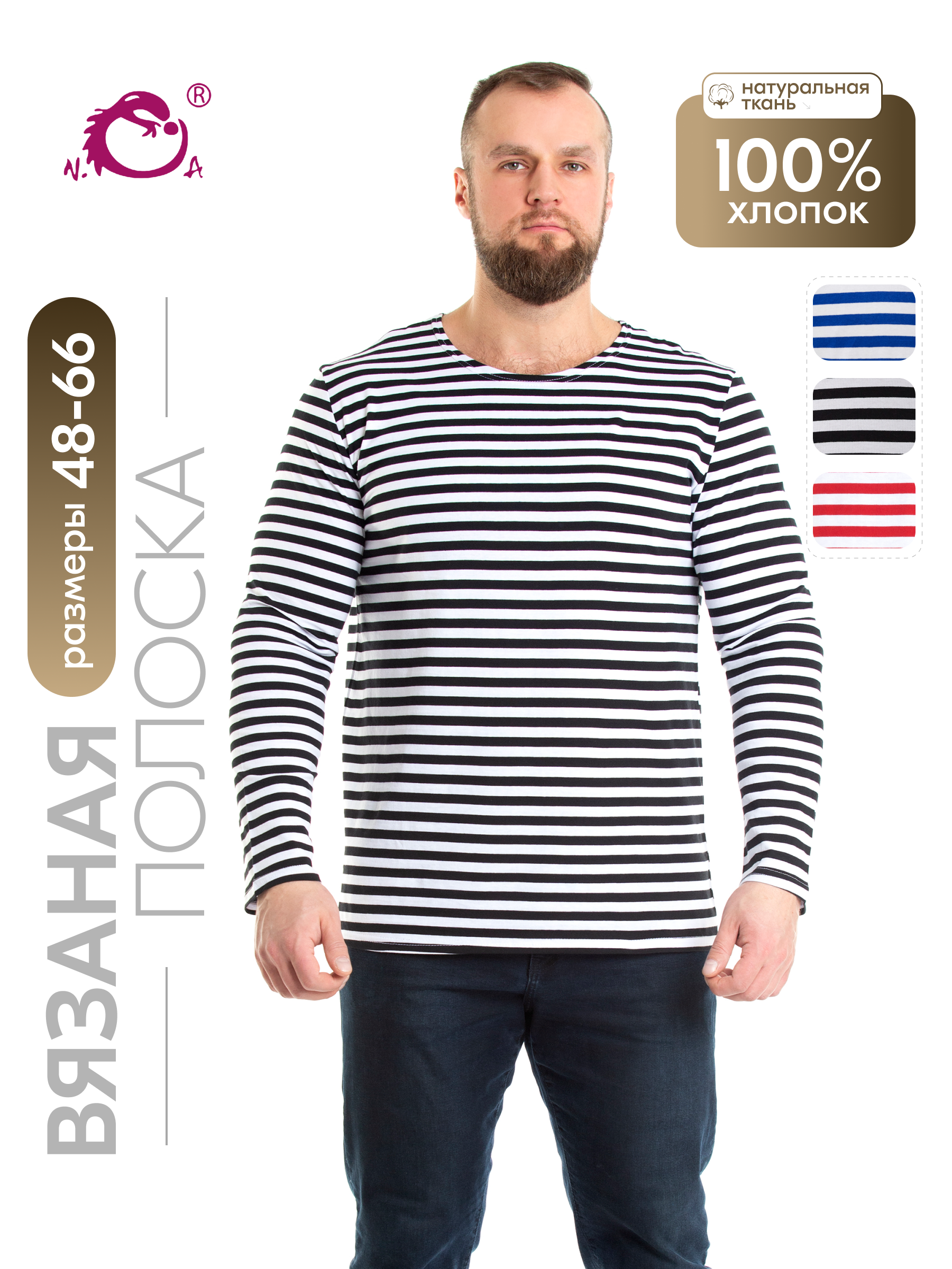 Тельняшка мужская в черную полоску - изготовлена из трикотажного кулирного полотна. Полоска - вывязанная, а не печатная, а это значит, что рисунок не будет стираться. Тельняшка станет вашей любимой частью гардероба. Лонгслив домашний идеально подходит для повседневного образа. Он отлично смотрится как с джинсами, так и с трико. Легкая ткань позволяет коже дышать, обеспечивая комфорт в любое время года. Хлопковый мужской лонгслив - незаменимая базовая вещь в гардеробе, для охотника и любителя рыбалки – одежда для настоящих мужчин. Такой хлопковый свитшот можно использовать, как нательное белье. Лонгслив в полоску можно носить под свитер или любую другую одежду, либо как отдельный предмет гардероба. Такая одежда для мужчин уместна в самых разных ситуациях: для занятий спортом и спортивных тренировок на свежем воздухе. Хороша эта вещь в путешествиях, а также на отдыхе. Кофта трикотажная с полосатым принтом всегда признанный и популярный товар у мужчин. Этот лонг белый с черными полосками станет универсальным реш