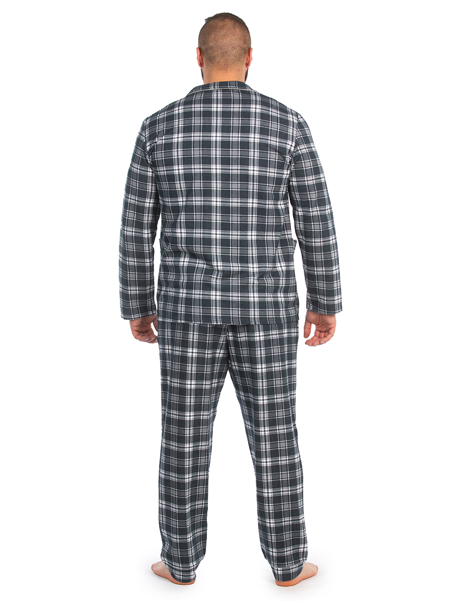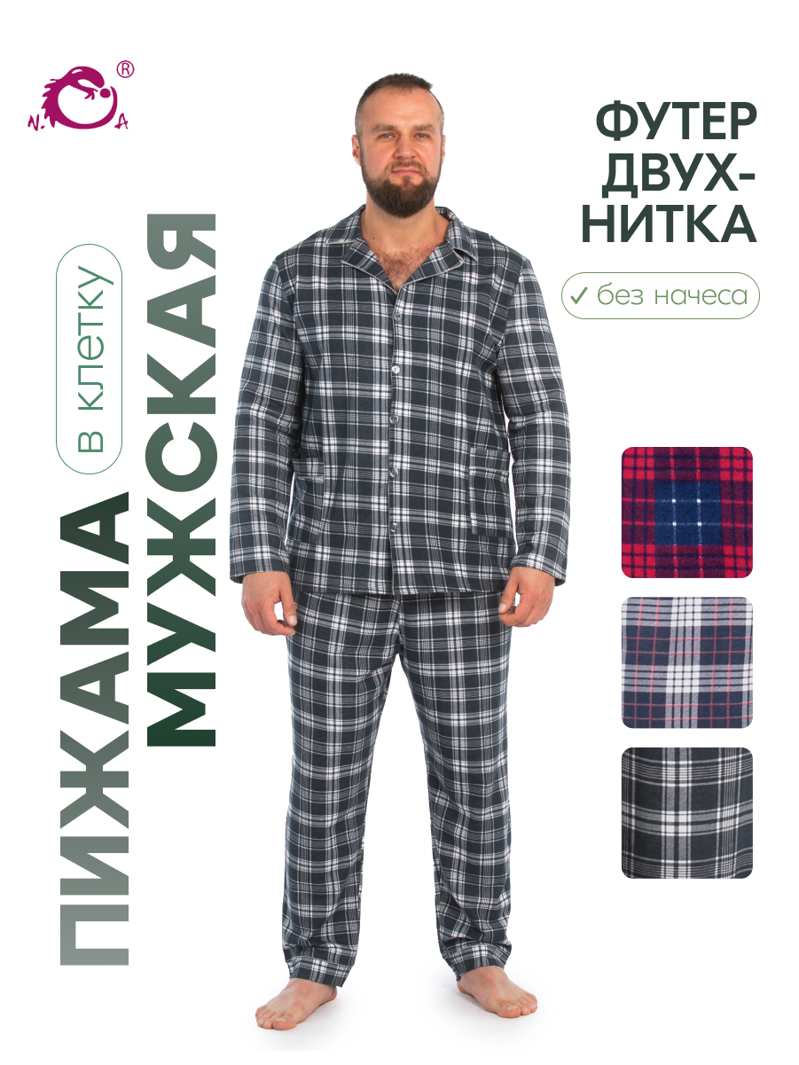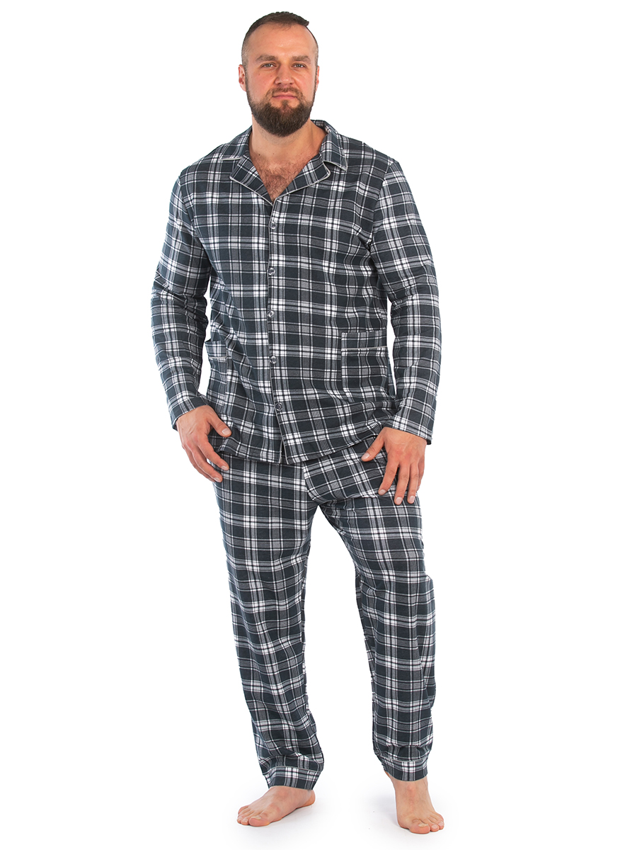 Мужская пижама со штанами — это трикотажный домашний пижамный комплект, состоящий из рубашки с длинными рукавами и свободных брюк. Рубашка застегивается на пуговицы, имеет красивый отложной воротник, по бокам накладные глубокие карманы. Прямые брюки свободного кроя, с удобной посадкой. Комплект изготовлен хлопка (футер без начеса) с добавлением полиэстера. Пижама мужская со штанами с длинным рукавом из хлопковой ткани не садиться, не линяет и не вытягивается. В летнюю погоду в таком костюме не жарко, а зимой он сохраняет тепло и уют. Ночная пижама не стесняет движений, ткань мягкая, приятная к телу. Пижамный брючный костюм двойка может служить комплектом для дома и отдыха, пижамой, нарядом для пижамной вечеринки, а также незаменимы в сложных жизненных ситуациях, как одежда для больницы. Благодаря натуральному составу ткани в нем будет комфортно и удобно провести весь день, а ночью костюм станет гарантией спокойного и крепкого сна. Классическая пижама с рубашкой и брюками идеально подойдет как для мужчин, так